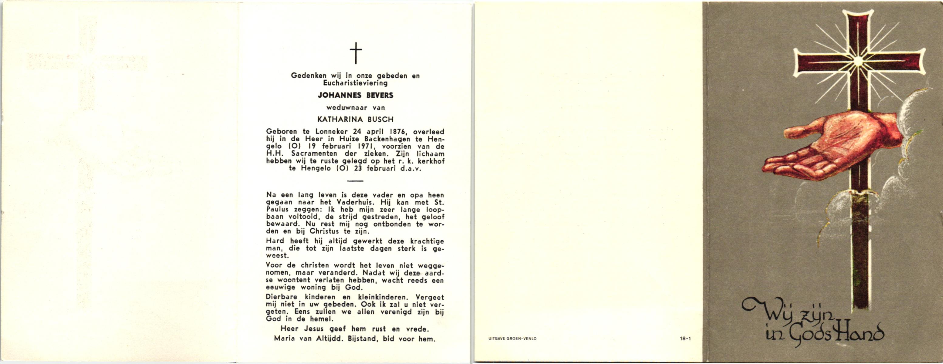 BEVERS, , Johannes, geboren op 24-04-1876 te Lonneker, overleden op 19-2-1971 te Hengelo (O) op 94-jarige leeftijd, begraven op 23-2-1971 te Hengelo.