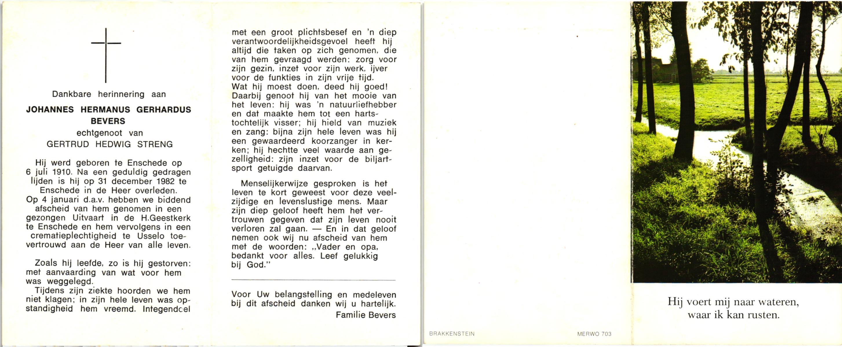 BEVERS, , Johannes Hermanus Gerhardus, geboren op 6-7-1910 te Enschede, overleden op 31-12-1982 te Enschede op 72-jarige leeftijd, gecremeerd op 4-1-1983 te Usselo.