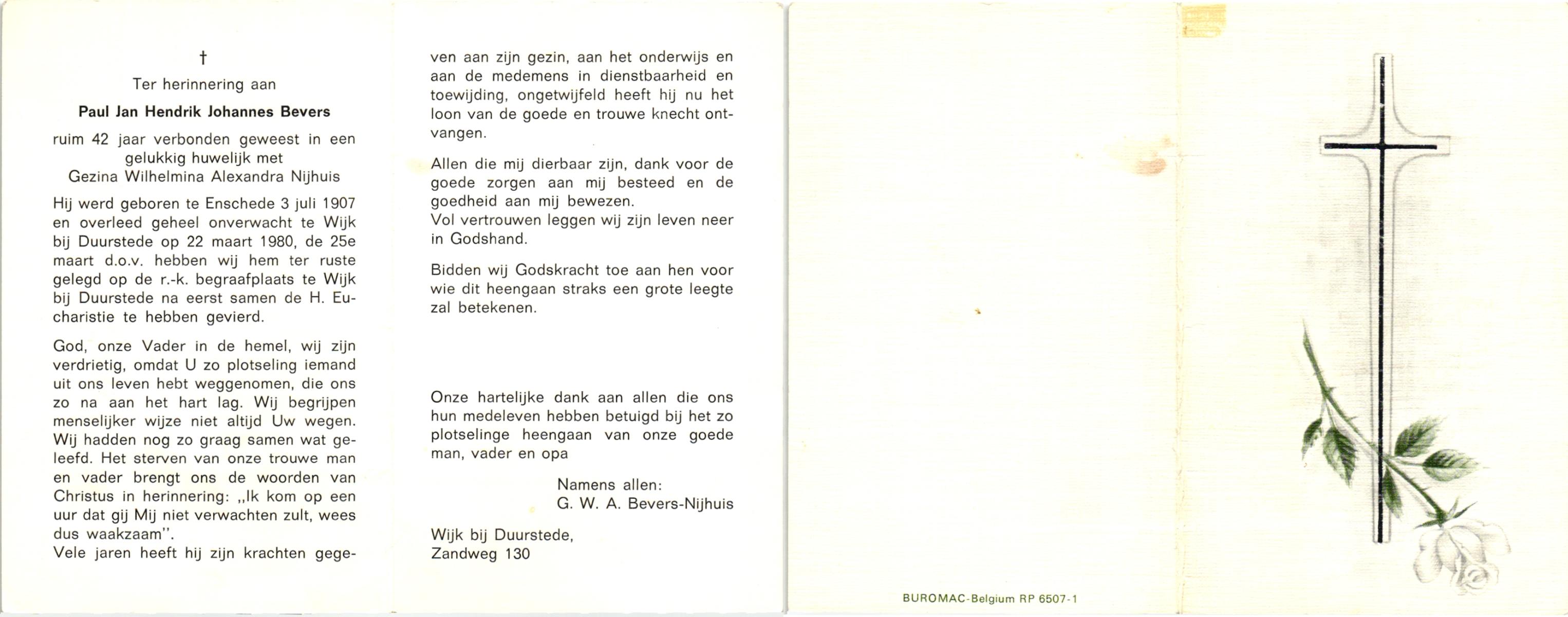 BEVERS, , Paul Jan Hendrik Johannes, geboren op 3-7-1907 te Enschede, overleden op 22-3-1980 te Duurstede op 72-jarige leeftijd, begraven op 25-3-1980 te Duurstede.