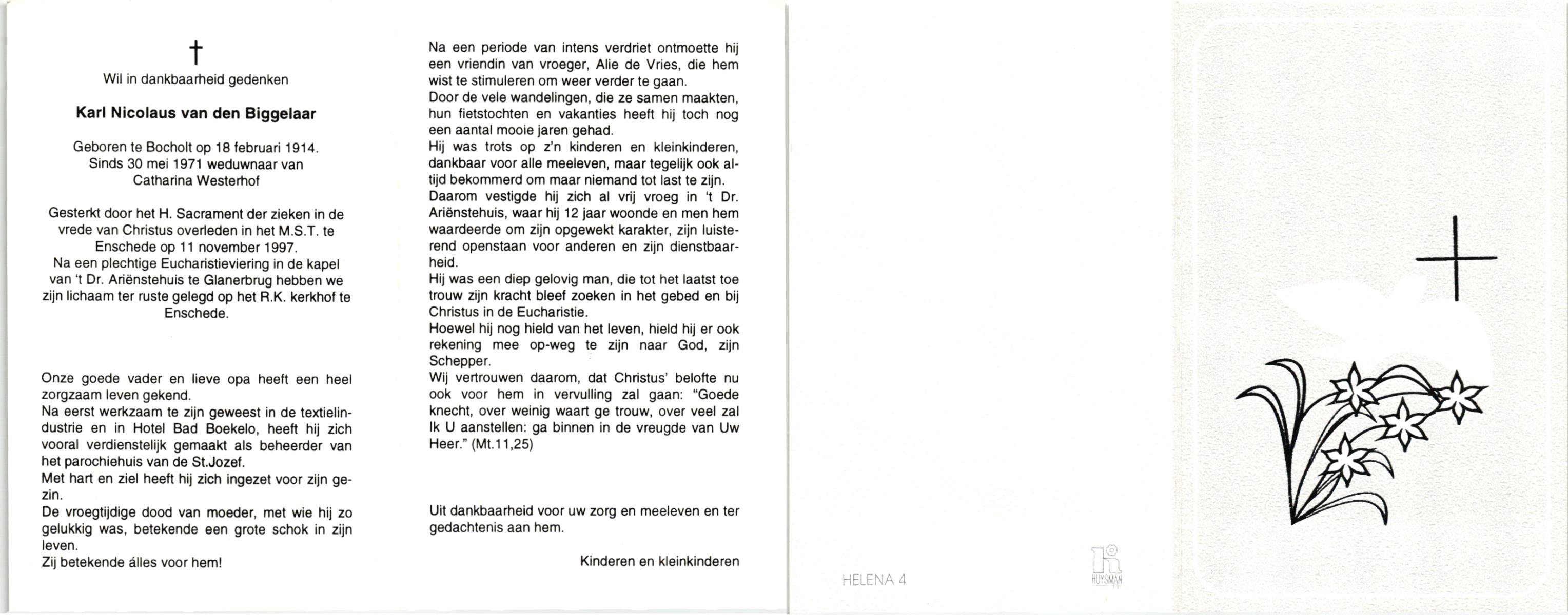 BIGGELAAR, van, Karl Nicolaus, geboren op 18-2-1914 te Bocholt, Dld, overleden op 11-11-1997 te Enschede op 83-jarige leeftijd, begraven te Enschede.