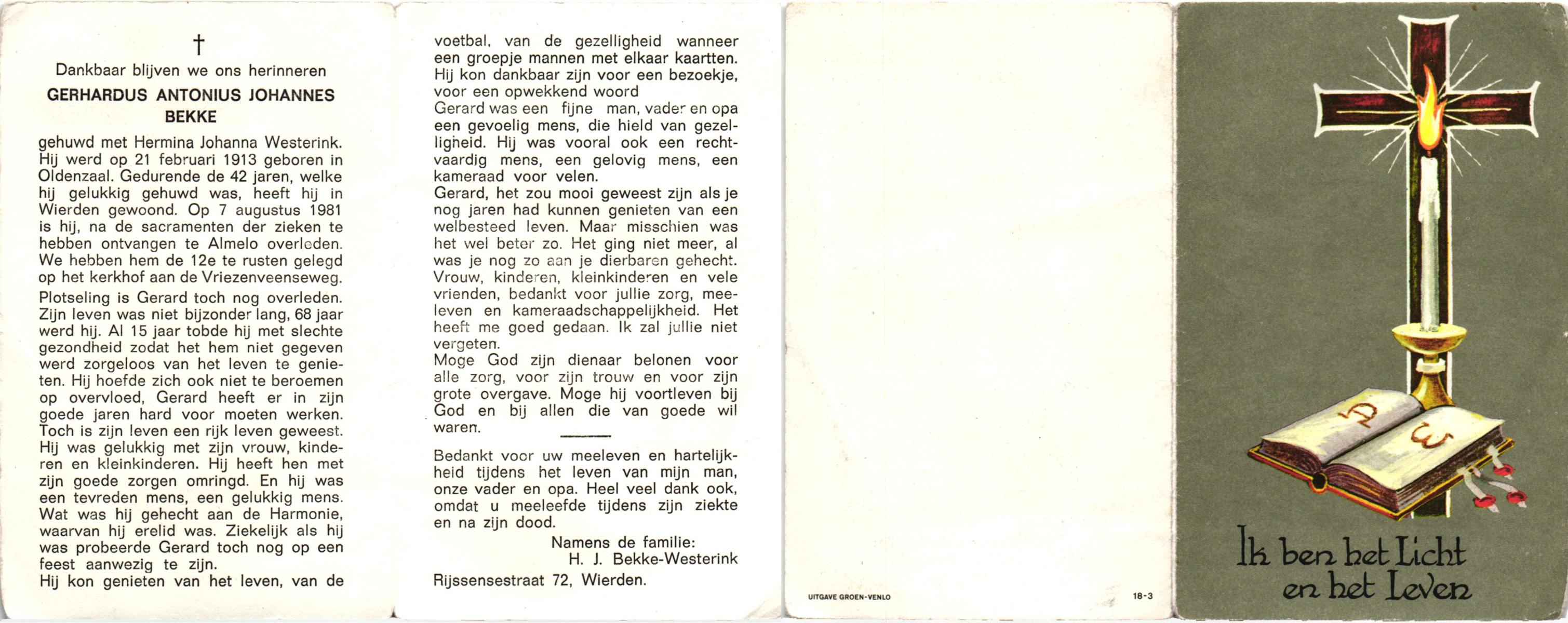 BEKKE, Gerhardus Antonius Johannes, geboren op 21-2-1913 te Oldenzaal, overleden op 7-8-1981 te Almelo op 68-jarige leeftijd, begraven op 12-8-1981 te Wierden.