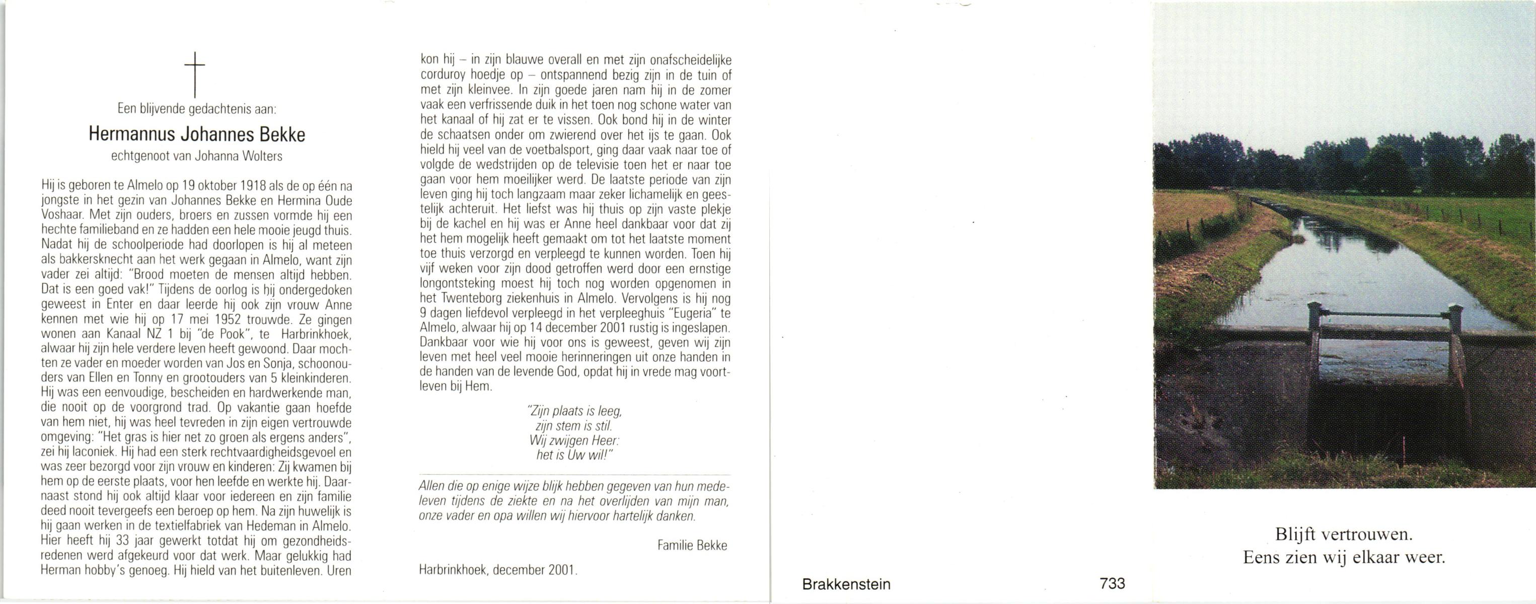 BEKKE, Hermannus Johannes, geboren op 19-10-1918 te Almelo, overleden op 14-12-2001 te Almelo op 83-jarige leeftijd.