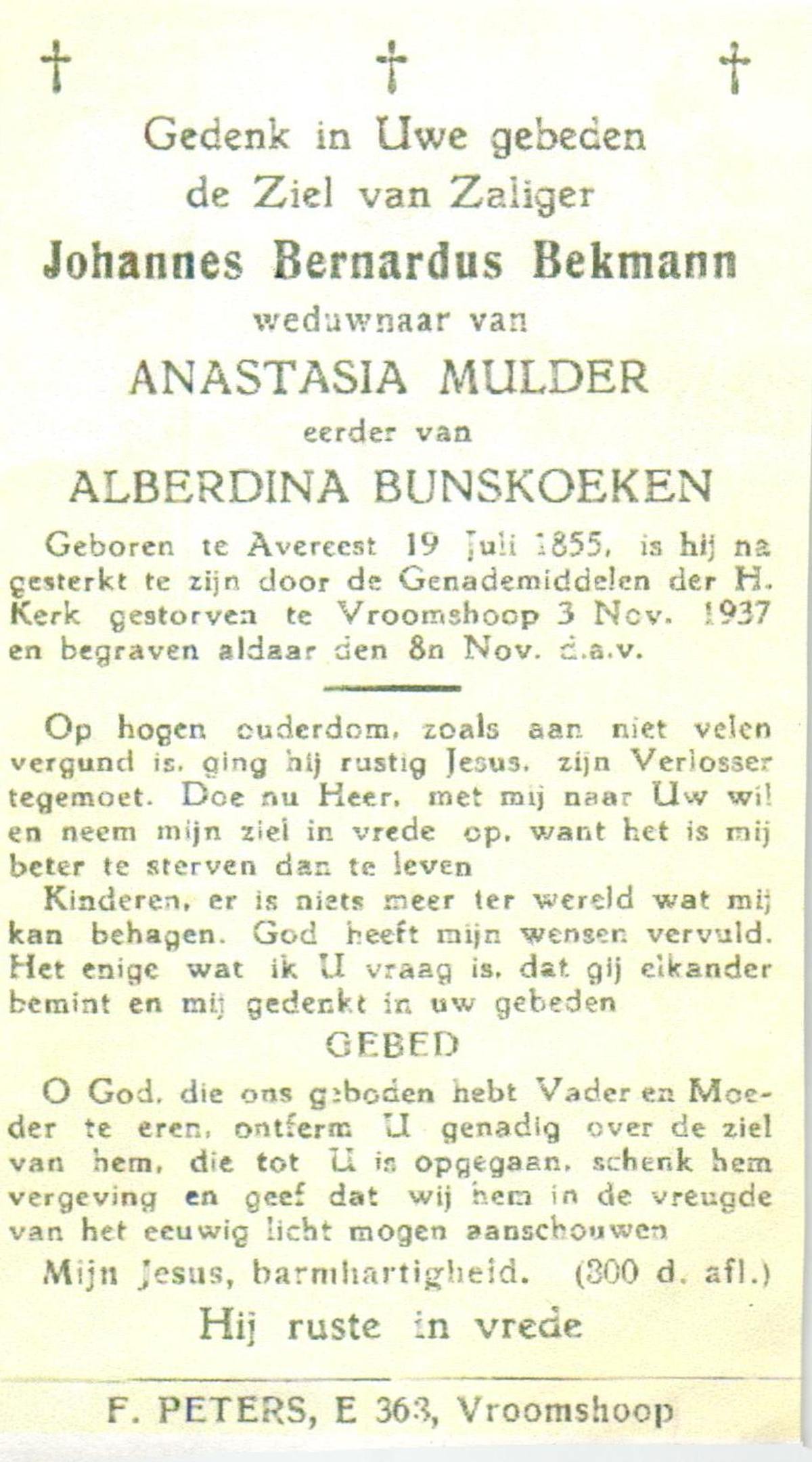 BEKMANN, Johannes Bernardus, geboren op 19-07-1855 te Avereest, overleden op 3-11-1937 te Vroomshoop op 82-jarige leeftijd.