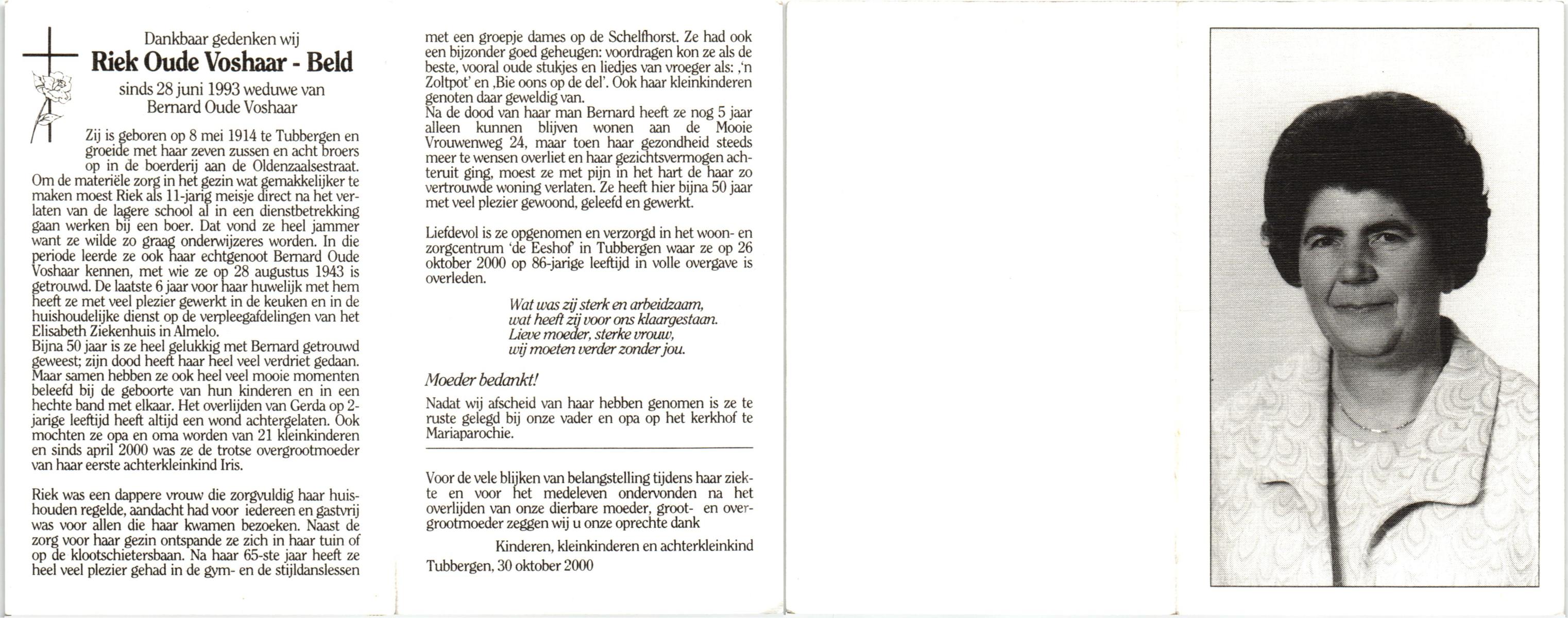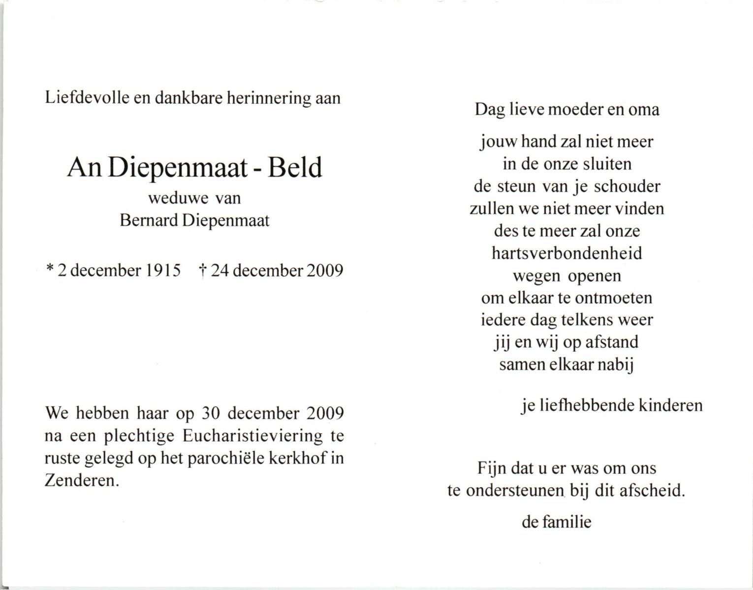BELD, An, geboren op 2-12-1915, overleden op 24-12-2009 op 94-jarige leeftijd, begraven op 30-12-2009 te Zenderen.