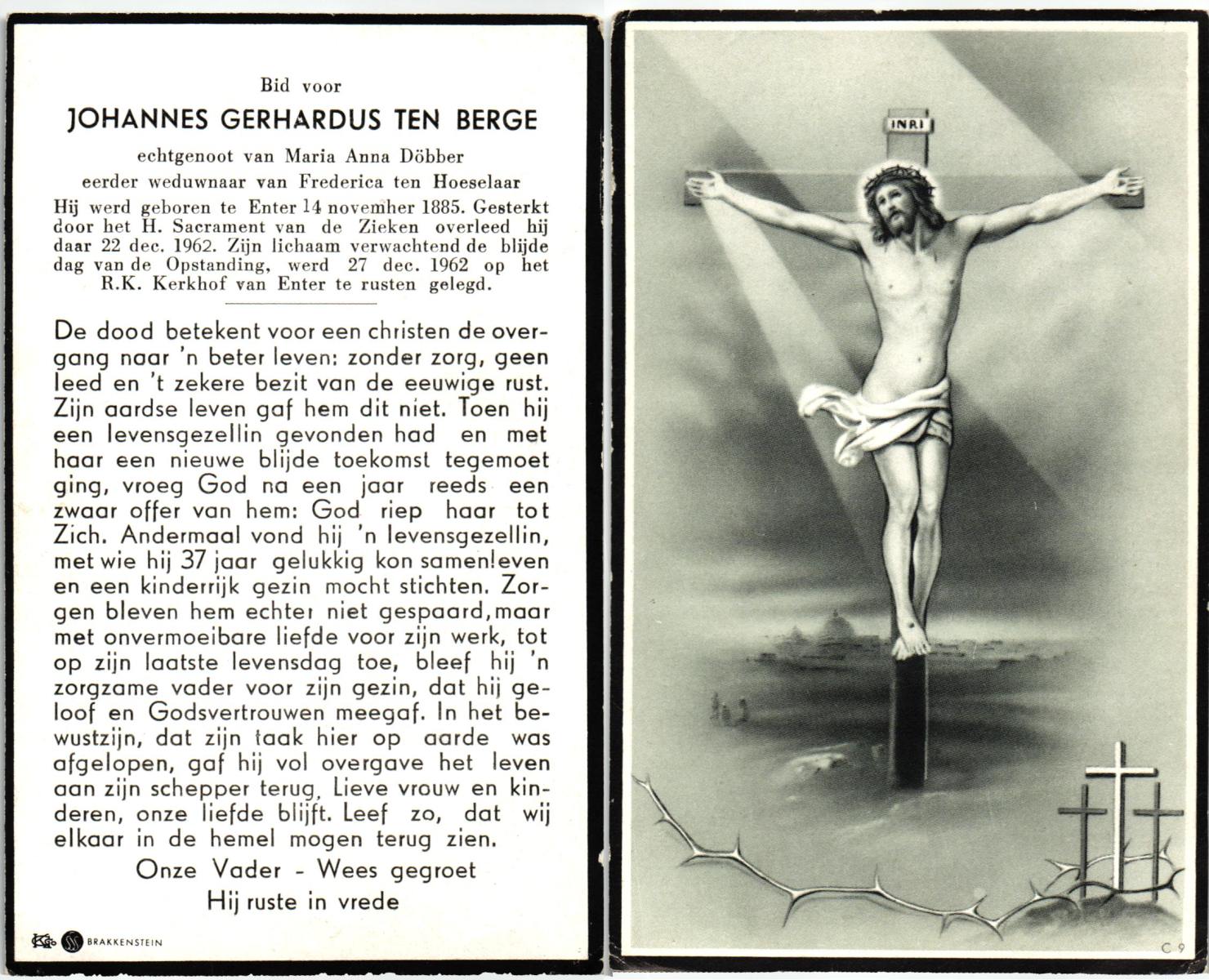 BEKKE, ter, Johannes Lambertus Marinus, geboren op 23-5-1910 te Oele, overleden op 24-12-1961 te Hengelo (Ov.) op 51-jarige leeftijd, begraven op 29-12-1961 te Delden.