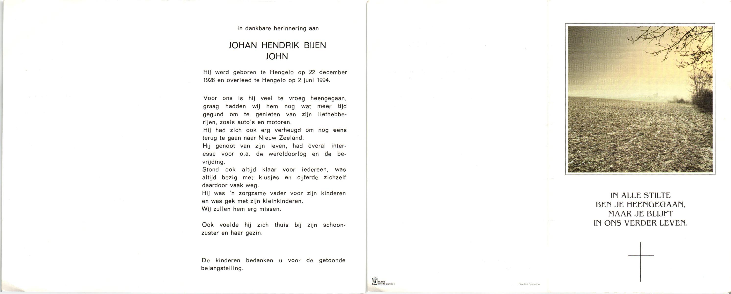 BIJEN, Johan Hendrik (John), geboren op 22-12-1928 te Hengelo, overleden op 2-6-1994 te Hengelo op 65-jarige leeftijd.