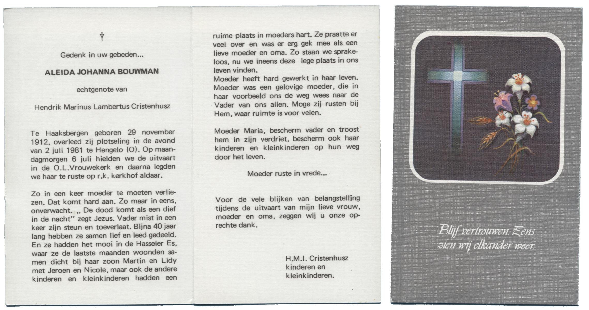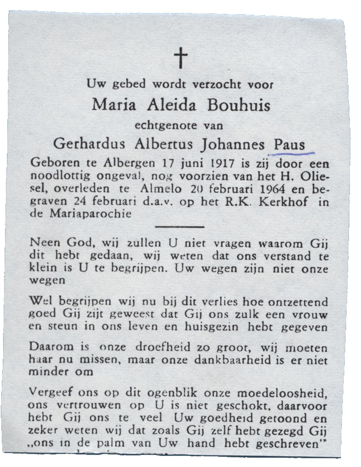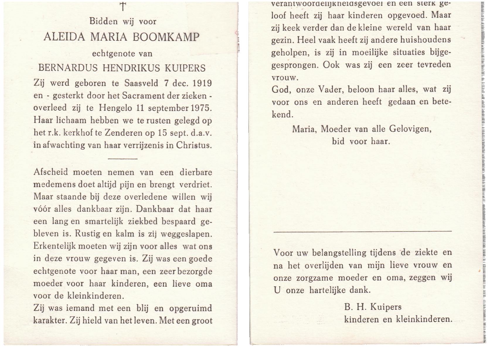 BOOMKAMP, Aleida Maria, geboren op 7-12-1919 te Saasveld, overleden op 11-9-1975 te Hengelo (Ov.) op 55-jarige leeftijd, begraven op 15-9-1975 te Zenderen.
