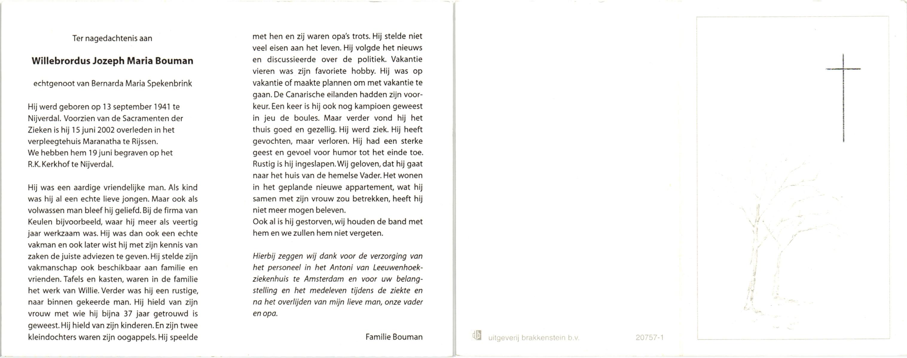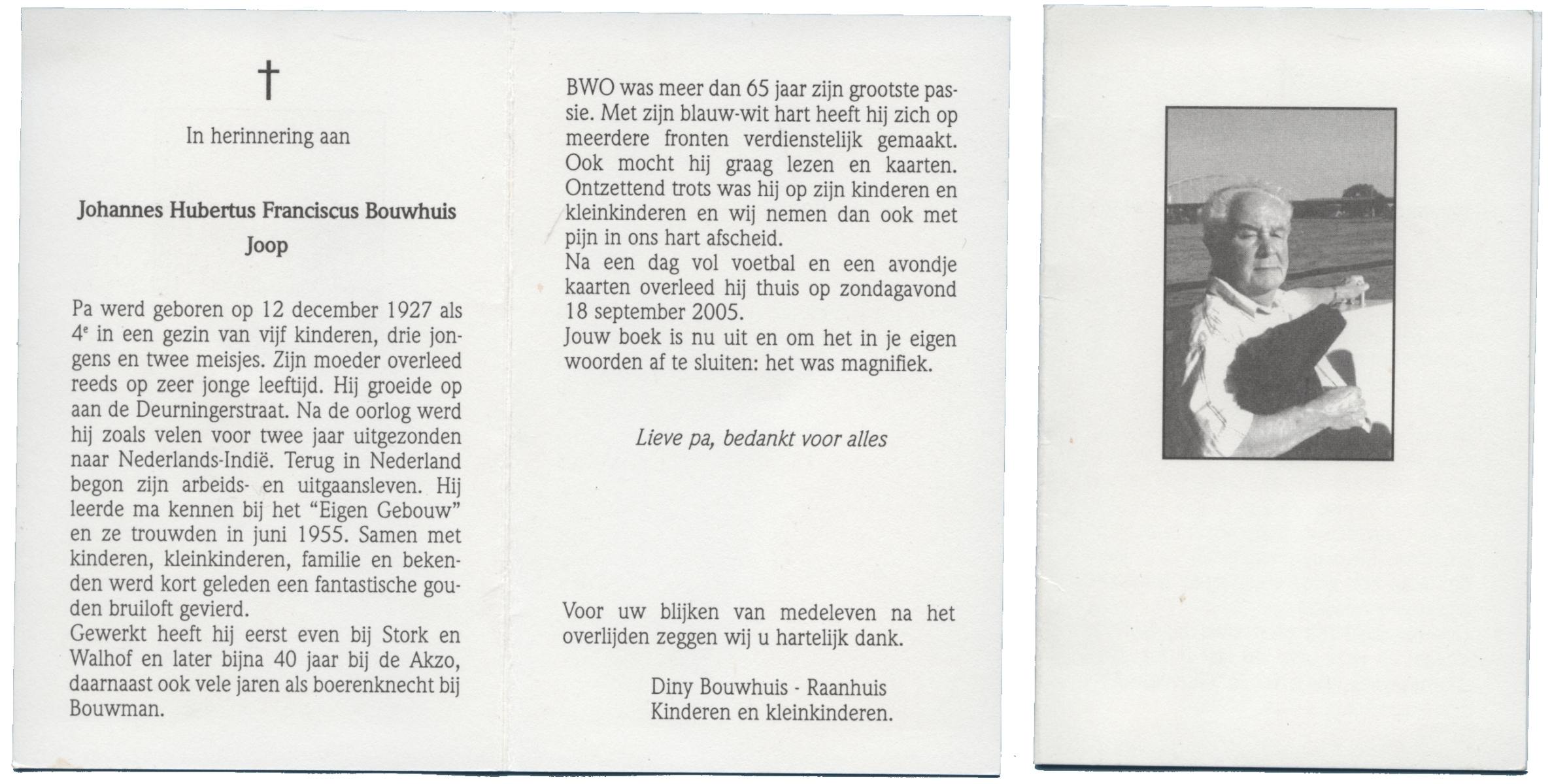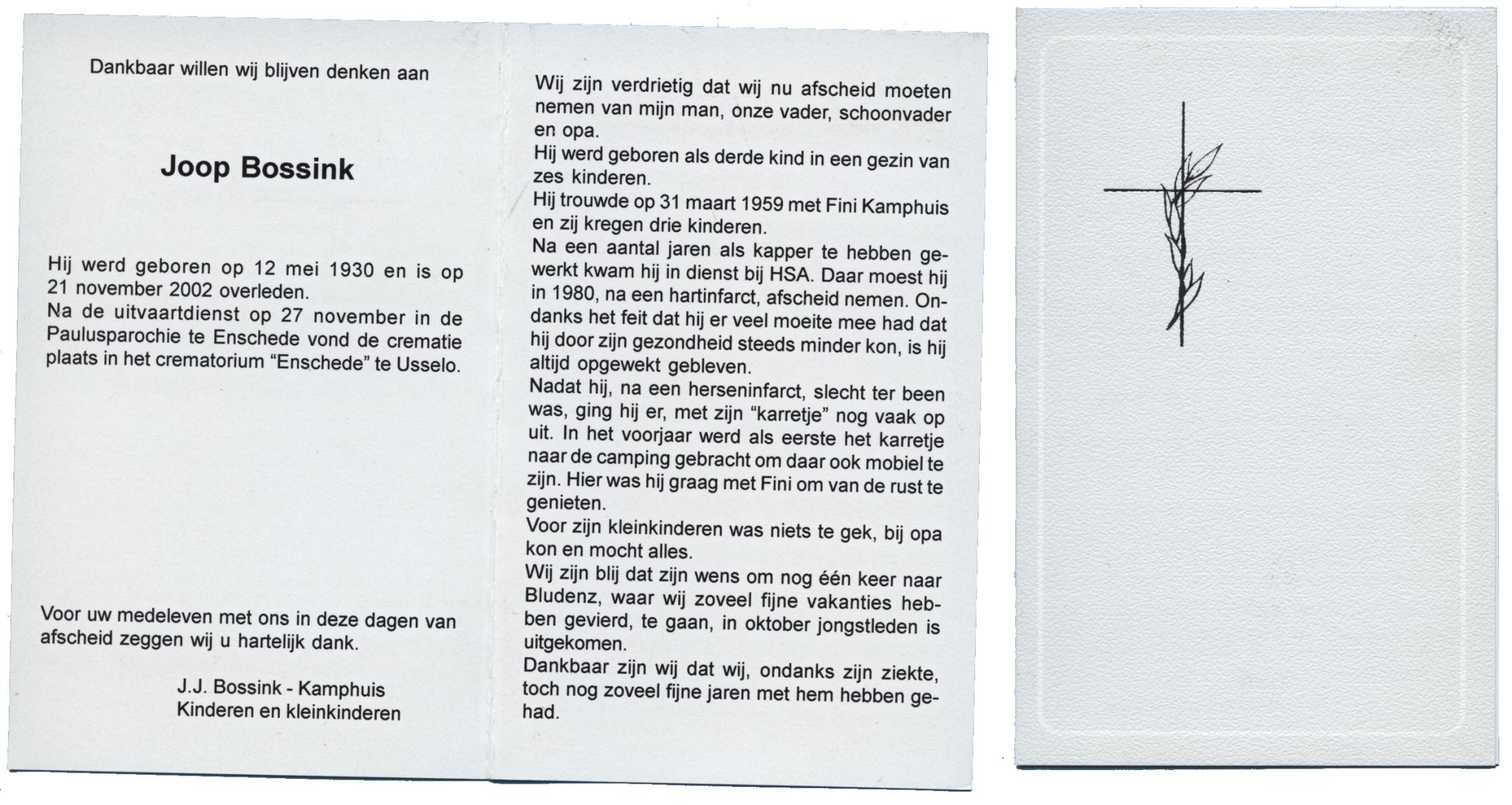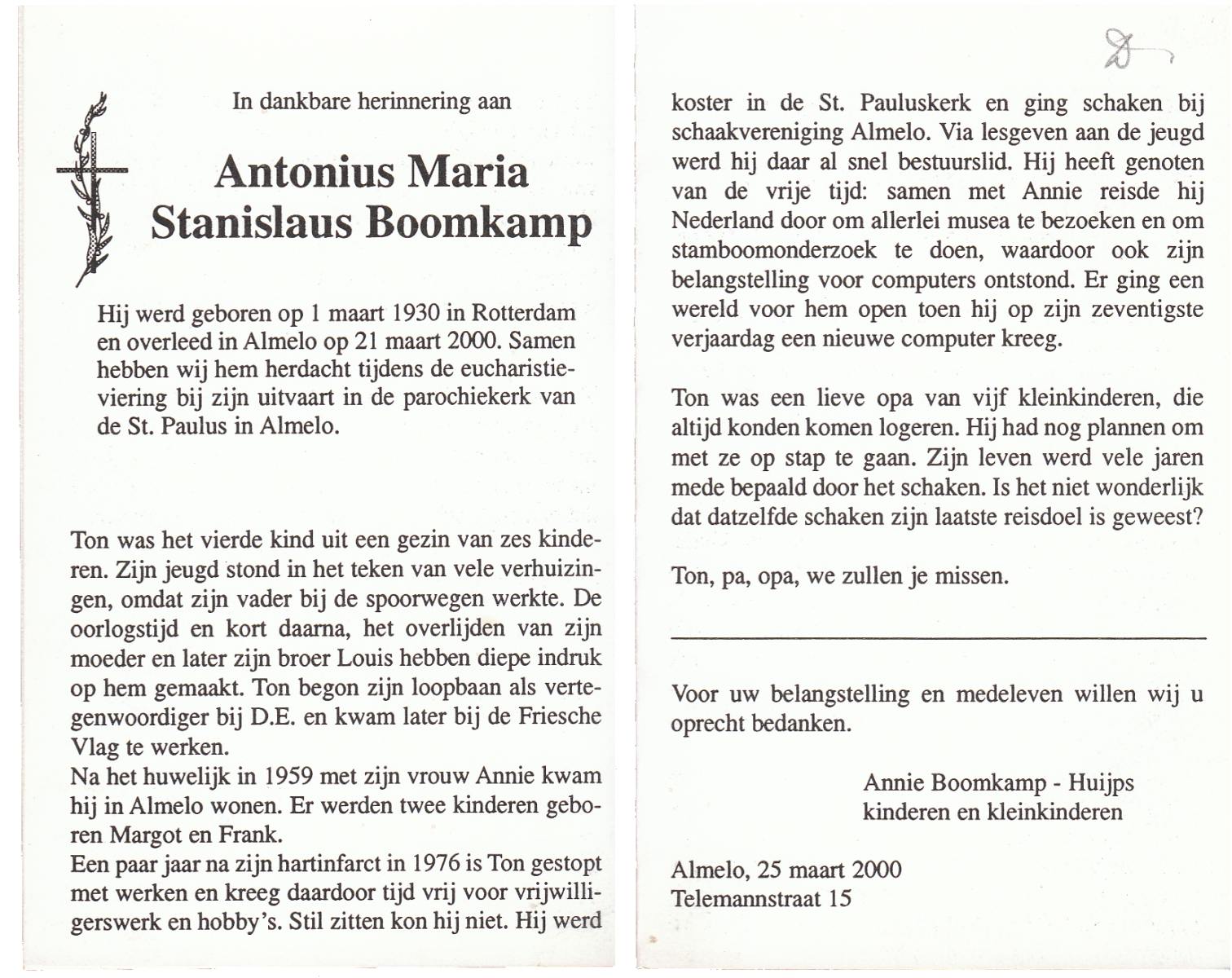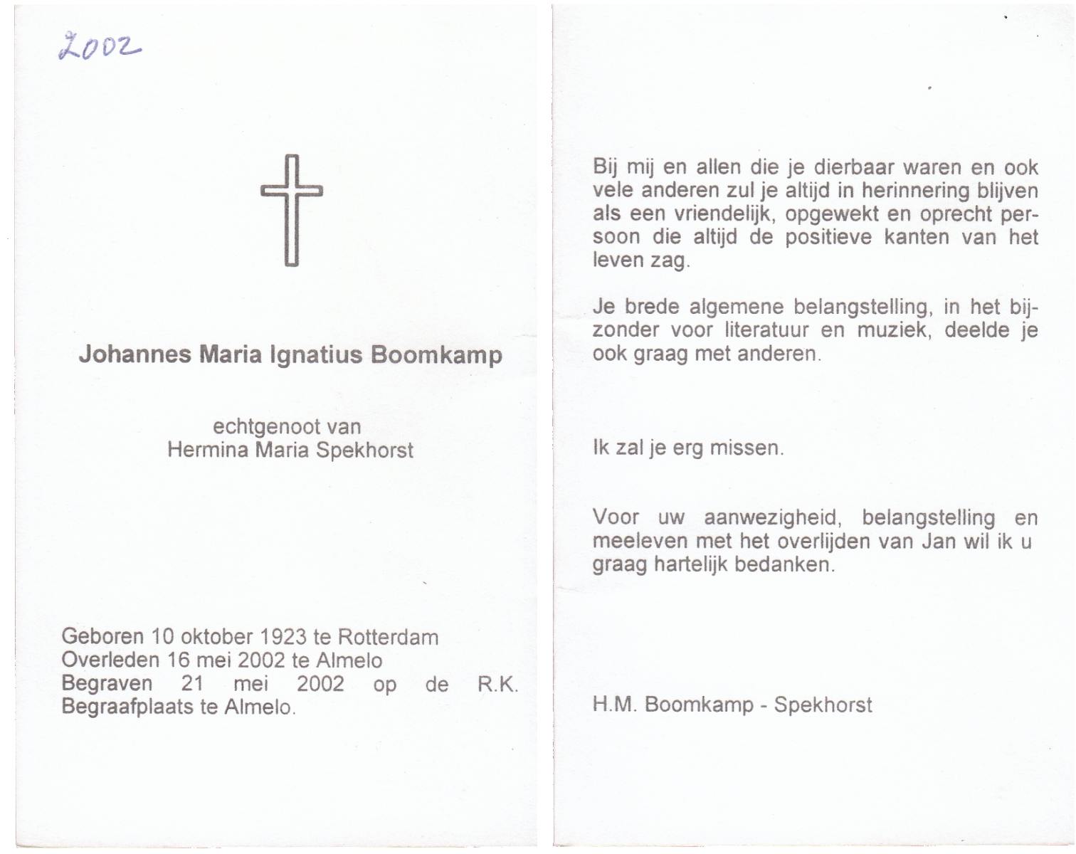BOOMKAMP, Johannes Maria Ignatius, geboren op 10-10-1923 te Rotterdam, overleden op 16-5-2002 te Almelo op 78-jarige leeftijd, begraven op 21-5-2002 te Almelo.