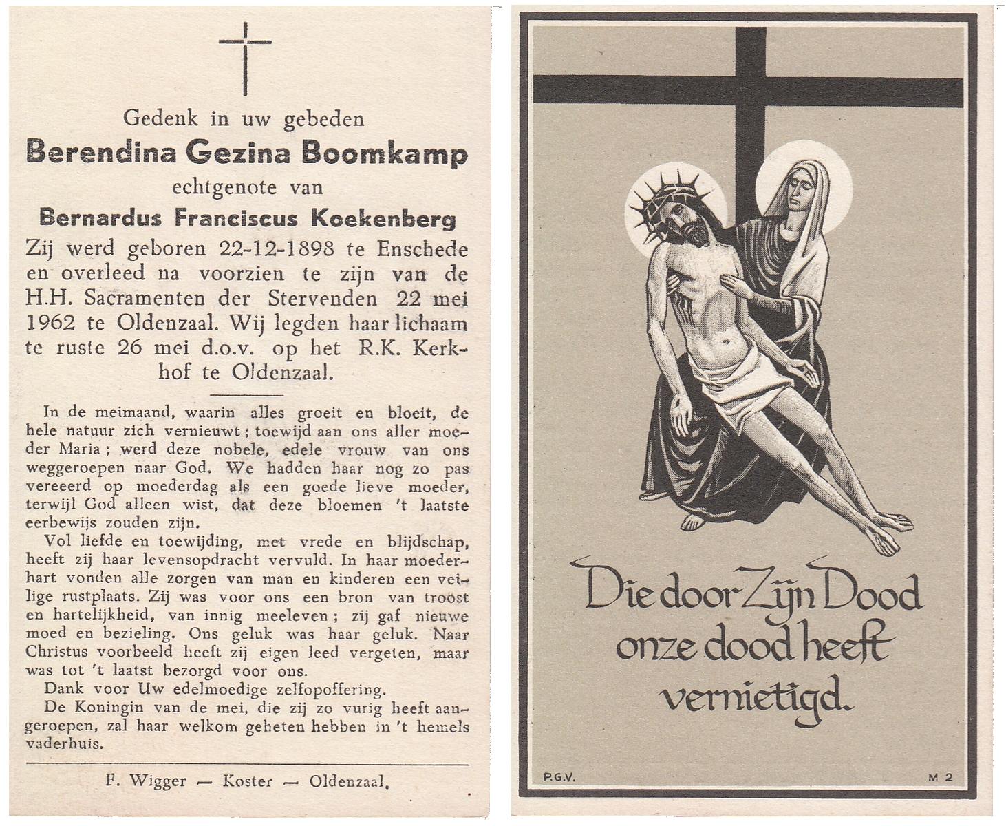 BOOMKAMP, Berendina Gezina, geboren op 22-12-1898 te Enschede, overleden op 22-5-1962 te Oldenzaal op 63-jarige leeftijd, begraven op 26-5-1962 te Oldenzaal R.K.kekrhof.