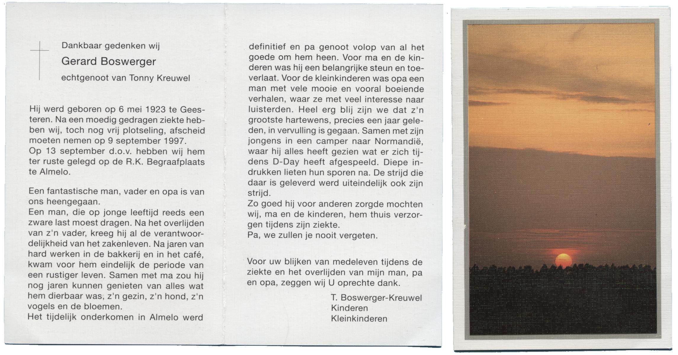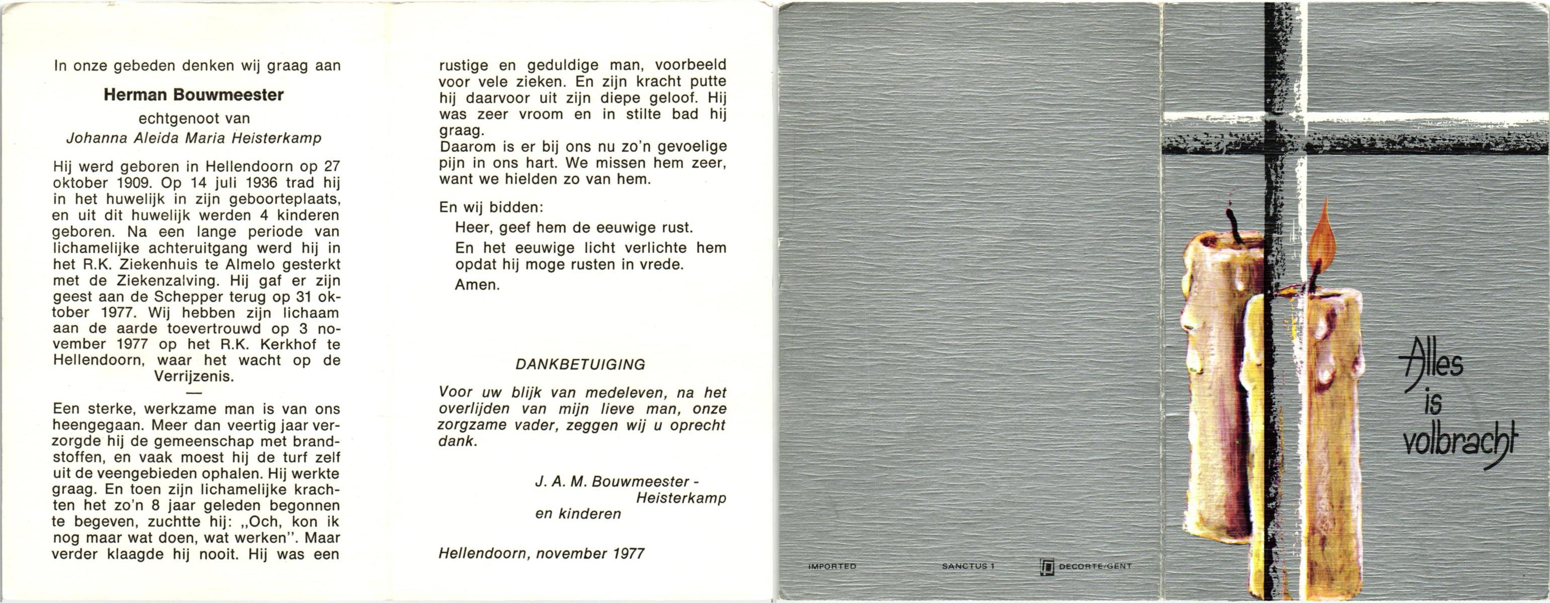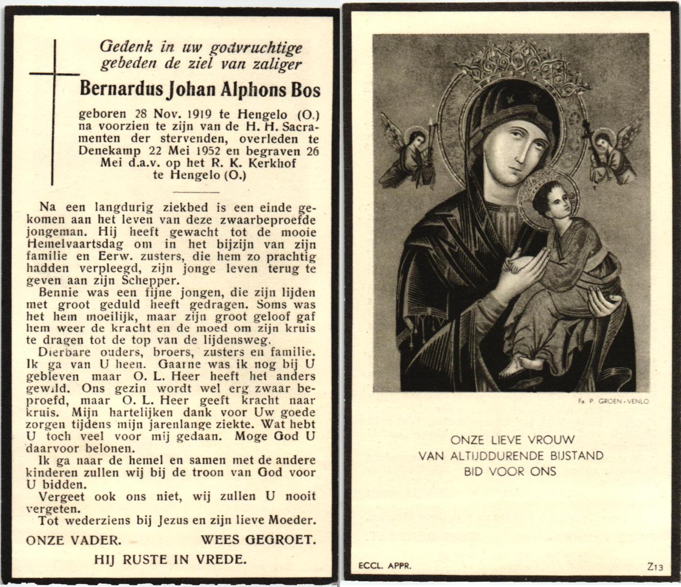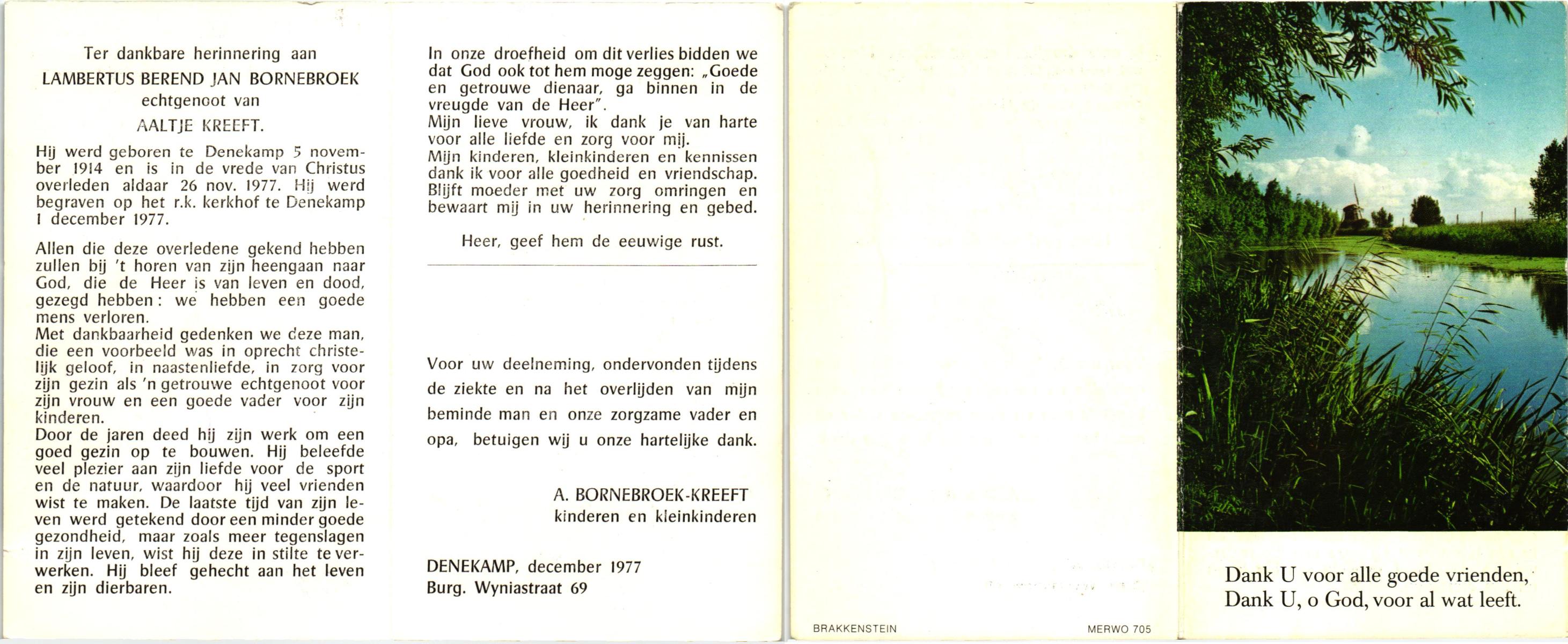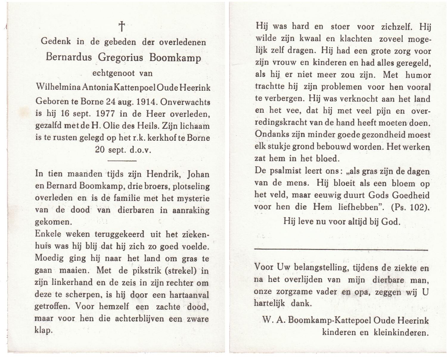 BOOMKAMP, Bernardus Gregorius, geboren op 24-8-1914 te Borne, overleden op 16-9-1977 op 63-jarige leeftijd, begraven op 20-9-1977 te Borne.