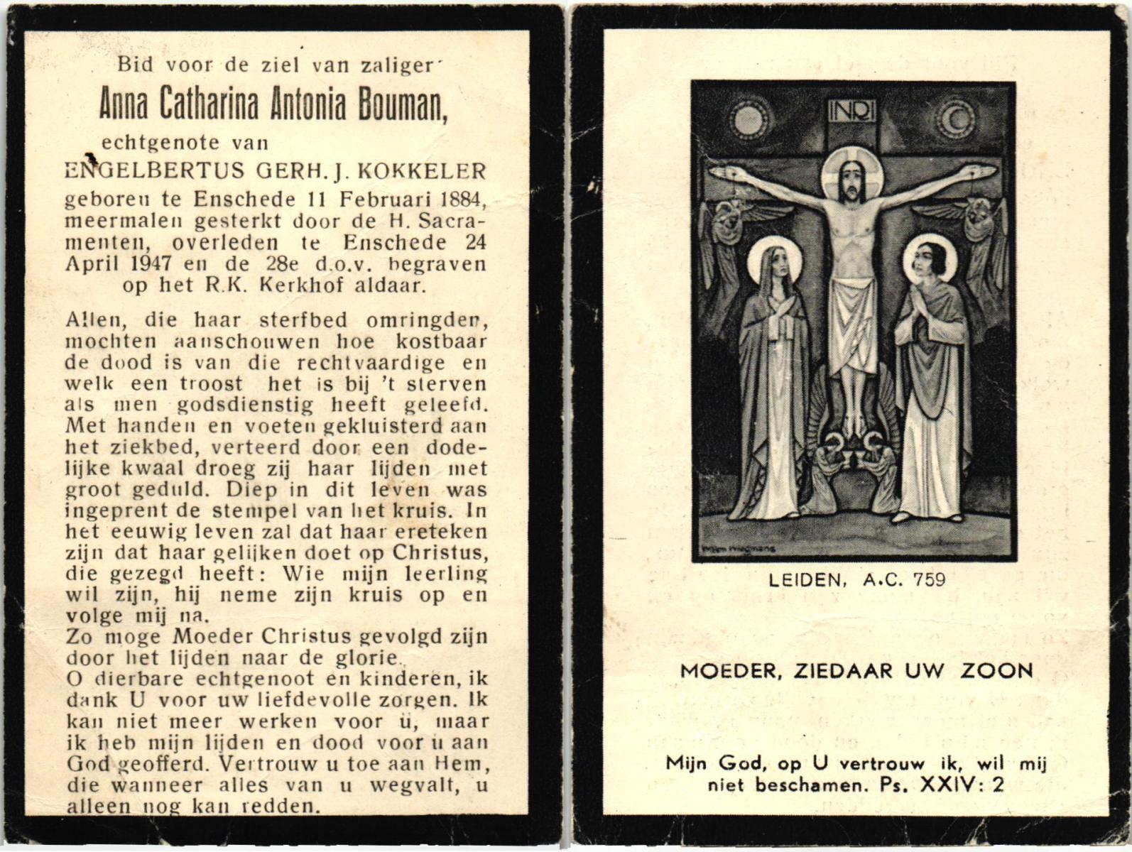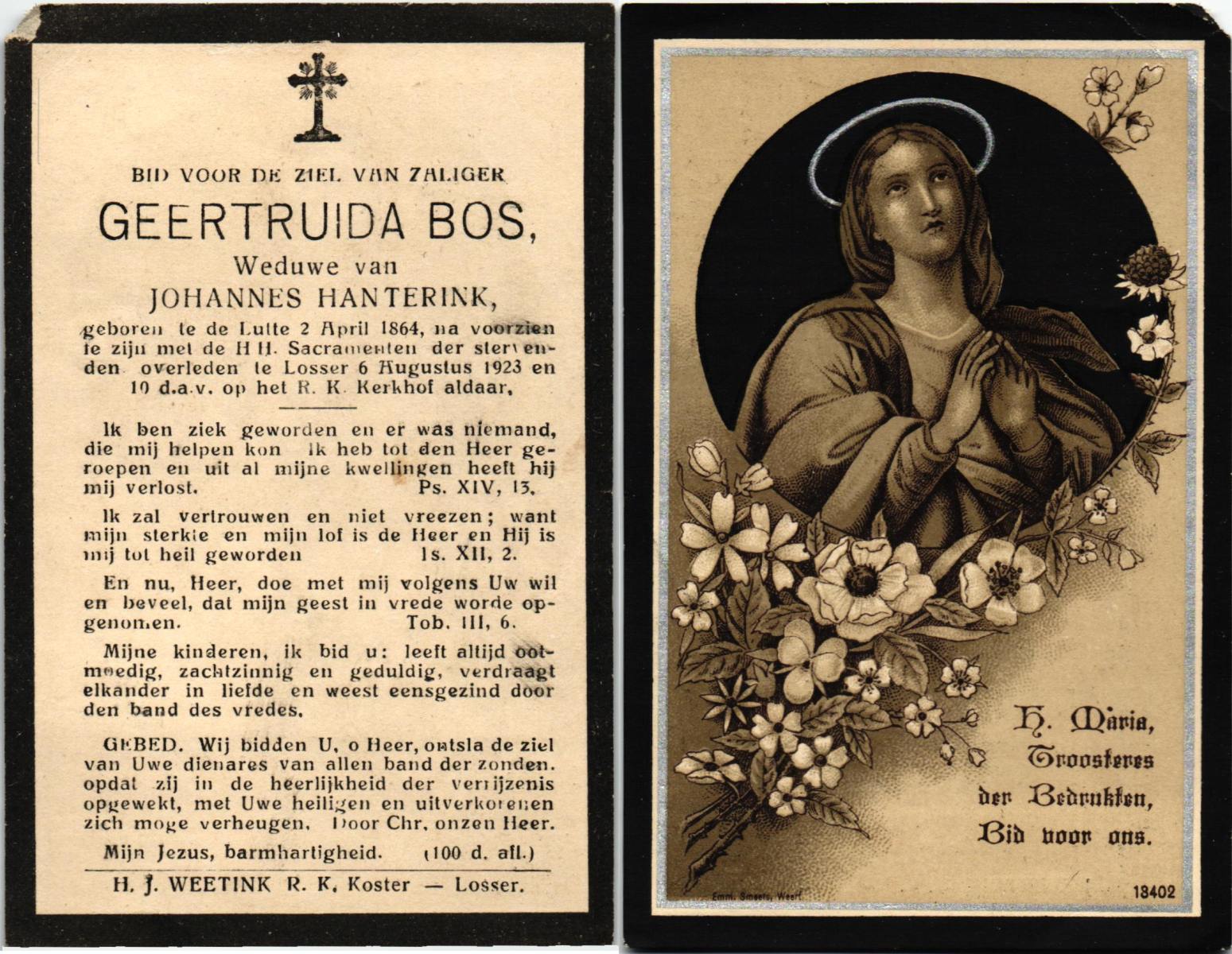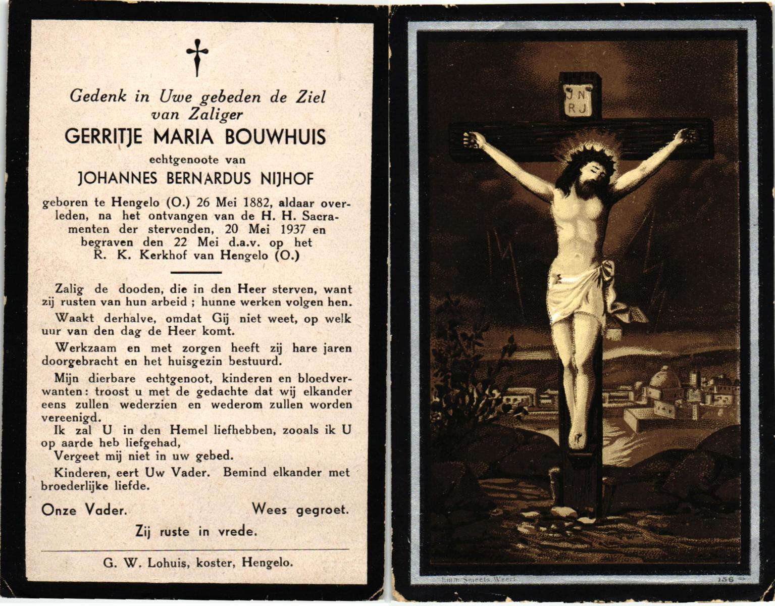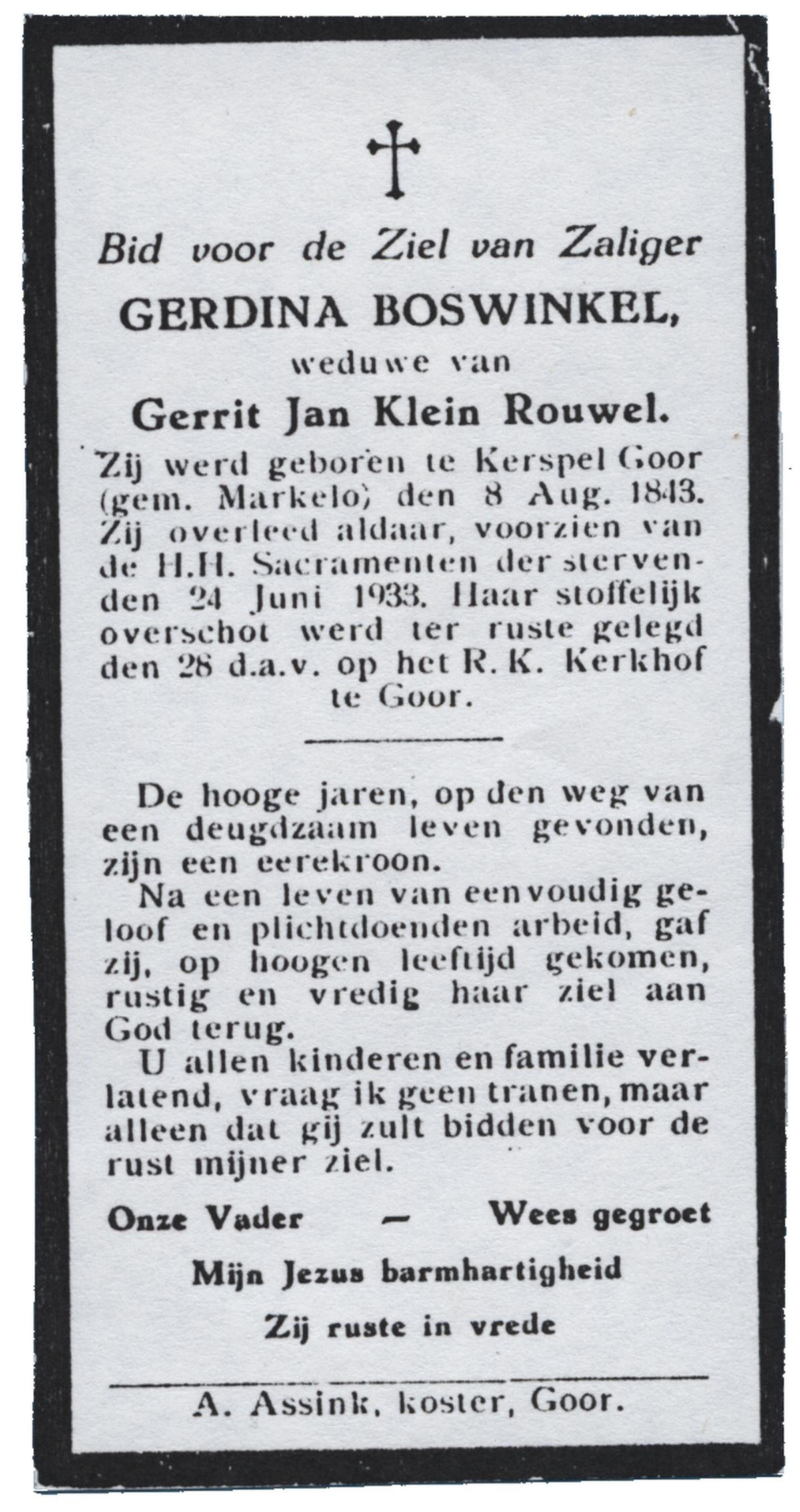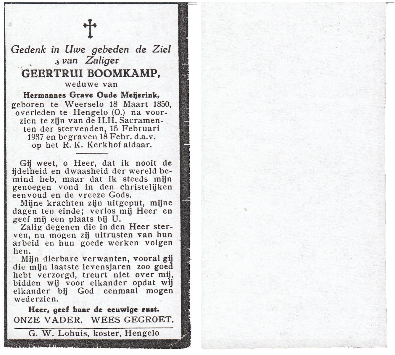 BOOMKAMP, Geertrui, geboren op 18-03-1850 te Weerselo, overleden op 15-2-1937 te Hengelo (Ov.) op 86-jarige leeftijd, begraven op 18-2-1937 te Hengelo (Ov.), RK-kerkhof.