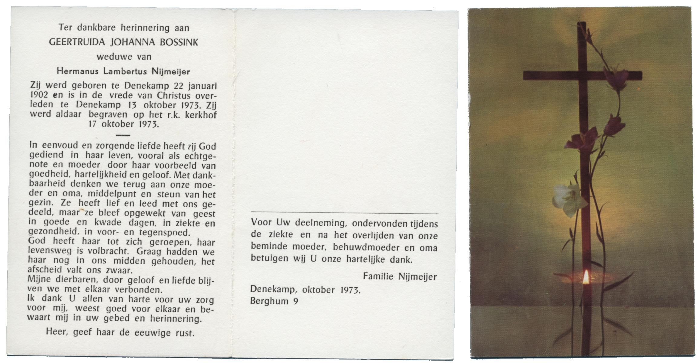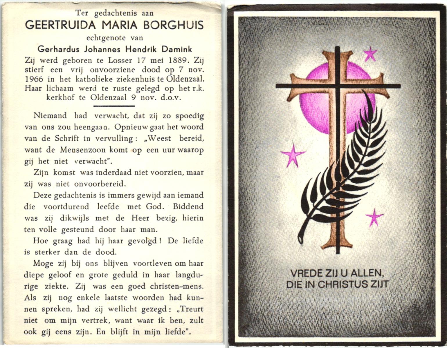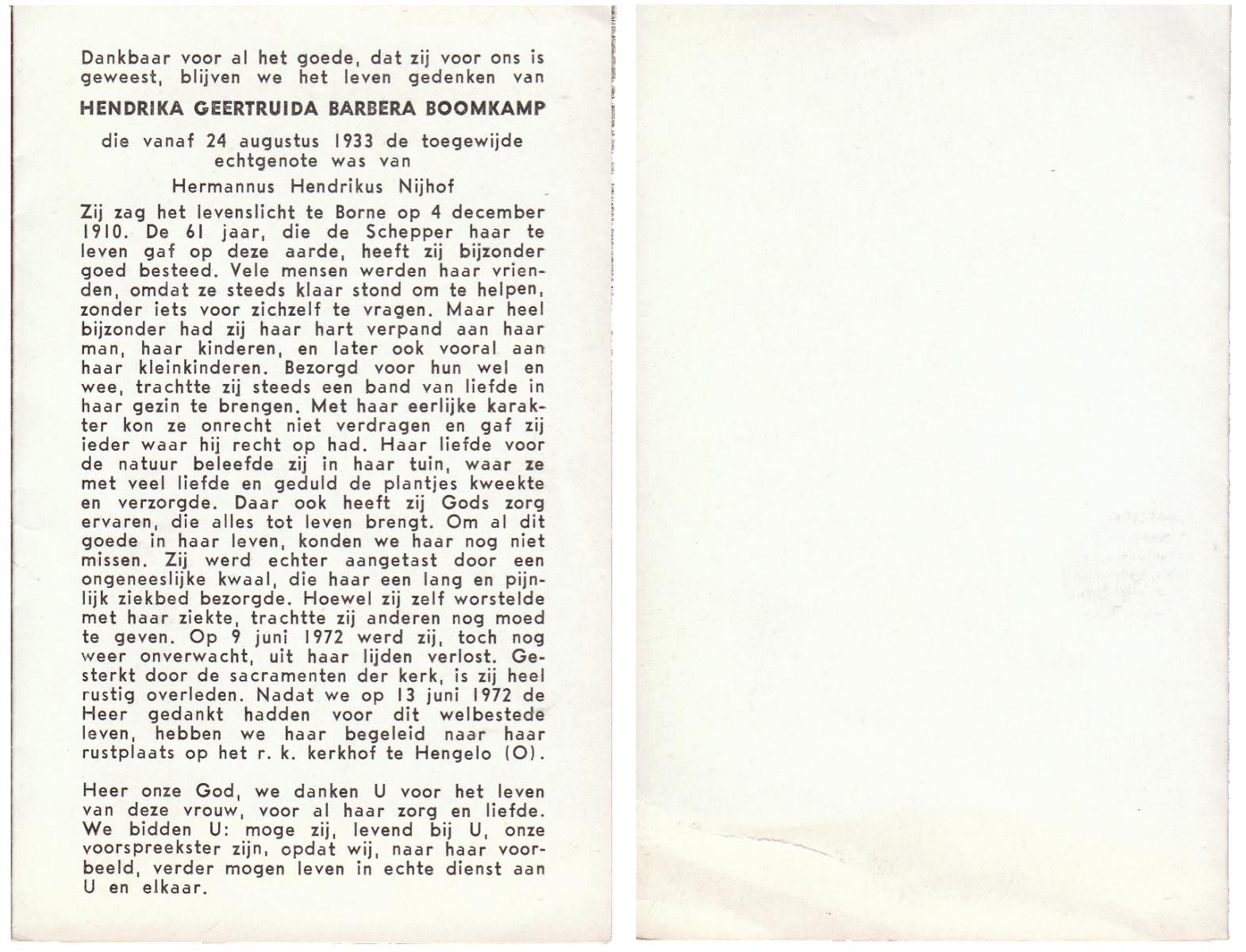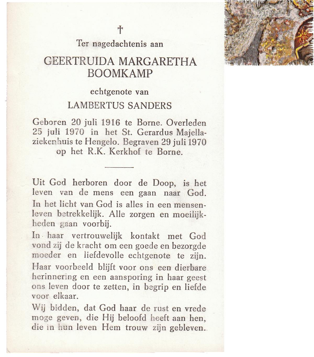 BOOMKAMP, Geertruida Margaretha, geboren op 20-7-1916 te Borne, overleden op 25-7-1970 te Hengelo (Ov.) op 54-jarige leeftijd, begraven op 29-7-1970 te Borne.