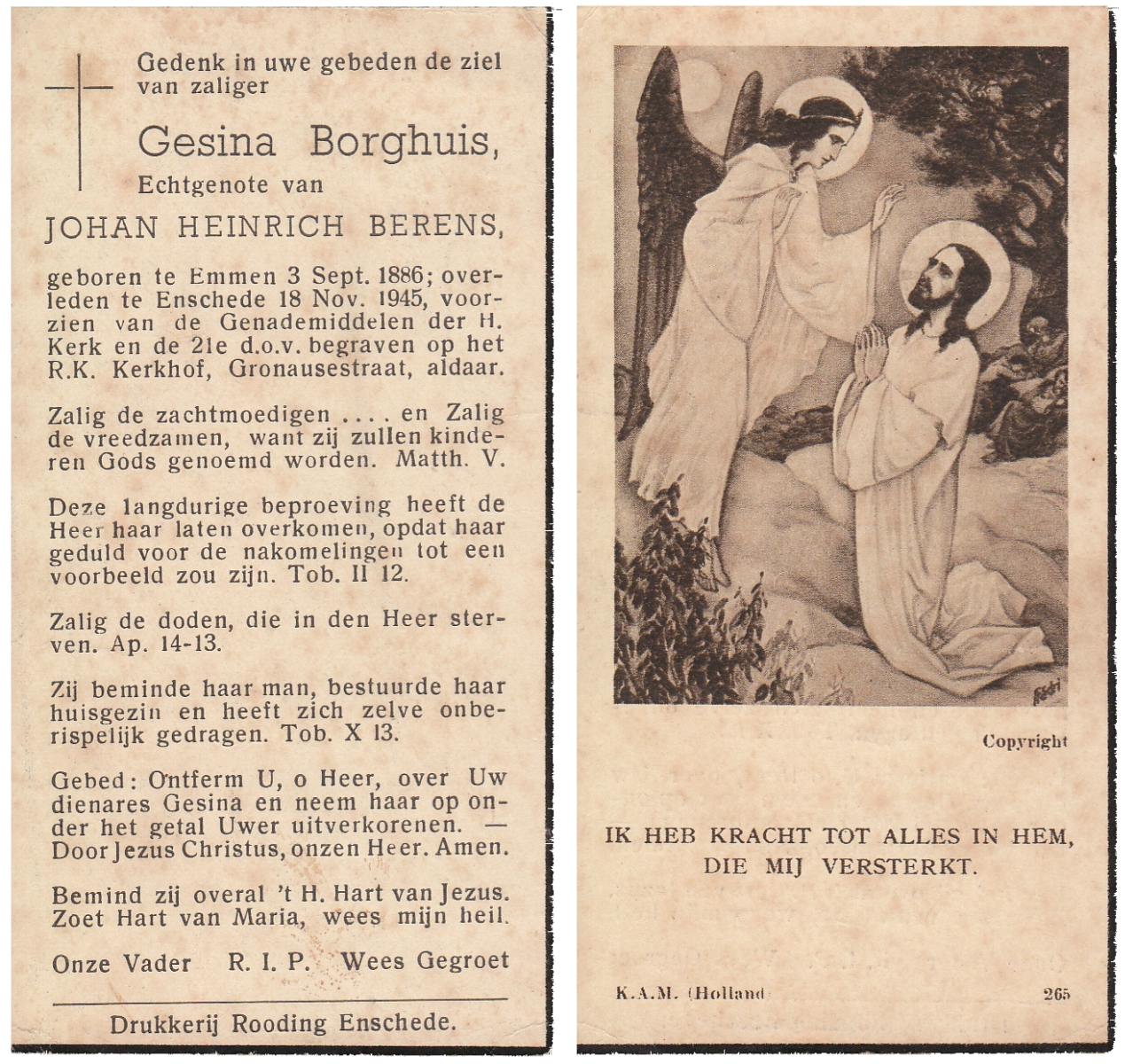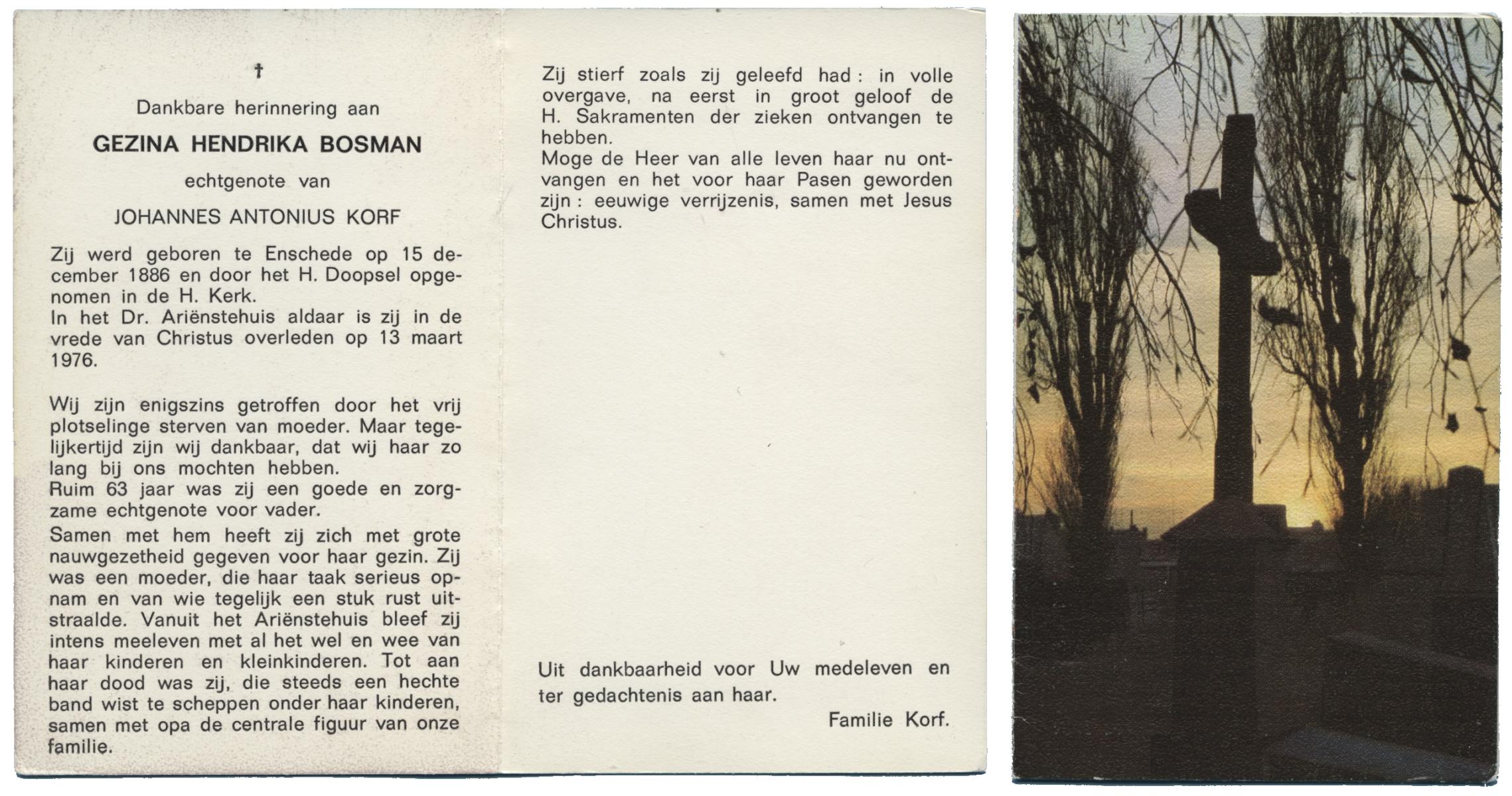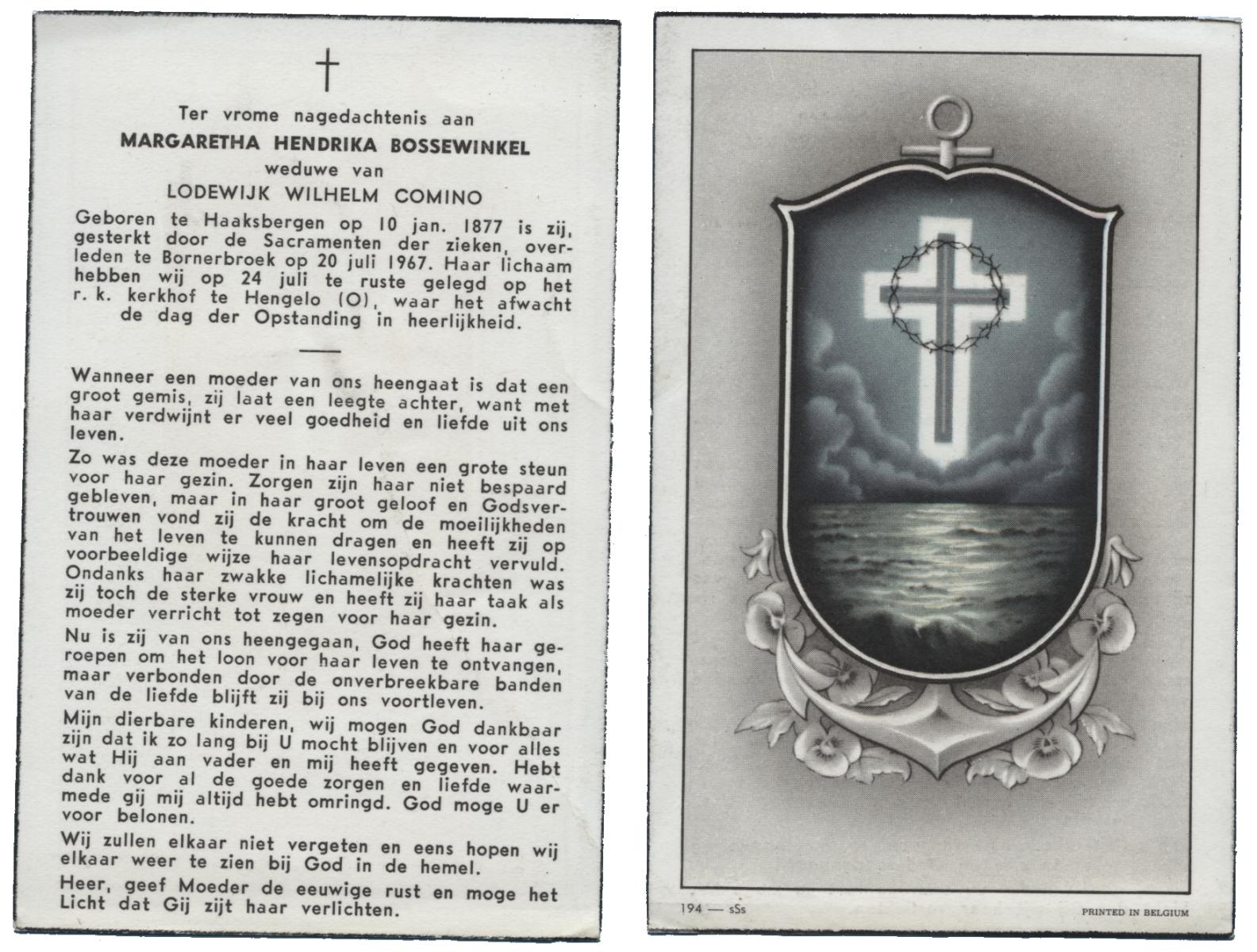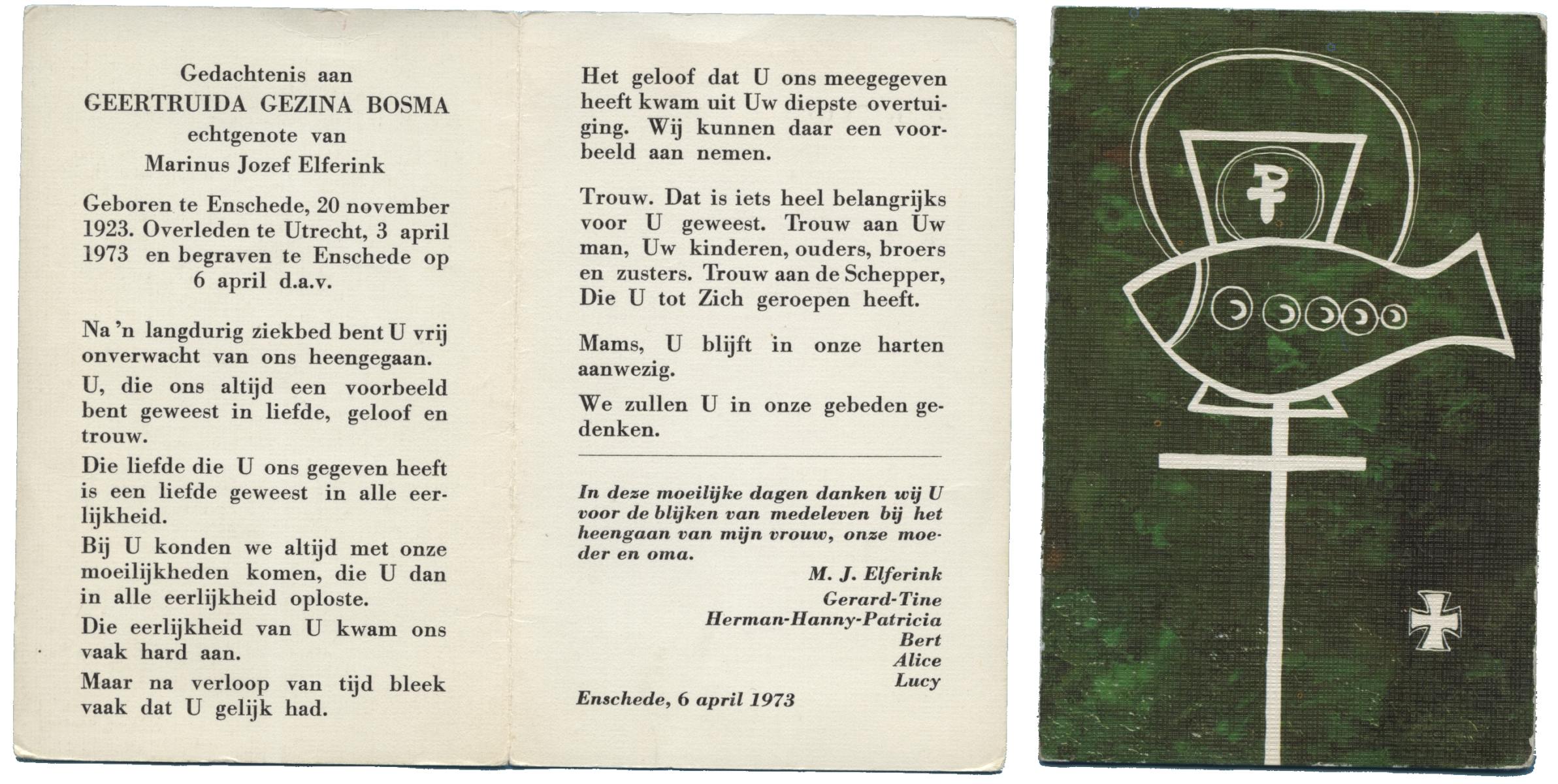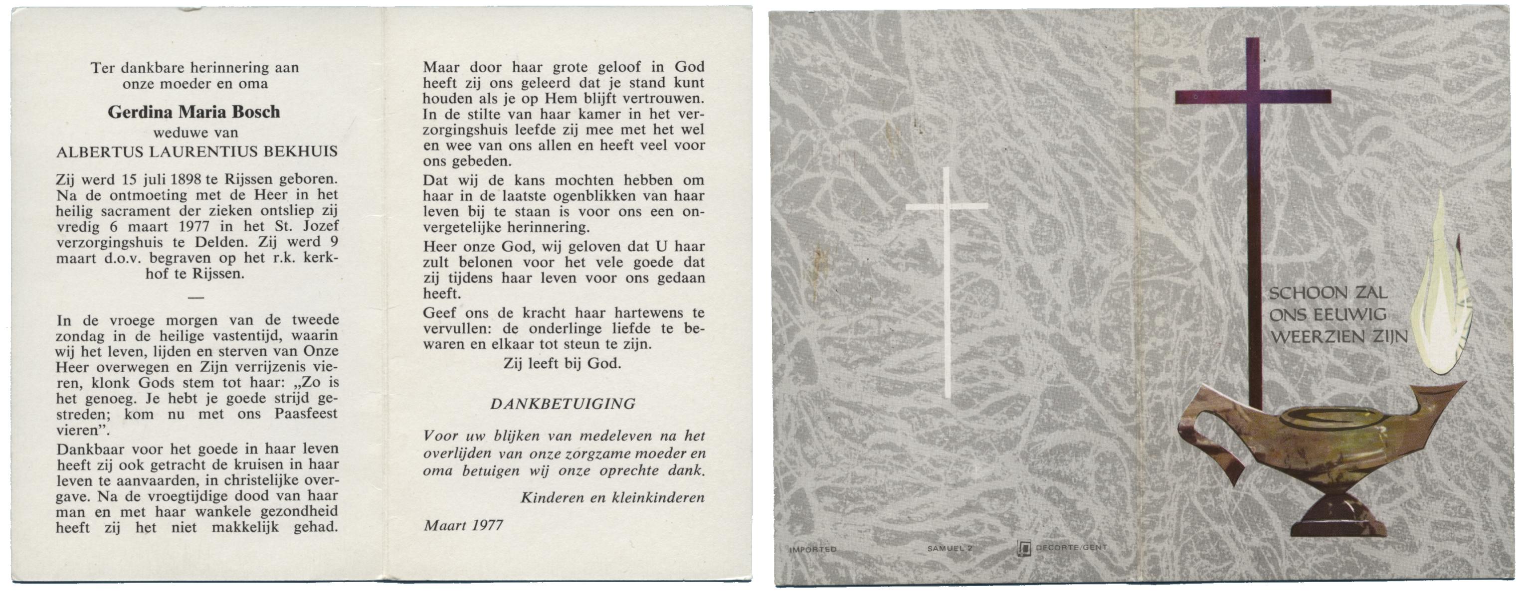 BOOMKAMP, Geertruida Margaretha, geboren op 20-7-1916 te Borne, overleden op 25-7-1970 te Hengelo (Ov.) op 54-jarige leeftijd, begraven op 29-7-1970 te Borne.