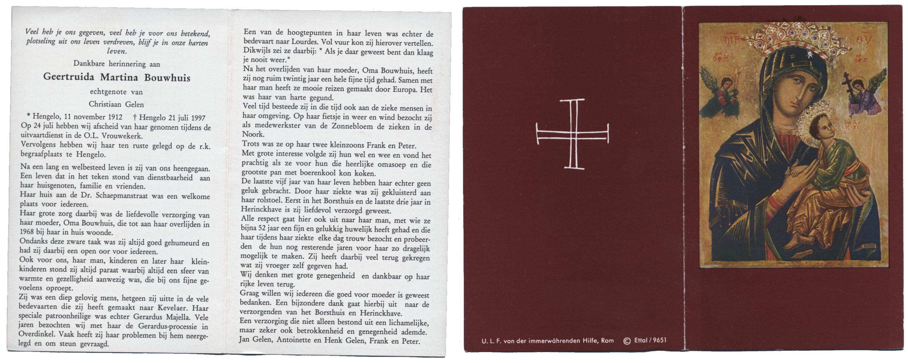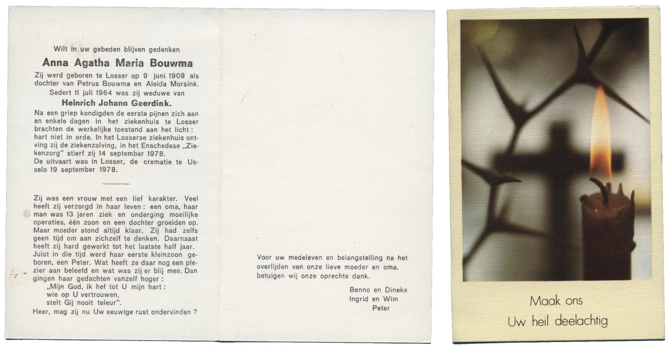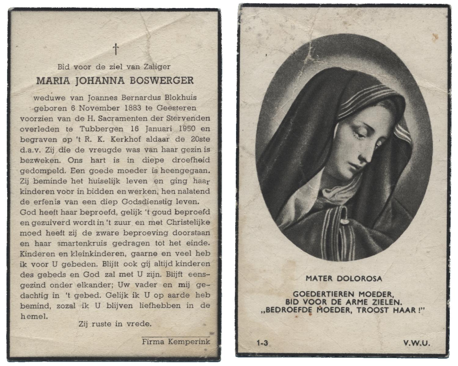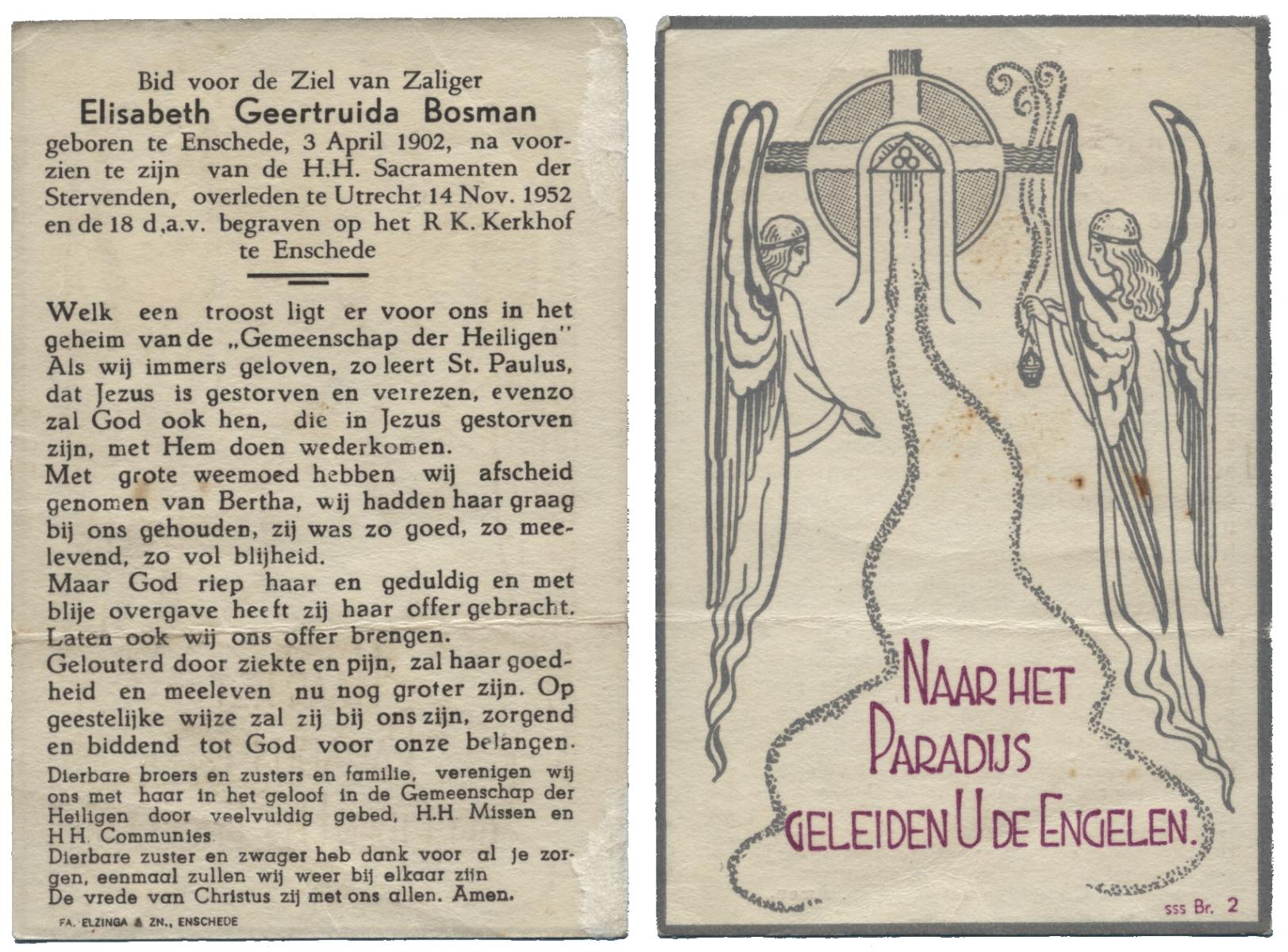 BOOMKAMP, Geertruida Margaretha, geboren op 20-7-1916 te Borne, overleden op 25-7-1970 te Hengelo (Ov.) op 54-jarige leeftijd, begraven op 29-7-1970 te Borne.