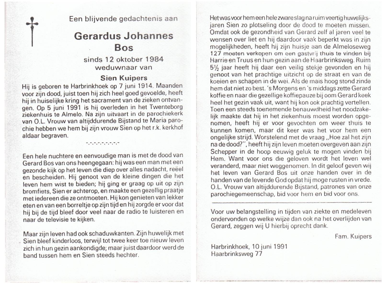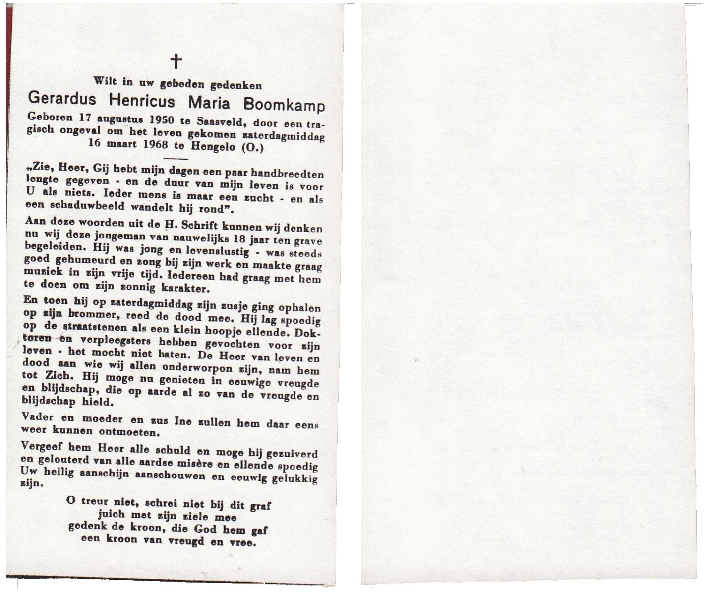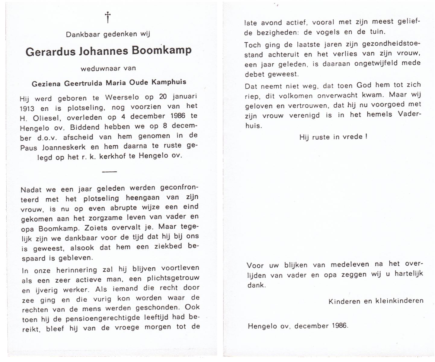 BOOMKAMP, Gerardus Johannes, geboren op 20-1-1913 te Weerselo, overleden op 4-12-1986 te Hengelo (Ov.) op 73-jarige leeftijd, begraven op 8-12-1986 te Hengelo (Ov.).