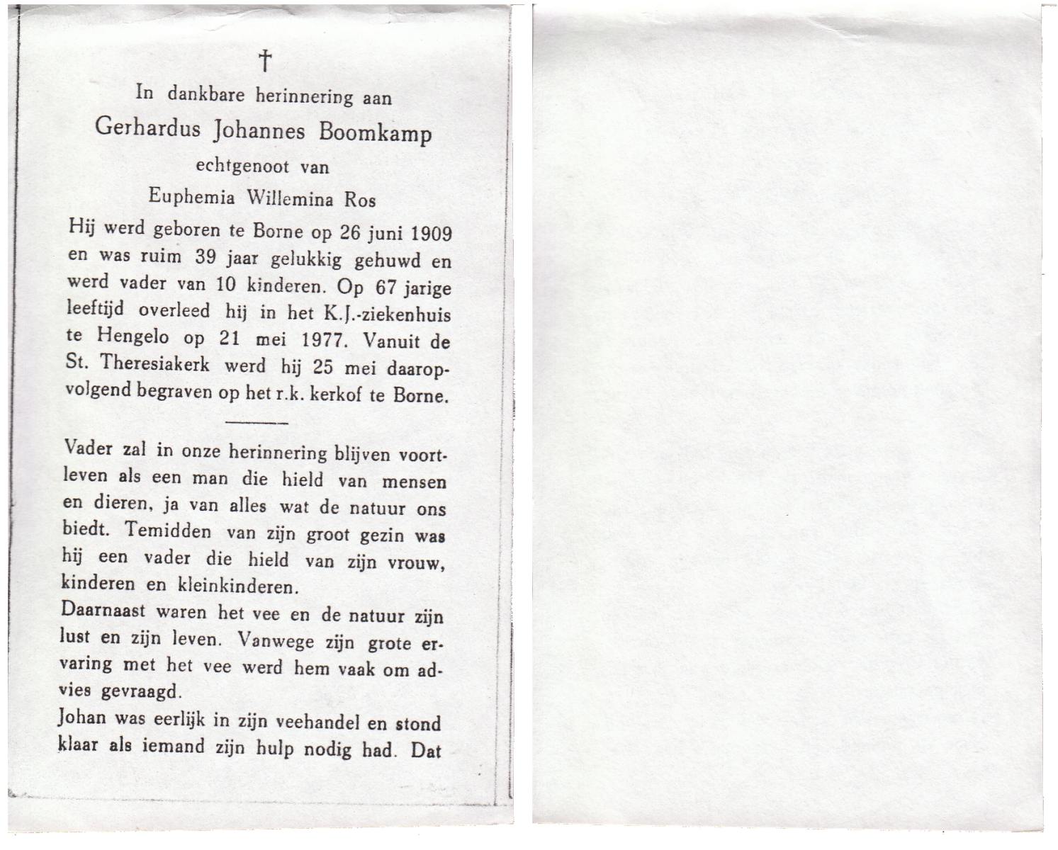 BOOMKAMP, Gerhardus Johannes, geboren op 26-6-1909 te Borne, overleden op 21-5-1977 te Hengelo (Ov.) op 67-jarige leeftijd, begraven op 25-5-1977 te Borne.