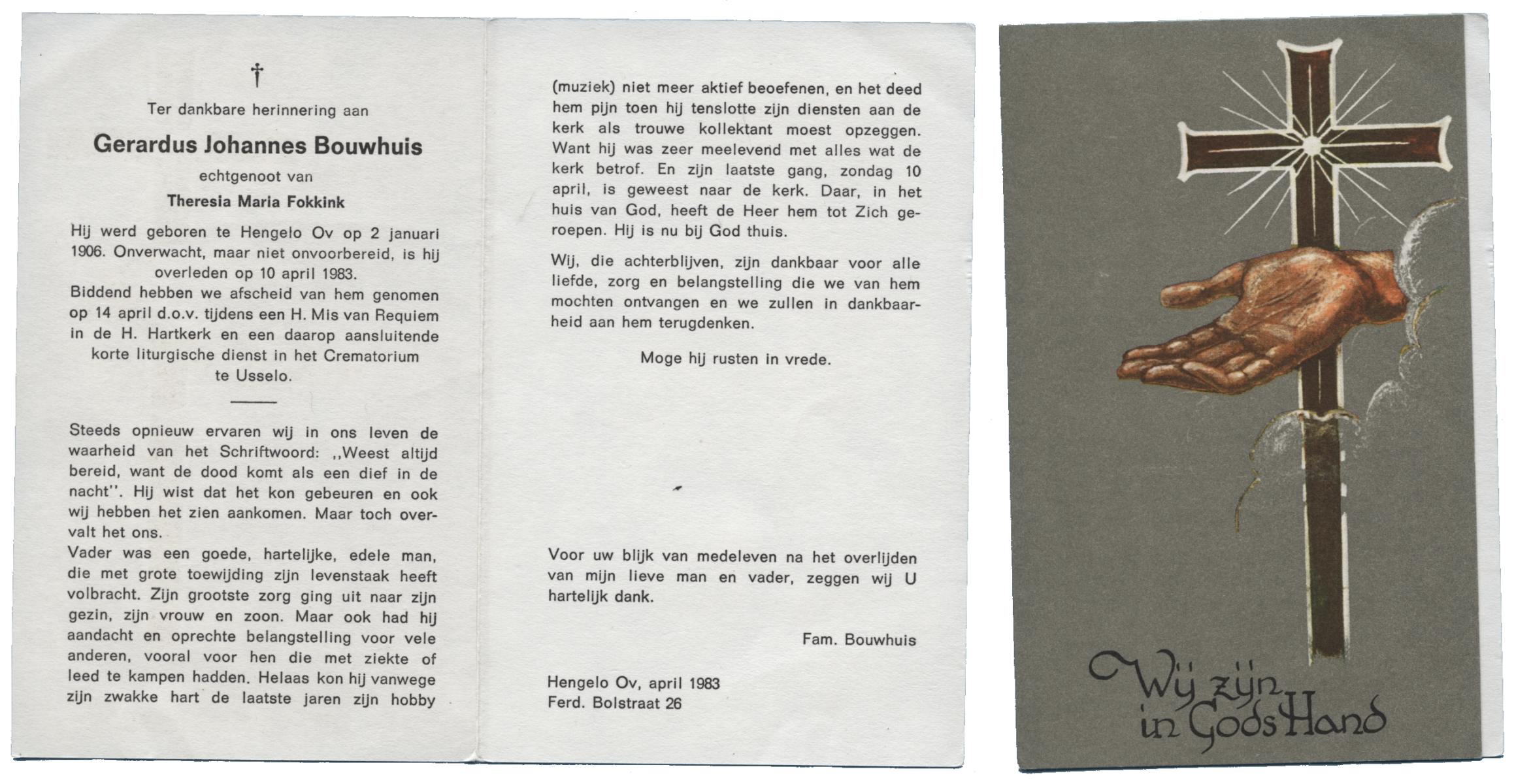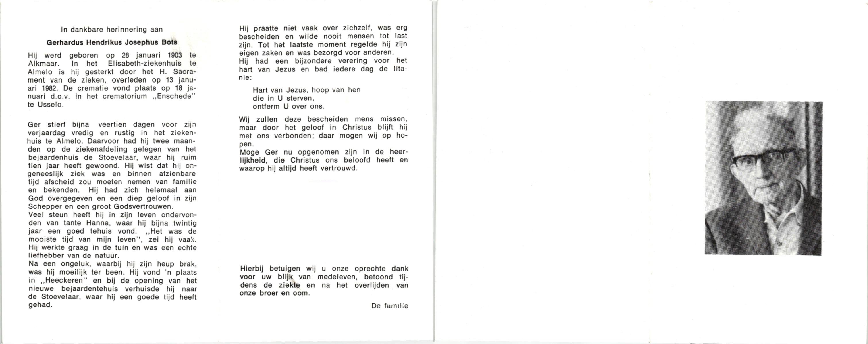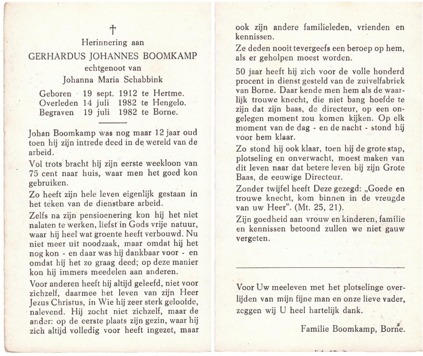 BOOMKAMP, Gerhardus Johannes, geboren op 19-9-1912 te Hertme, overleden op 14-7-1982 te Hengelo (Ov.) op 69-jarige leeftijd, begraven op 19-7-1982 te Borne.