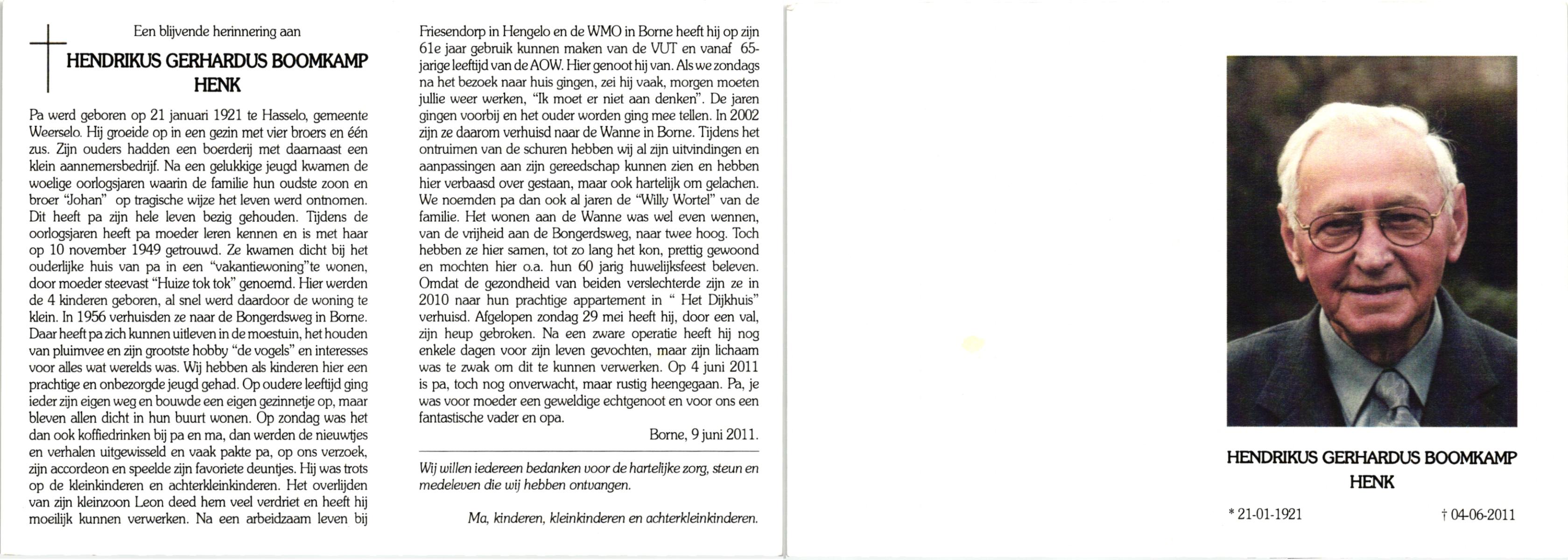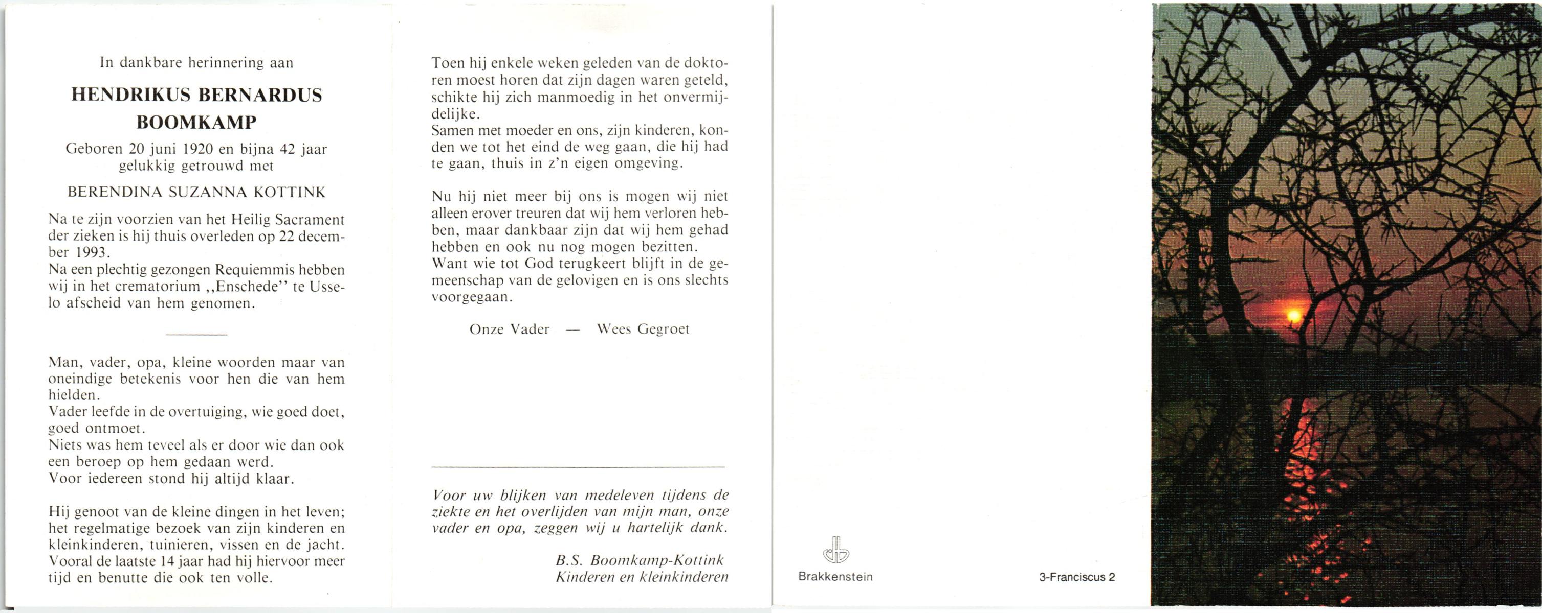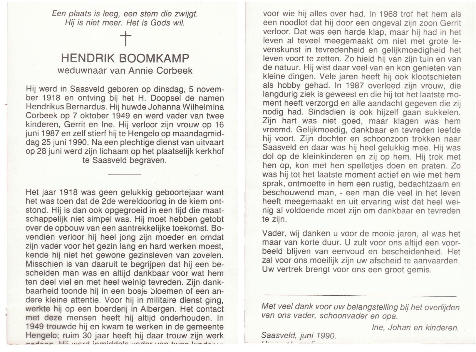 BOOMKAMP, Hendrikus Bernardus (Hendrik), geboren op 5-11-1918 te Saasveld, overleden op 25-6-1990 te Hengelo (Ov.) op 71-jarige leeftijd, begraven op 28-6-1990 te Saasveld.