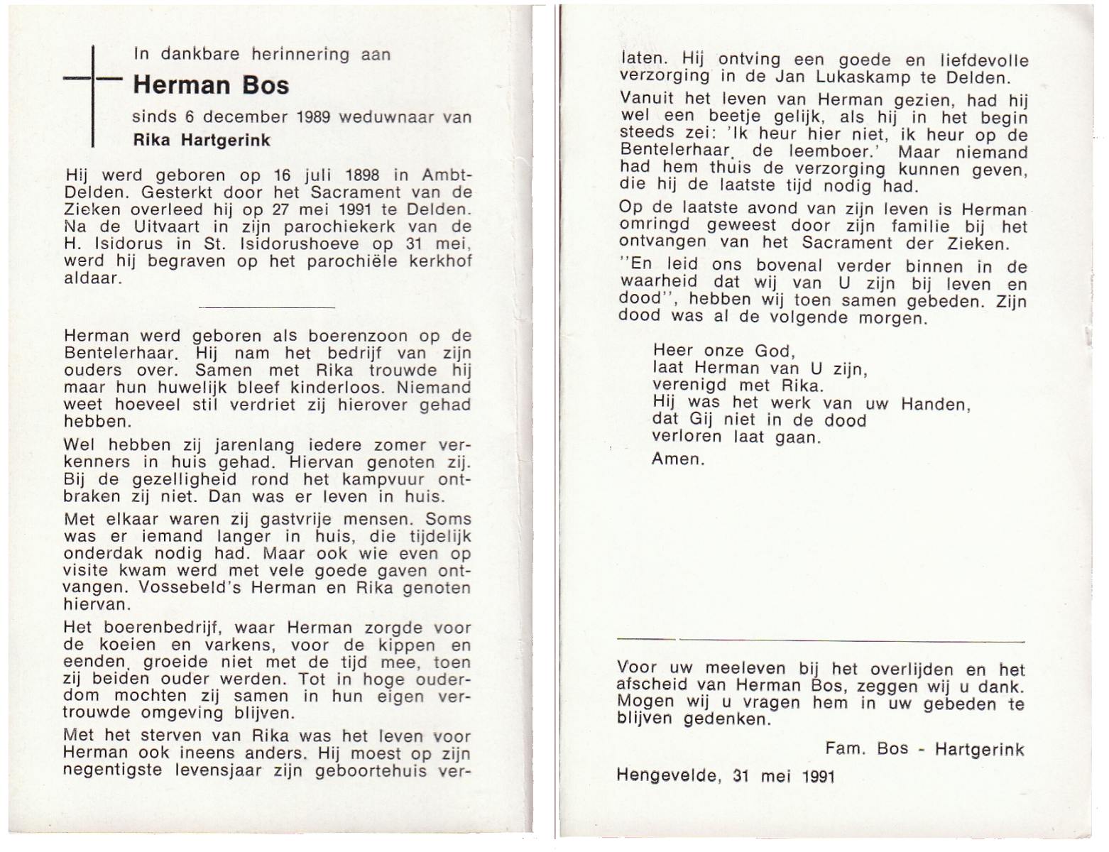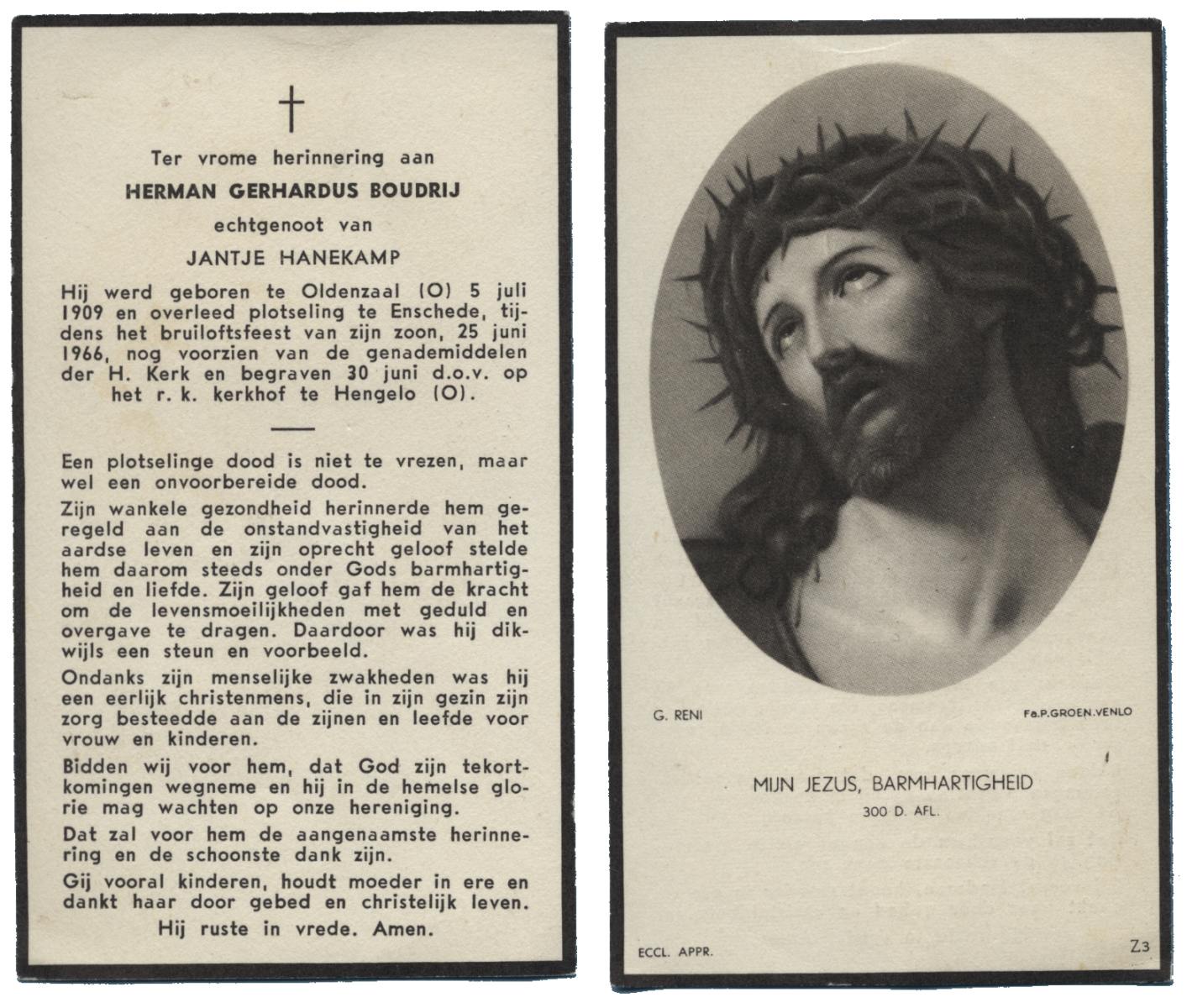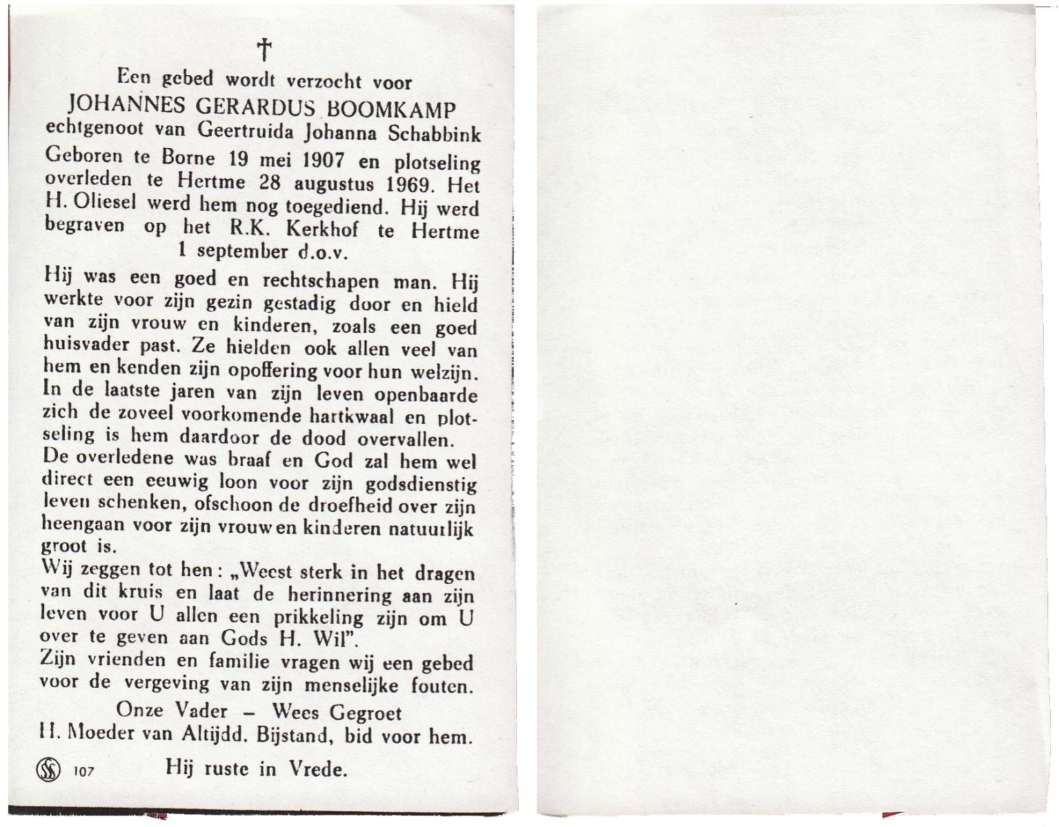 BOOMKAMP, Johannes Gerardus, geboren op 19-5-1907 te Borne, overleden op 28-8-1969 te Hertme op 62-jarige leeftijd, begraven op 1-9-1969 te Hertme r.k.kerkhof.