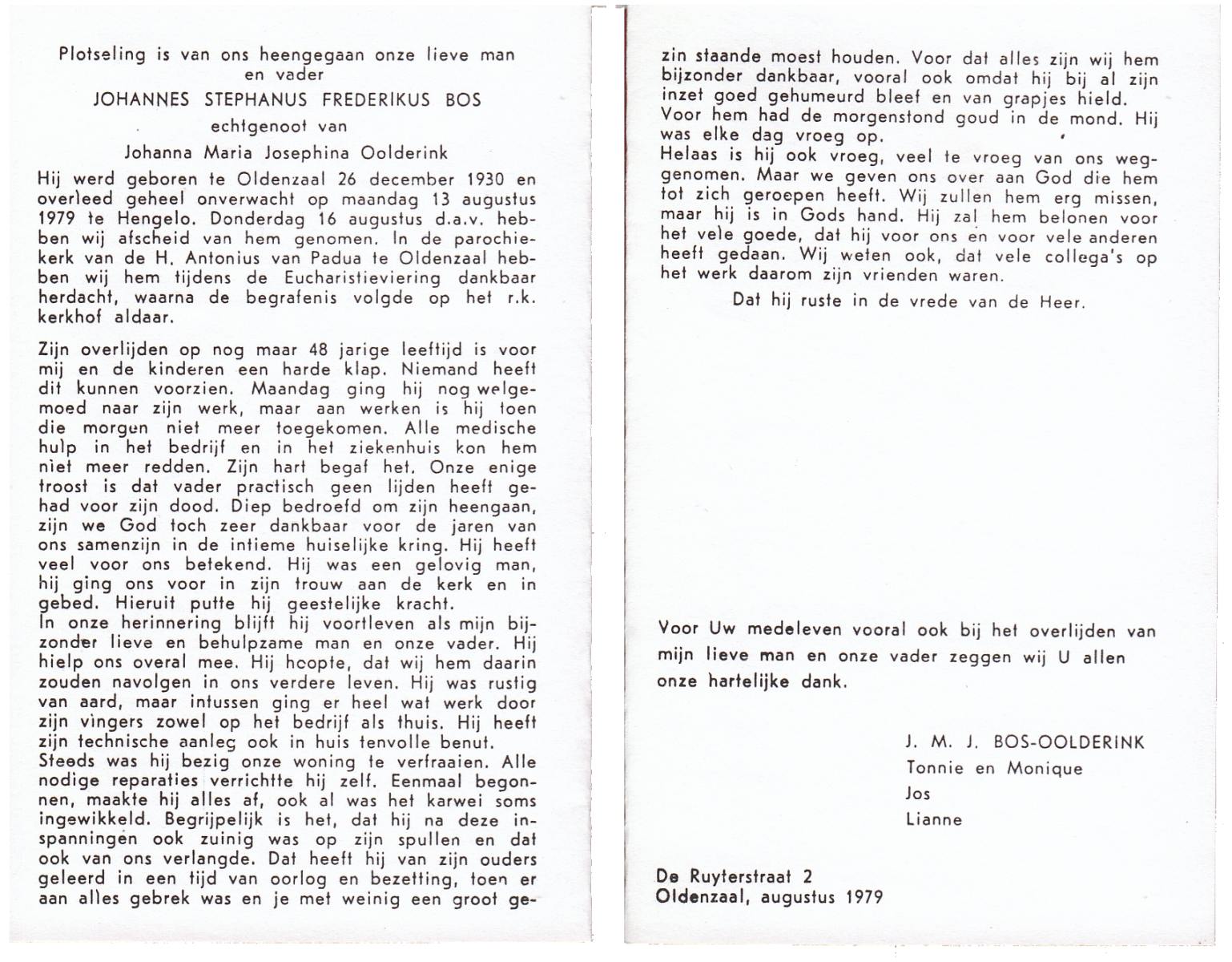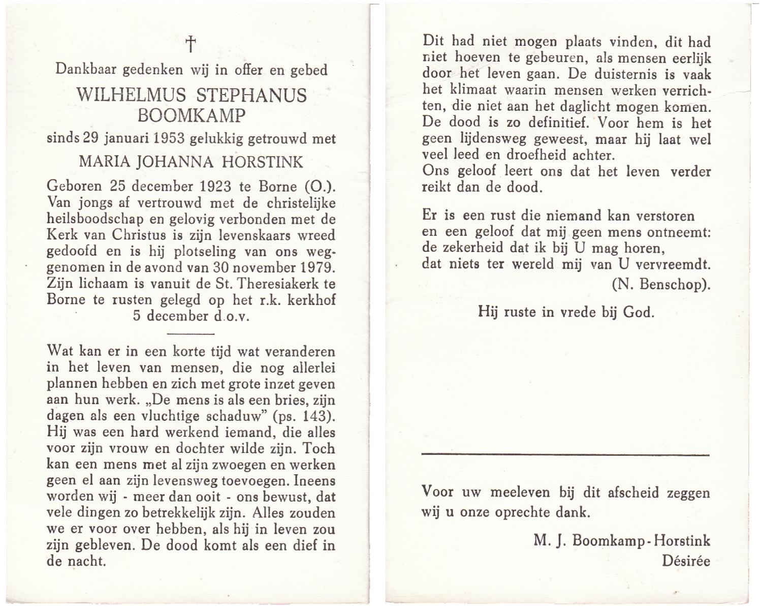 BOOMKAMP, Wilhelmus Stephanus, geboren op 25-12-1923 te Borne, overleden op 30-11-1979 te Delden, Ambt op 65-jarige leeftijd, begraven op 5-12-1979 te Borne.