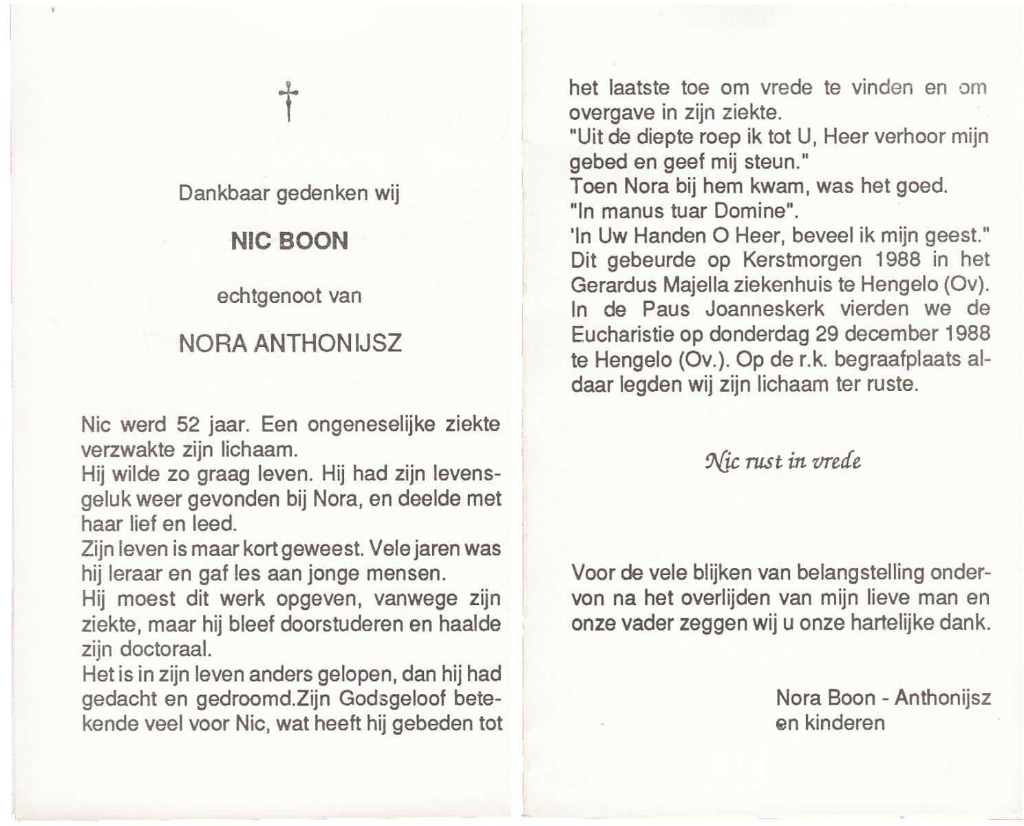 BOON, Nic, overleden op 25-12-1988 te Hengelo (Ov.) op 52-jarige leeftijd, begraven op 29-12-1988 te Hengelo (Ov.).