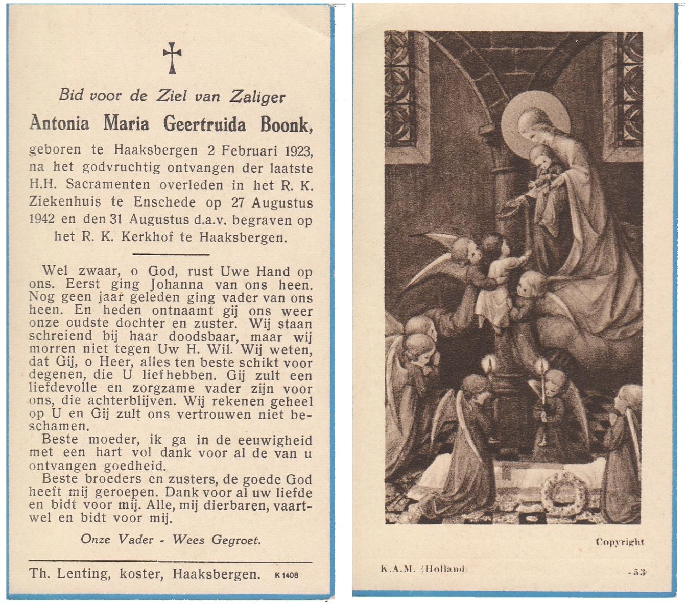 BOONK, Antonia Maria Geertruida, geboren op 2-2-1923 te Haaksbergen, overleden op 27-8-1942 te Haaksbergen op 21-jarige leeftijd, begraven op 31-8-1942 te Haaksbergen.