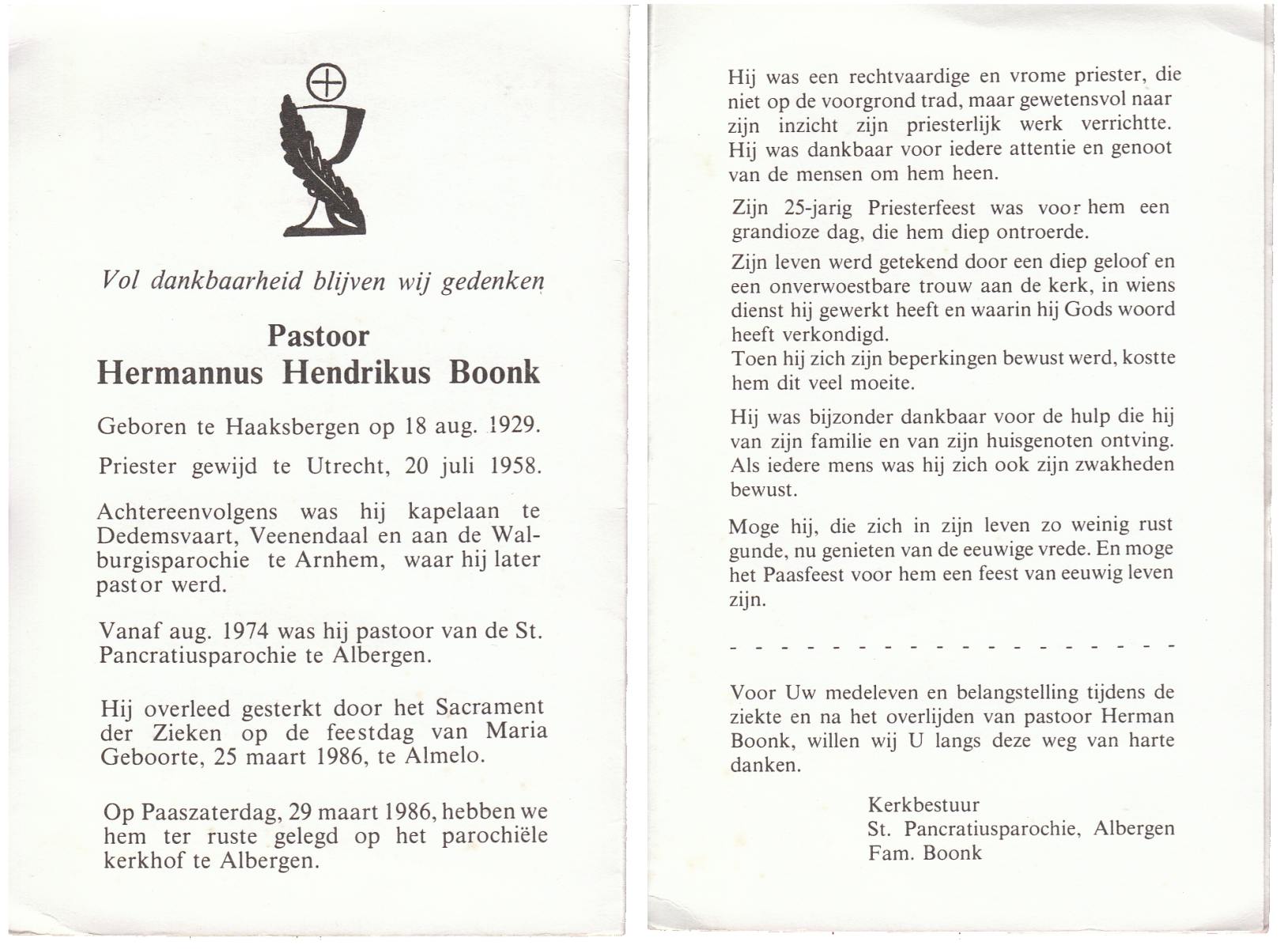 BOONK, Hermannus Hendrikus, geboren op 18-8-1929 te Haaksbergen, overleden op 25-3-1986 te Almelo op 56-jarige leeftijd, begraven op 29-3-1986 te Albergen.