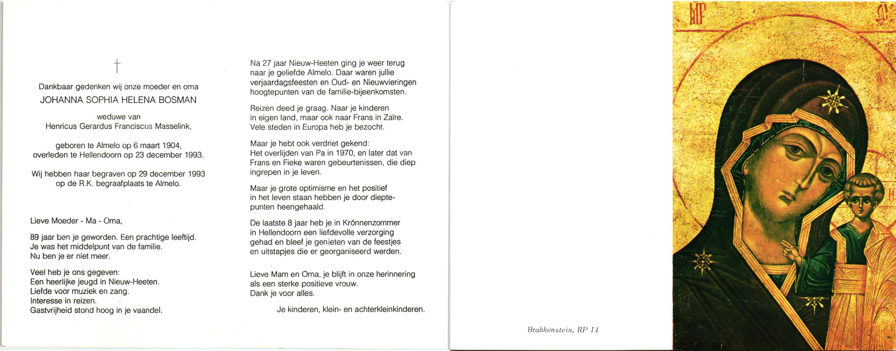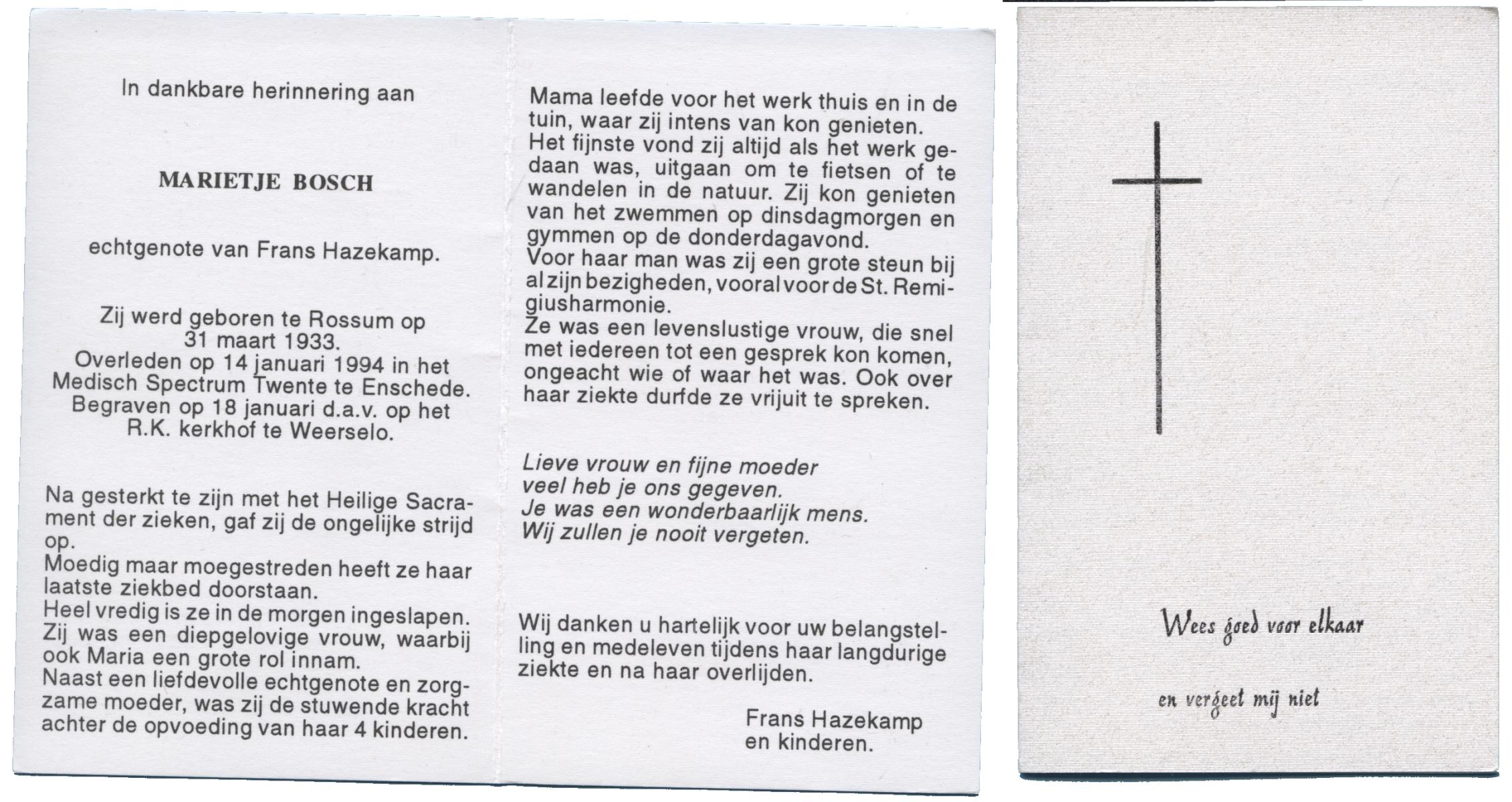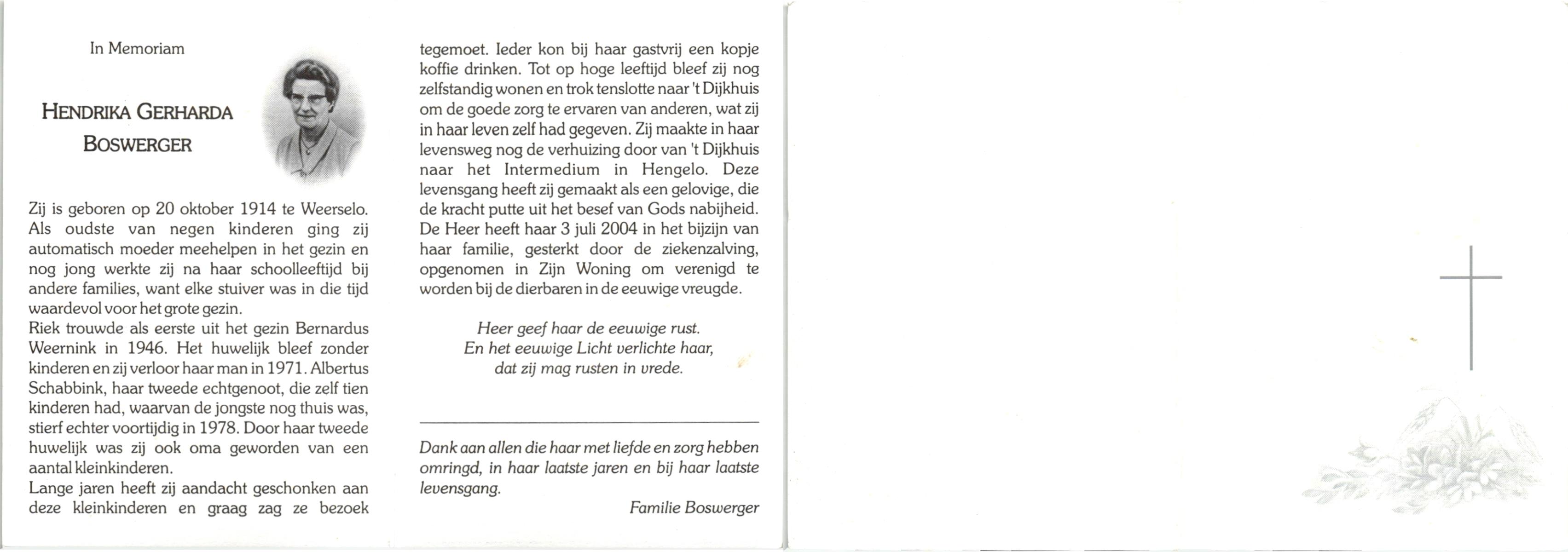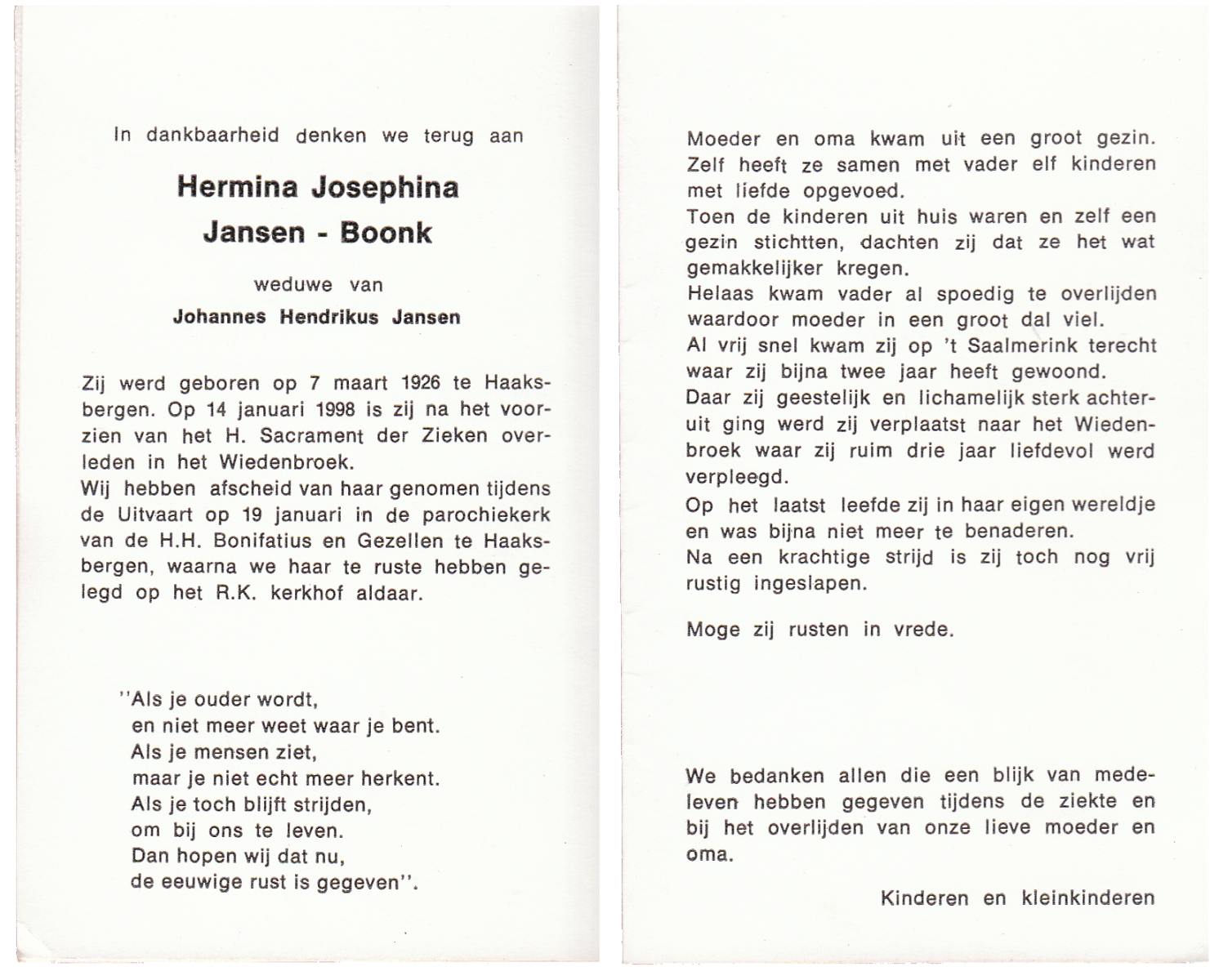 BOONK, Hermian Josephina, geboren op 7-3-1926 te Haaksbergen, overleden op 14-1-1998 te Haaksbergen op 71-jarige leeftijd, begraven op 19-1-1998 te Haaksbergen.