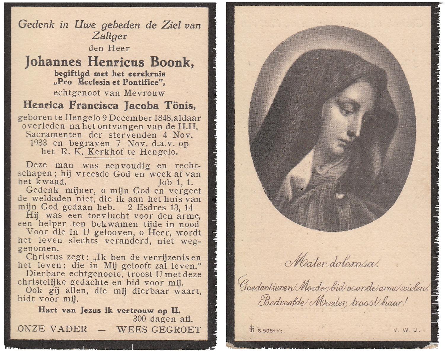 BOONK, Johannes Henricus, geboren op 09-12-1848 te Hengelo (O), overleden op 4-11-1933 te Hengelo (Ov.) op 84-jarige leeftijd, begraven op 7-11-1933 te Hengelo (Ov.).