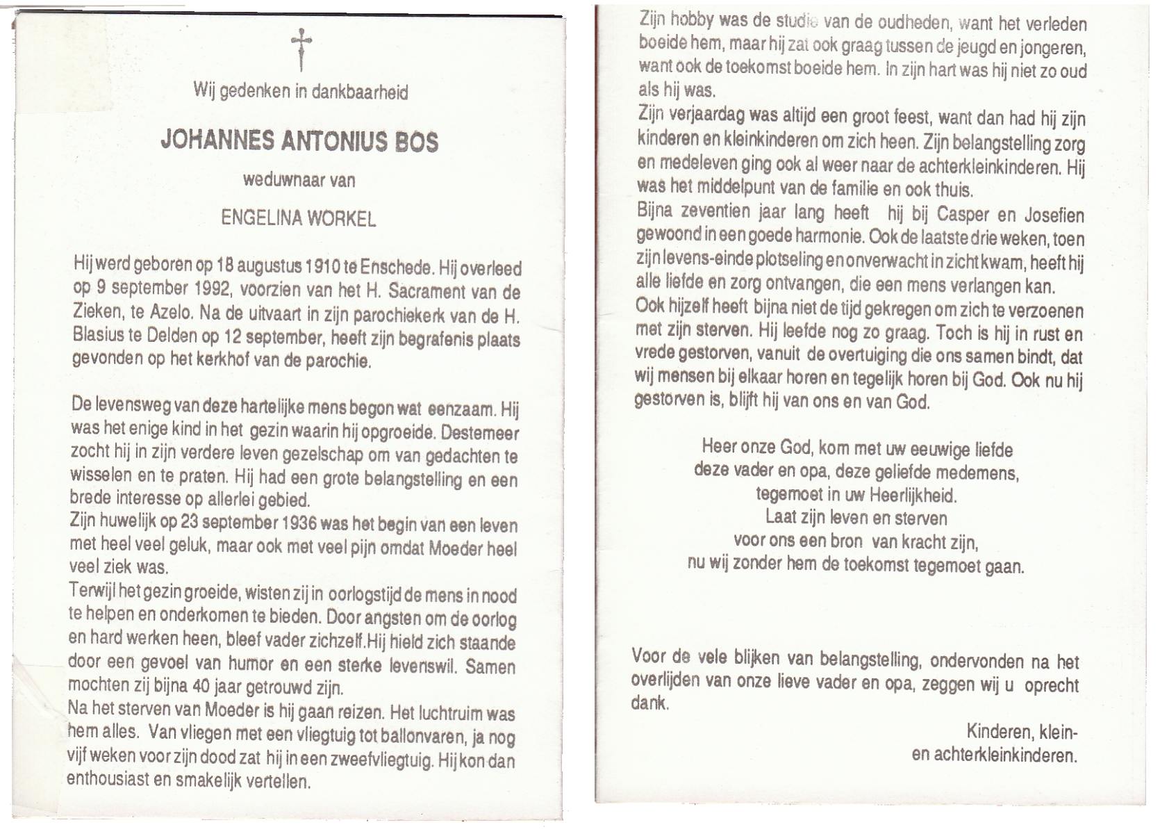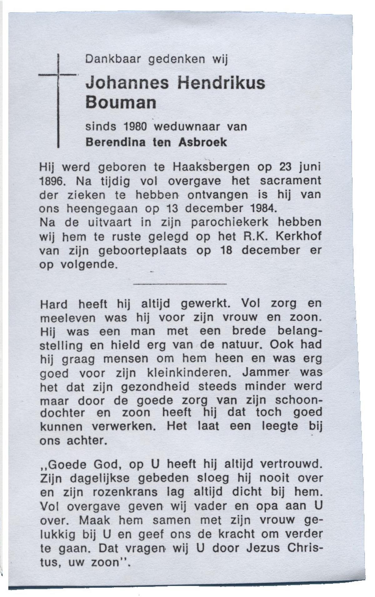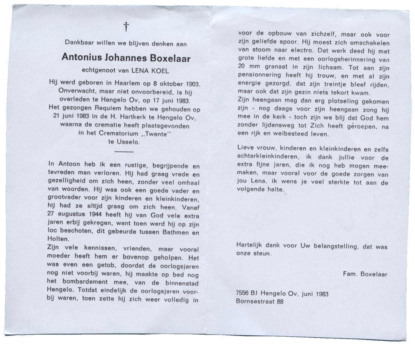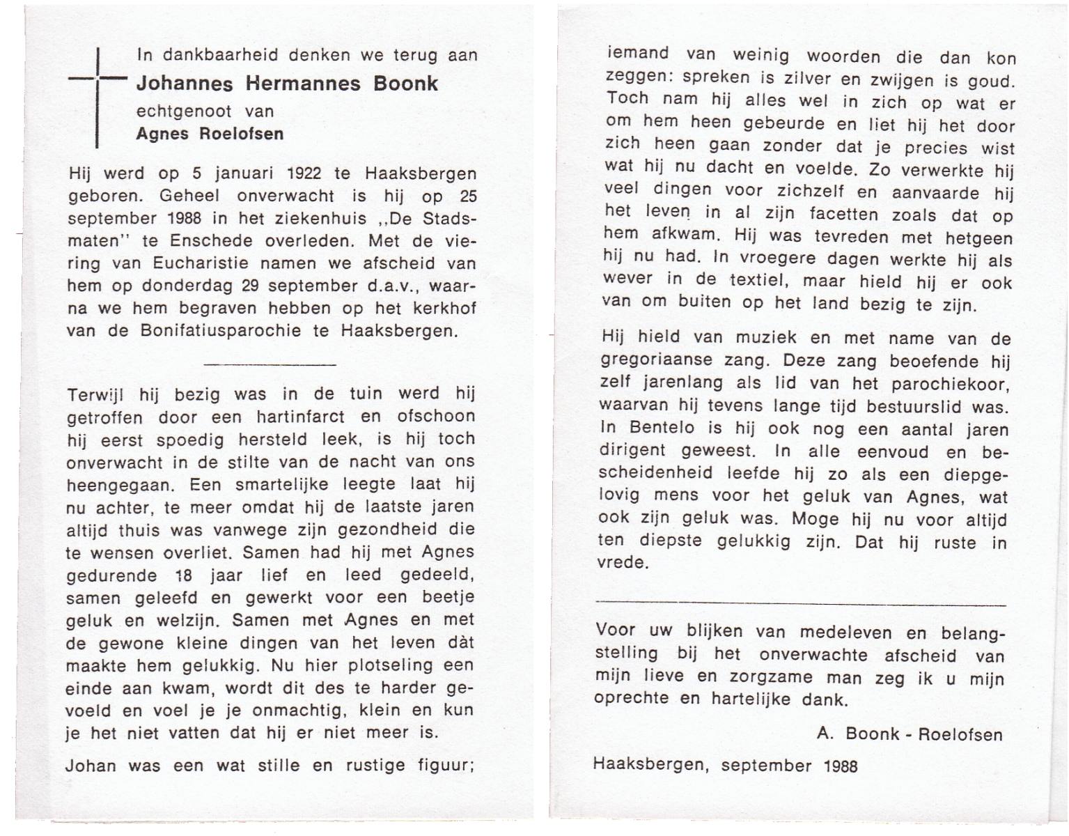 BOONK, Johannes Hermannes, geboren op 5-1-1922 te Haaksbergen, overleden op 25-9-1988 te Enschede op 66-jarige leeftijd, begraven op 29-9-1988 te Haaksbergen, Bonifatiuskerk.