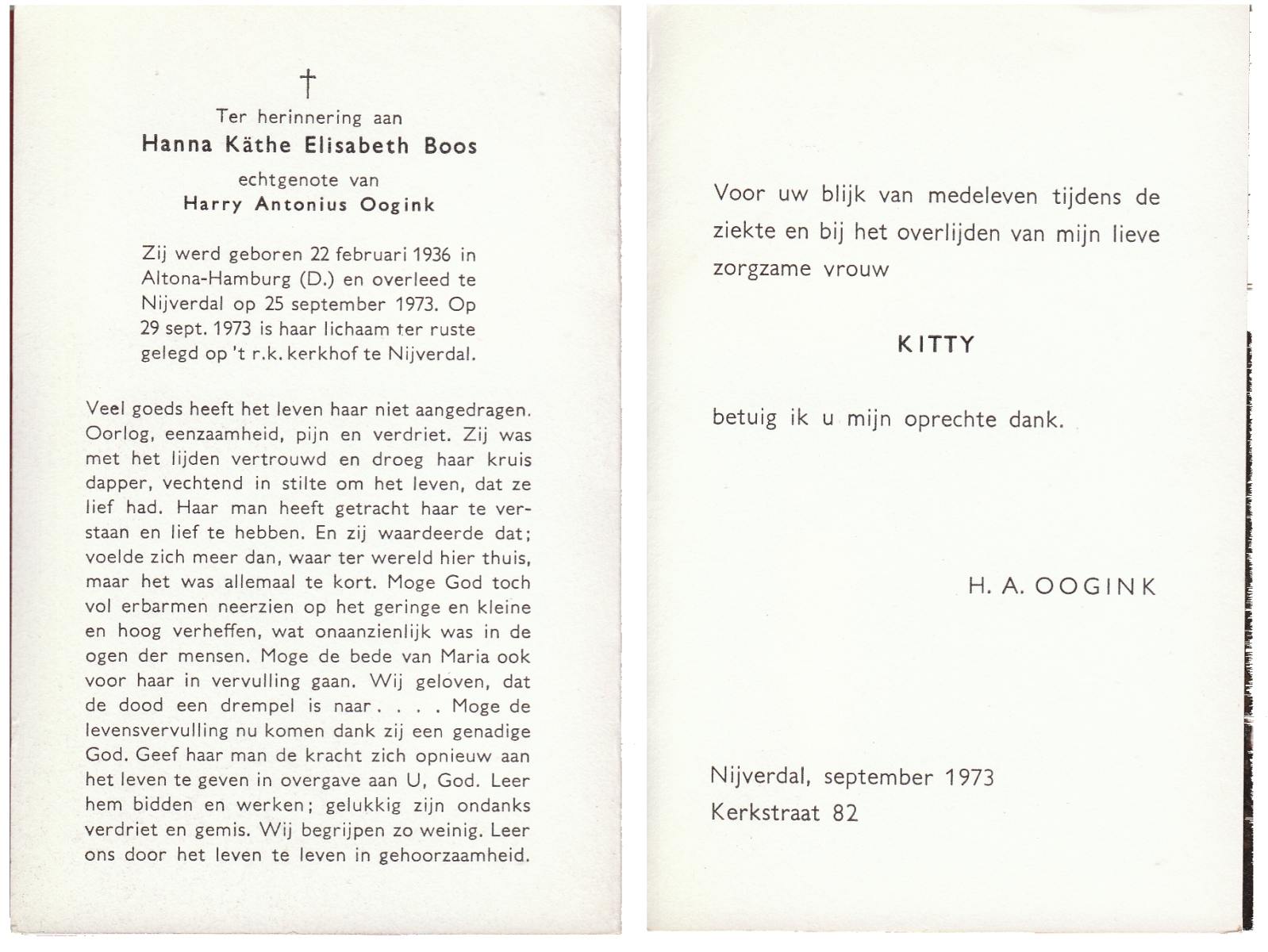 BOOS, Hanna Kathe Elisabeth (Kitty), geboren op 22-2-1936 te Altona-Hamburg, Dld, overleden op 25-9-1973 te Hellendoorn, Nijverdal op 37-jarige leeftijd, begraven op 29-9-1973 te Hellendoorn, Nijverdal.