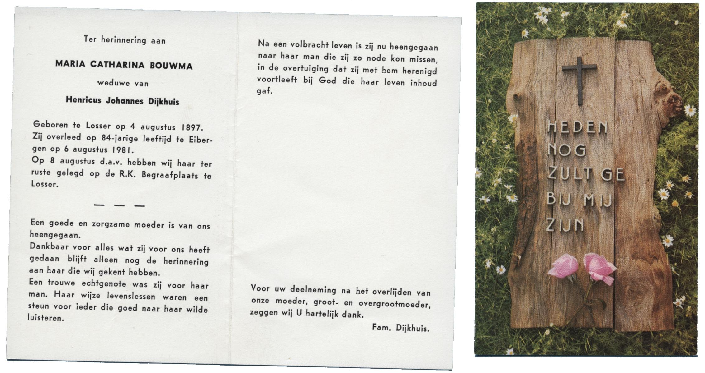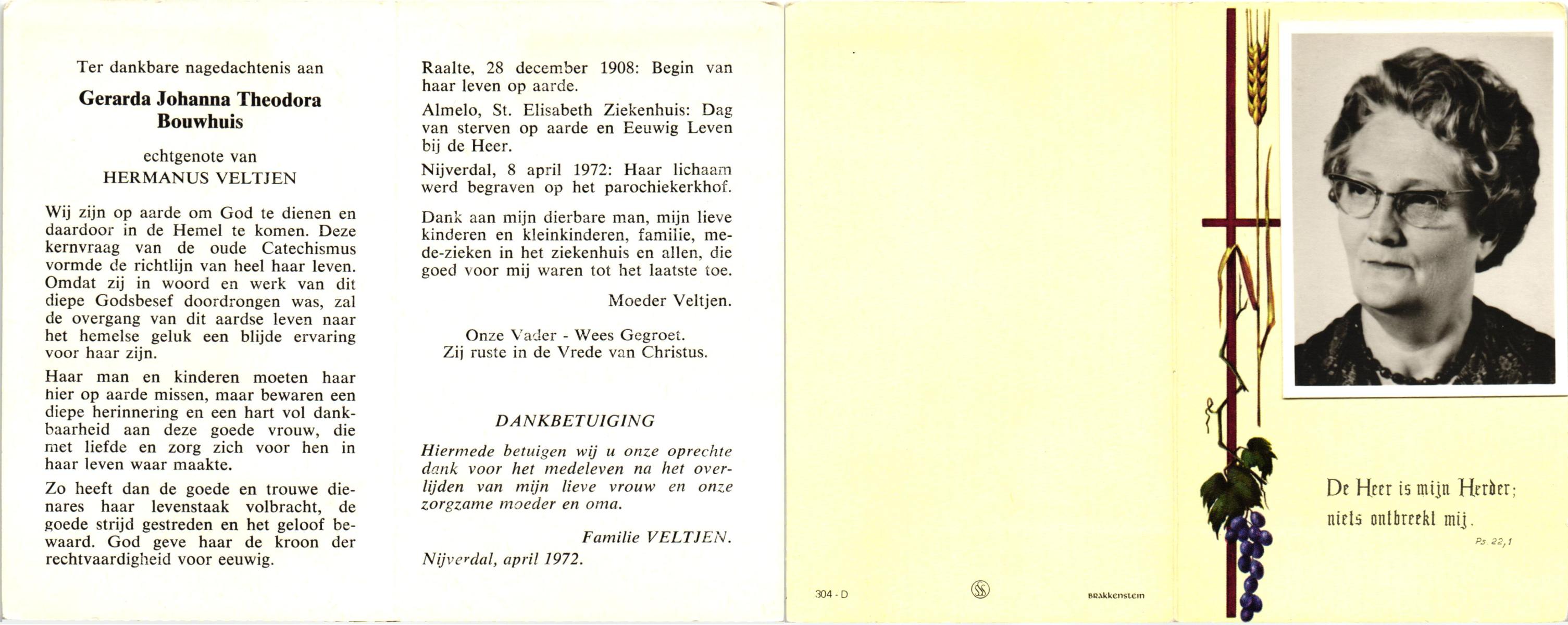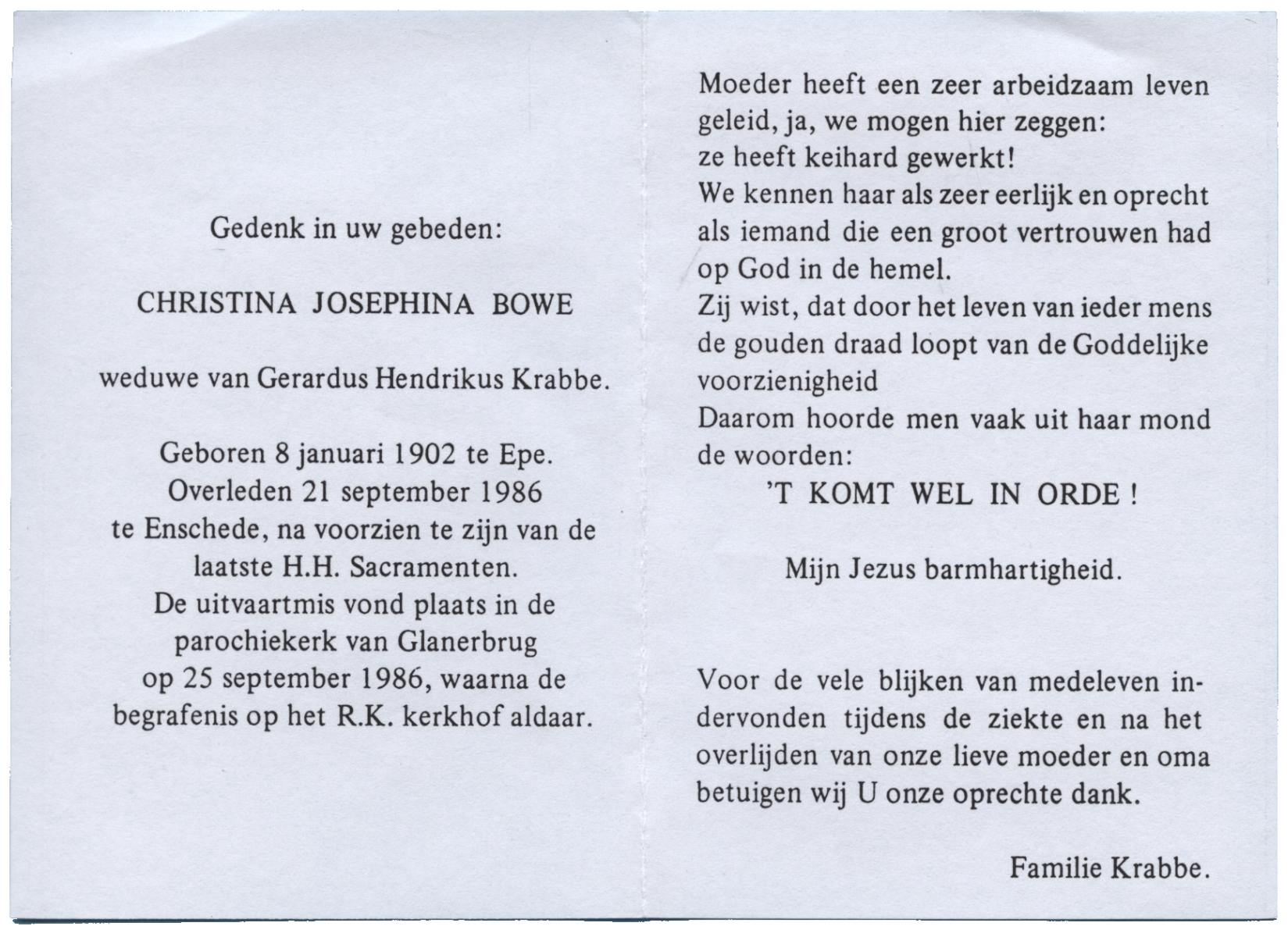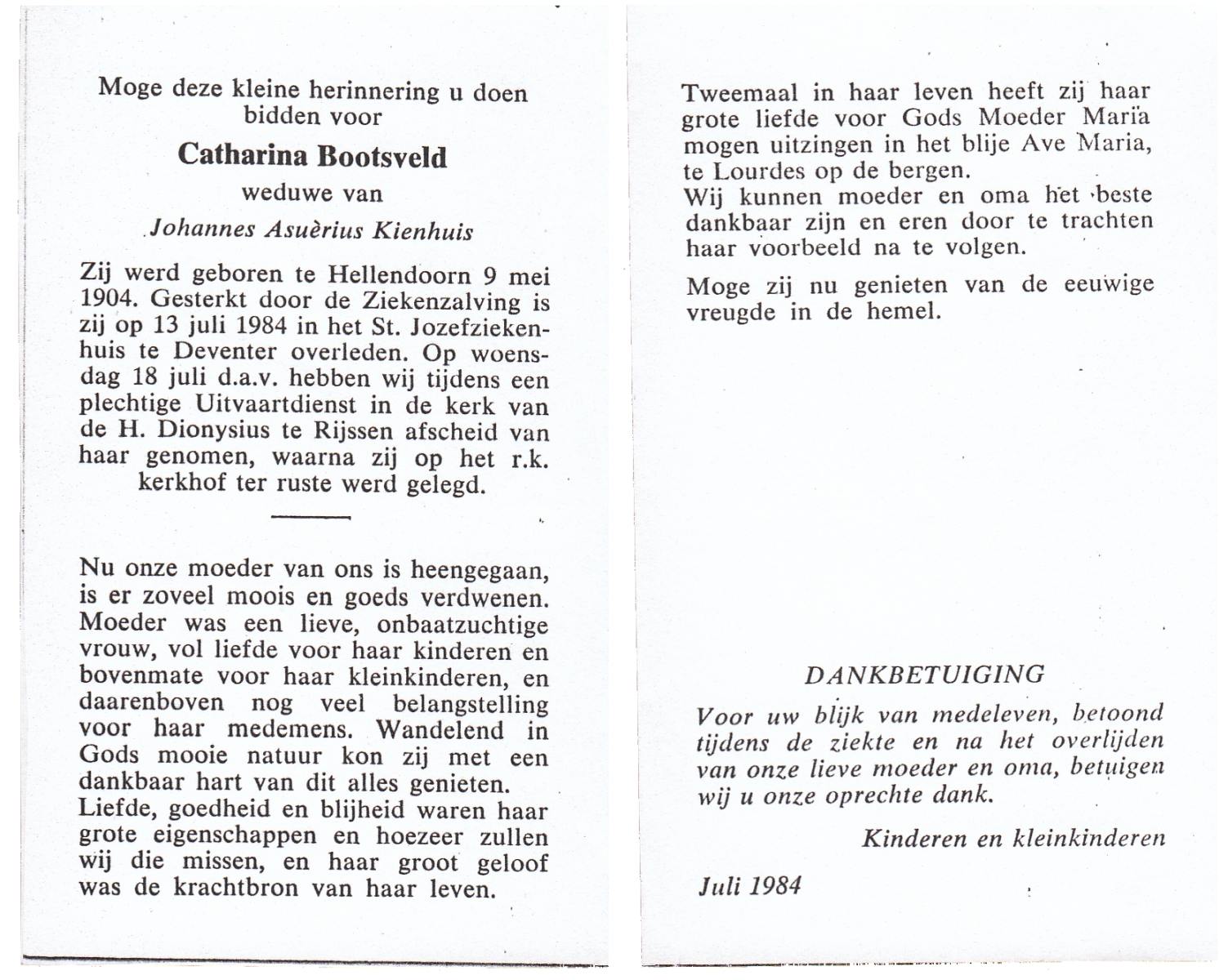 BOOTSVELD, Catharina, geboren op 9-5-1904 te Hellendoorn, overleden op 13-7-1984 te Deventer op 80-jarige leeftijd, begraven op 18-7-1984 te Rijssen.