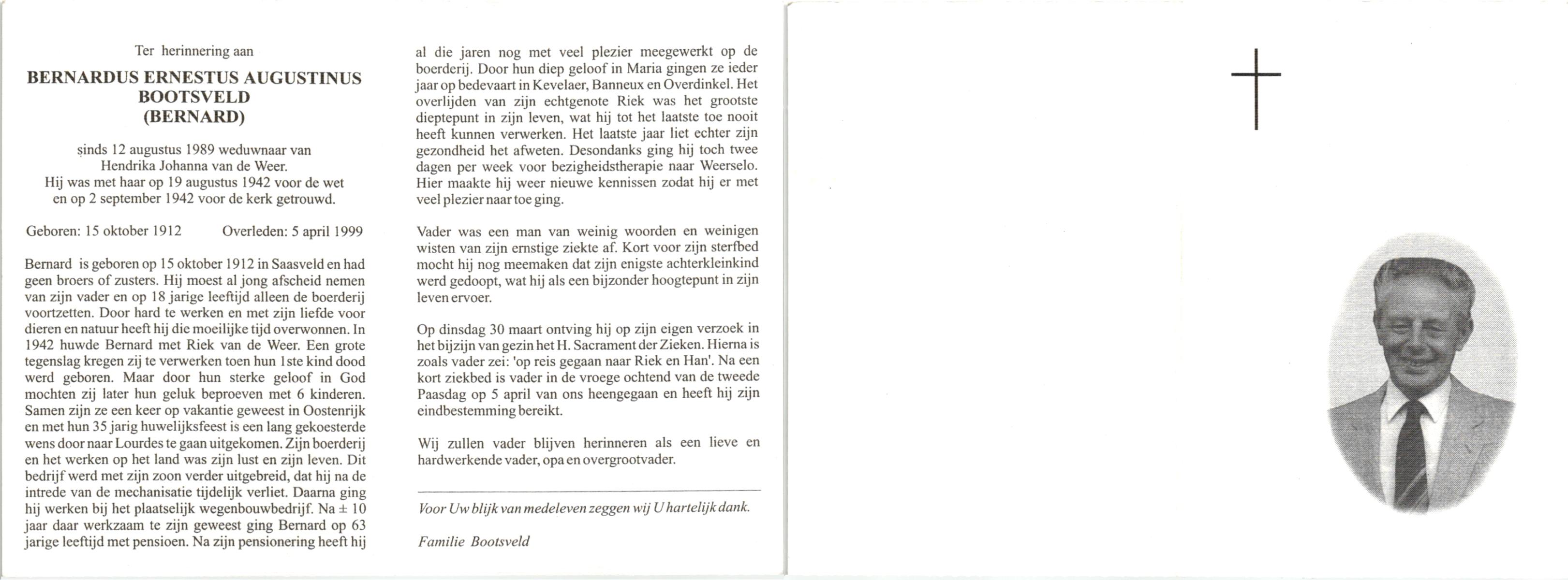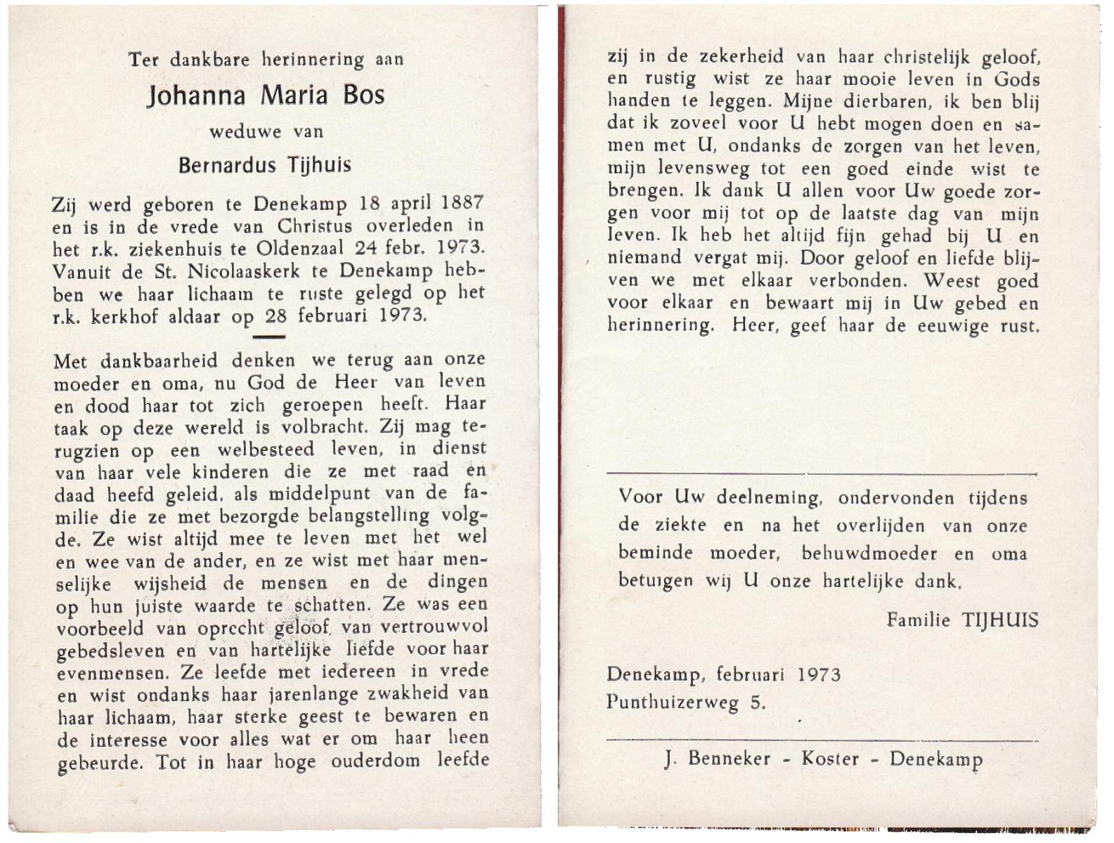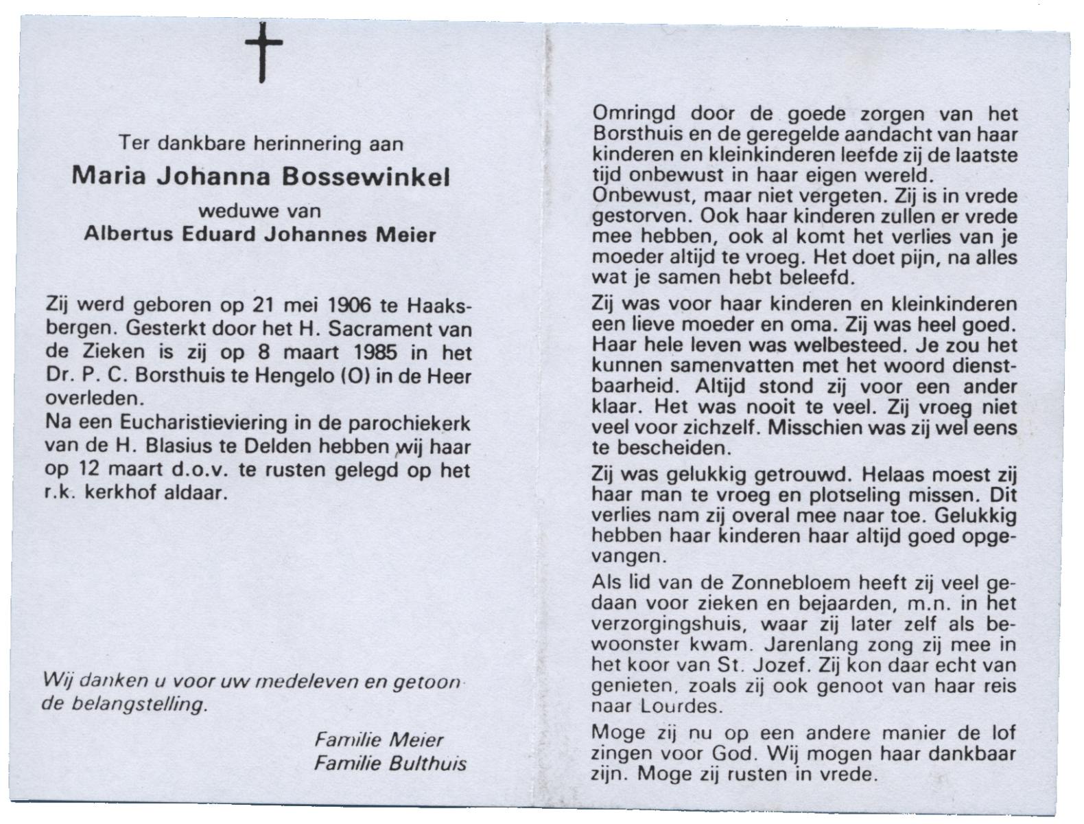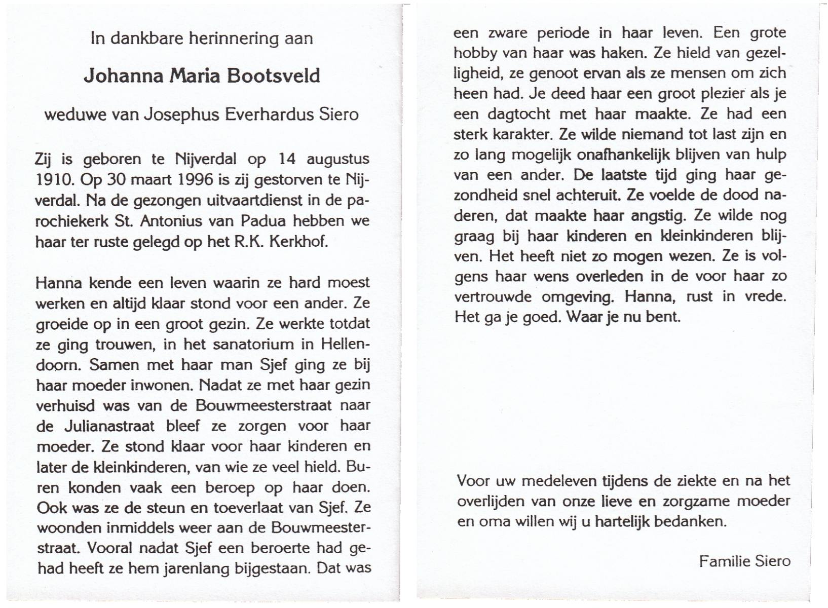 BOOTSVELD, Johanna Maria, geboren op 14-8-1910 te Nijverdal, overleden op 30-3-1996 te Nijverdal op 85-jarige leeftijd, begraven te Nijverdal.