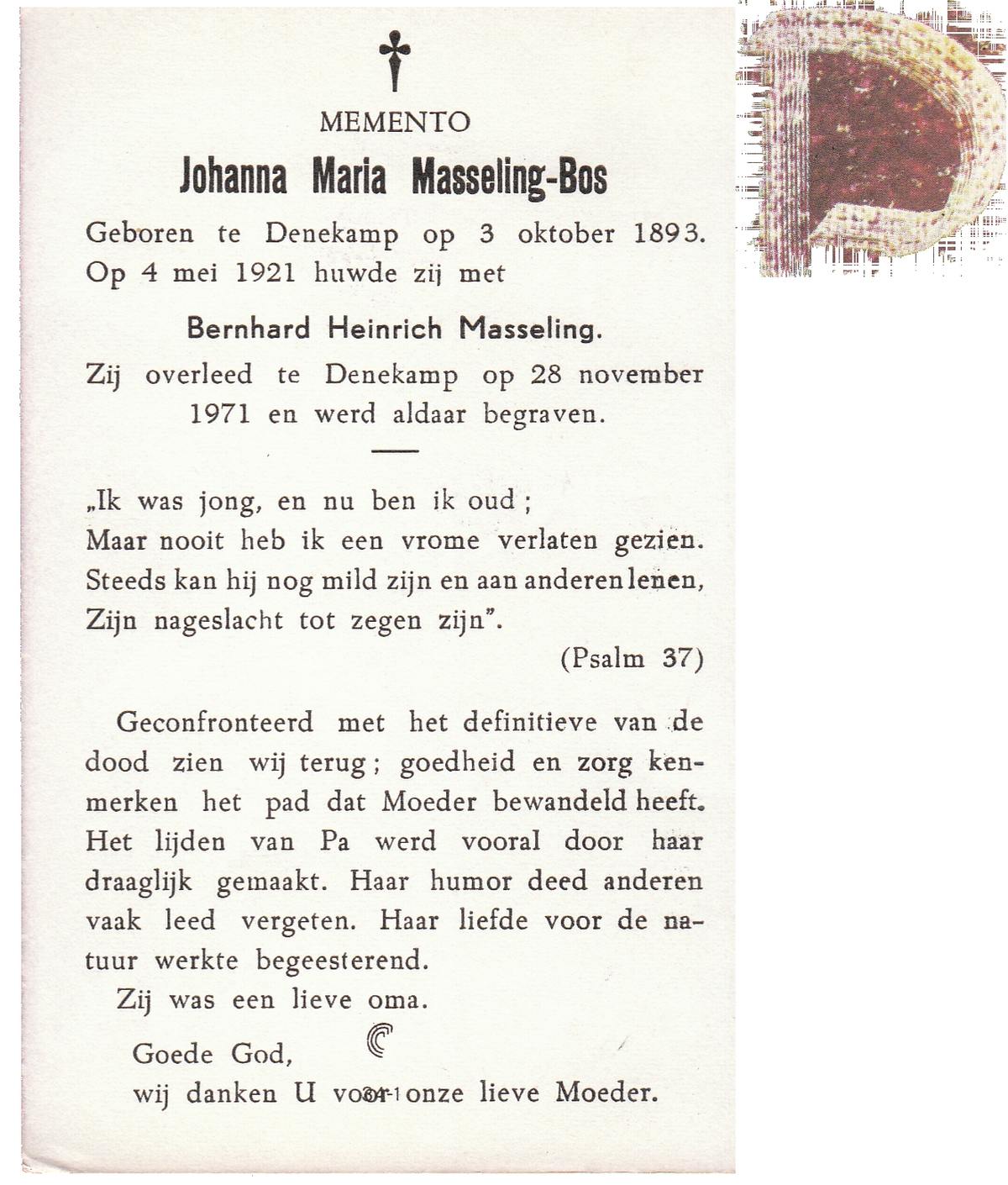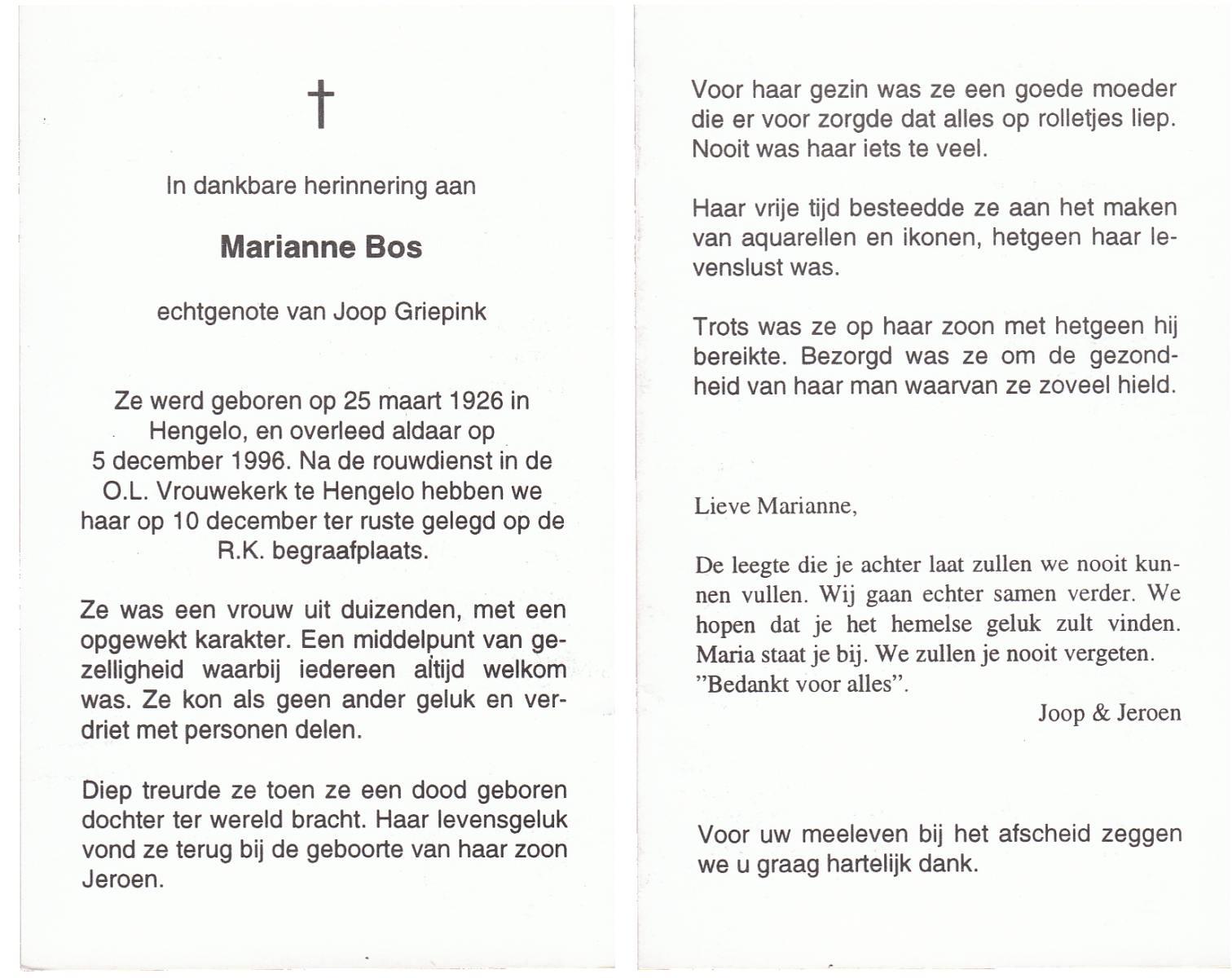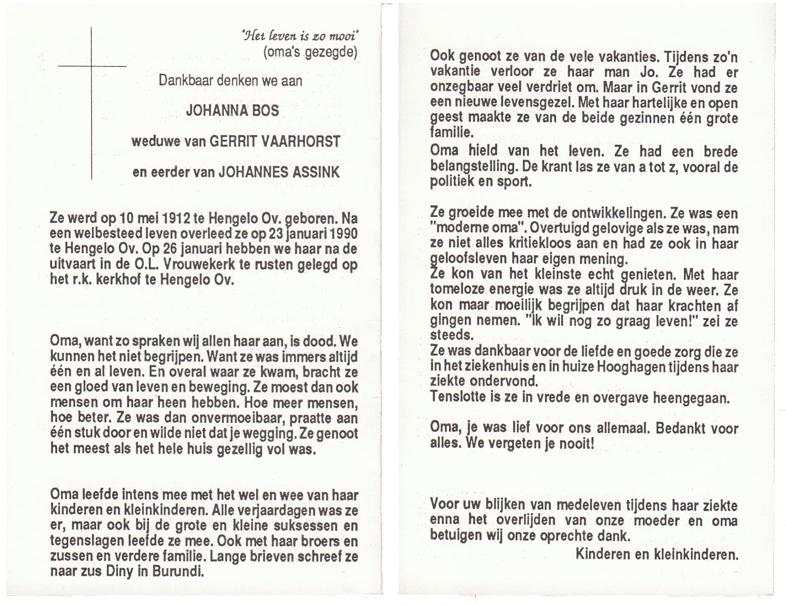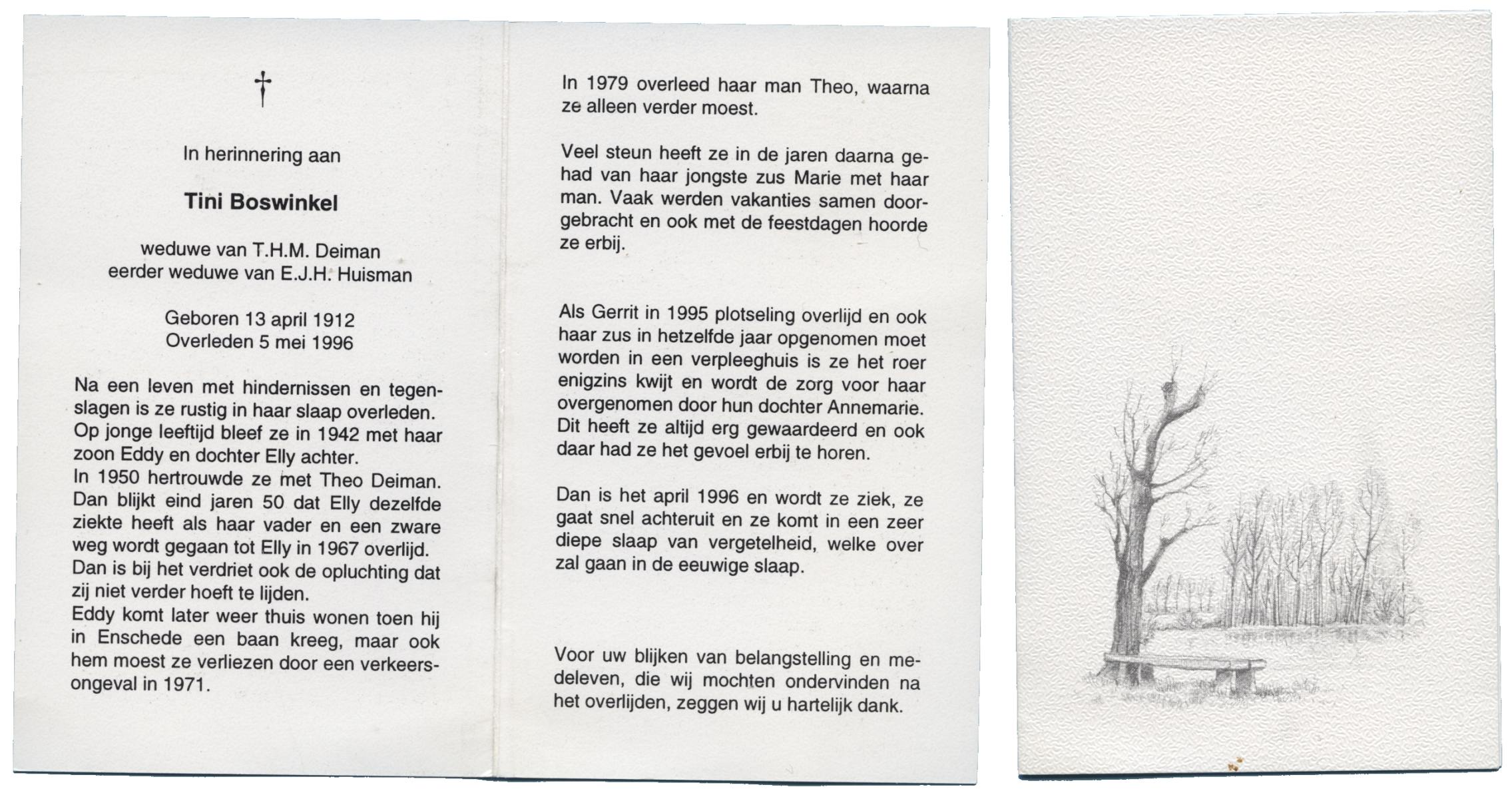 BOOTSVELD, Johanna Maria, geboren op 14-8-1910 te Nijverdal, overleden op 30-3-1996 te Nijverdal op 85-jarige leeftijd, begraven te Nijverdal.