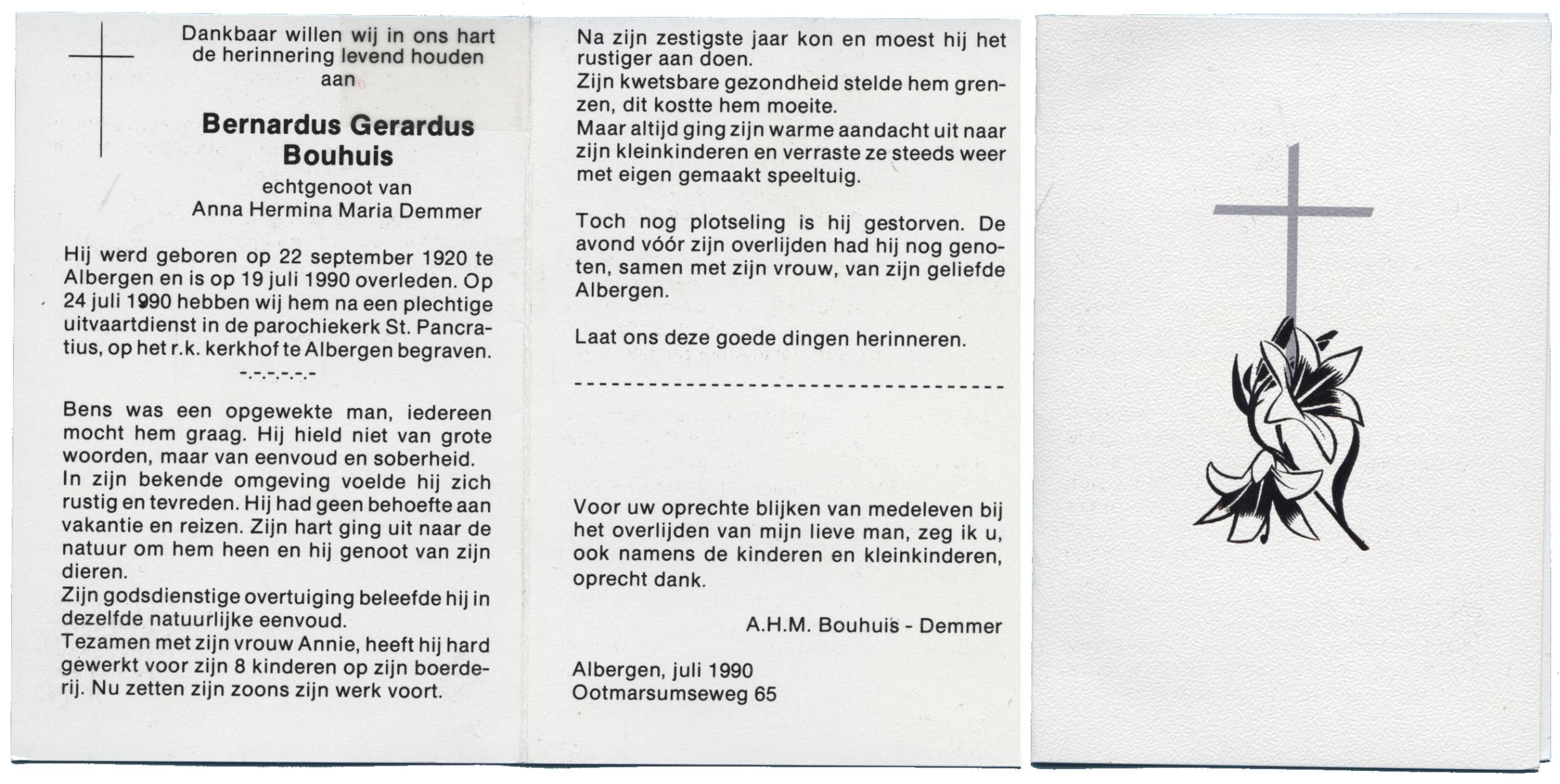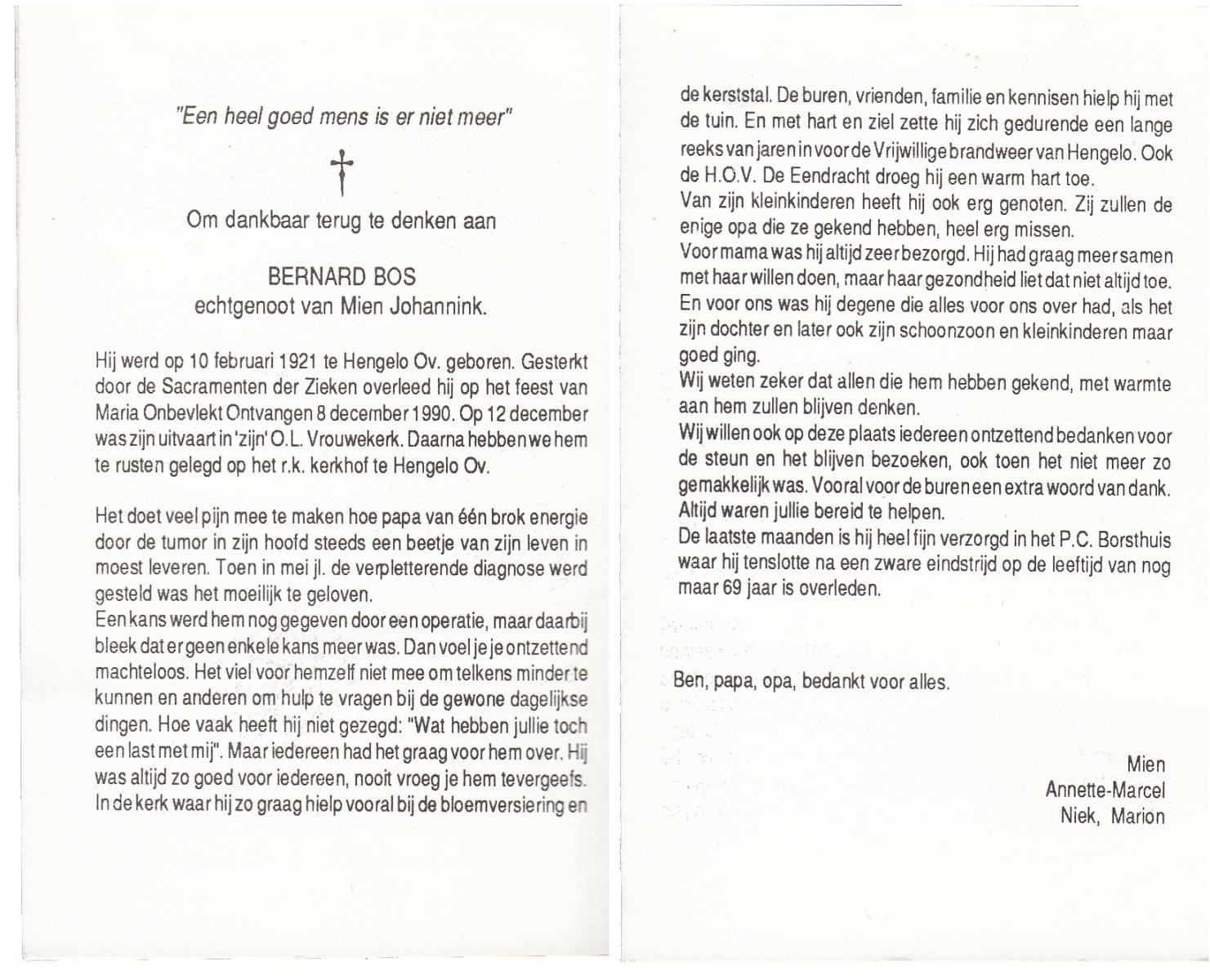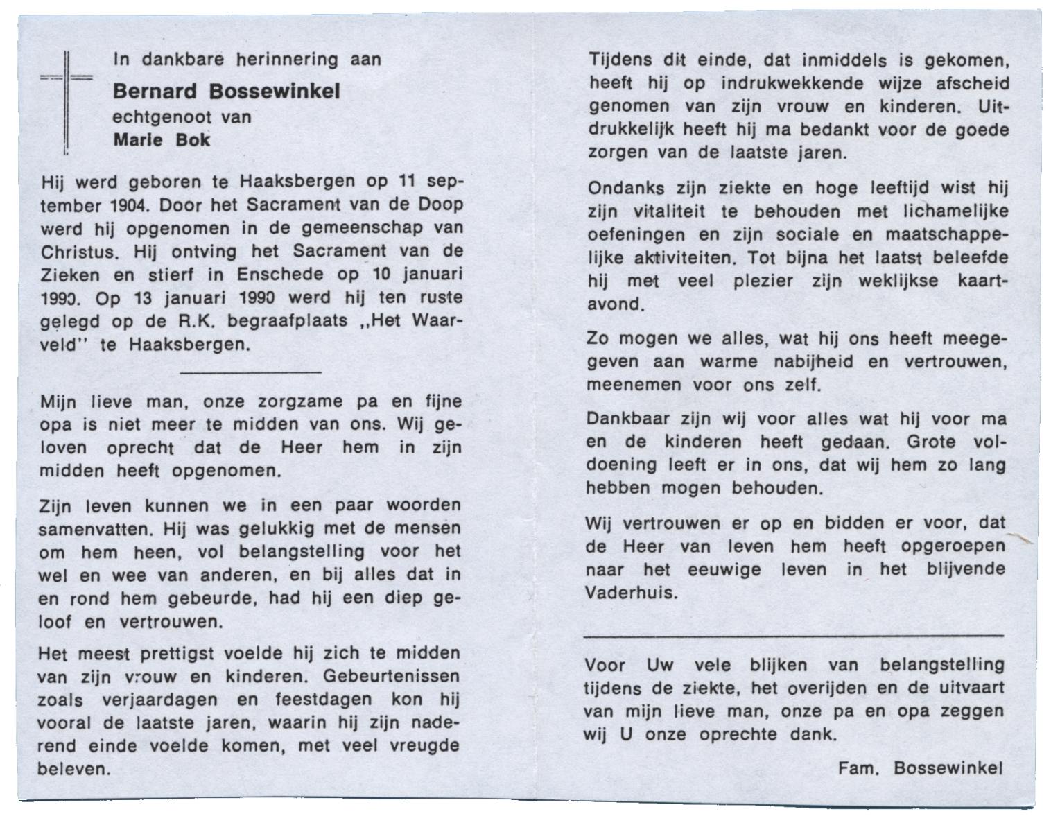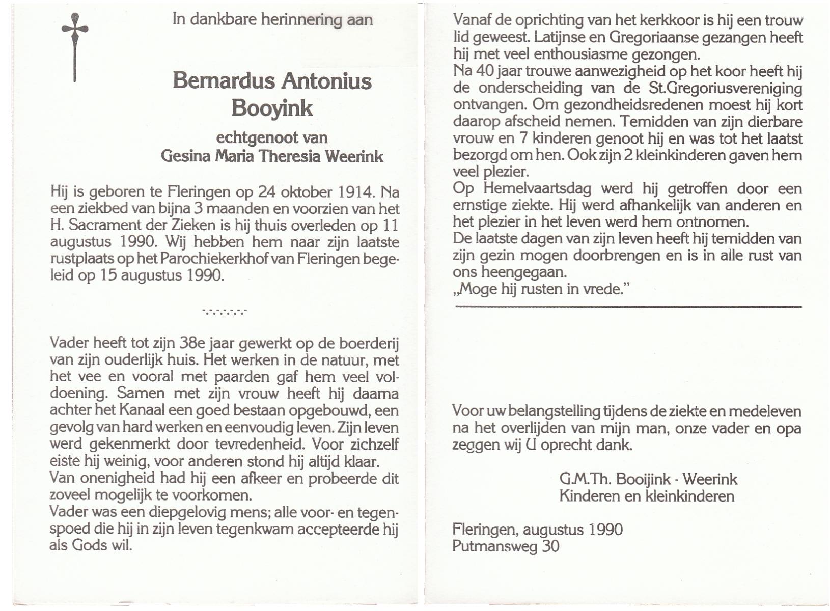 BOOYINK, Bernardus Antonius, geboren op 24-10-1914 te Fleringen, overleden op 11-8-1990 te Fleringen op 75-jarige leeftijd, begraven op 15-8-1990 te Fleringen.