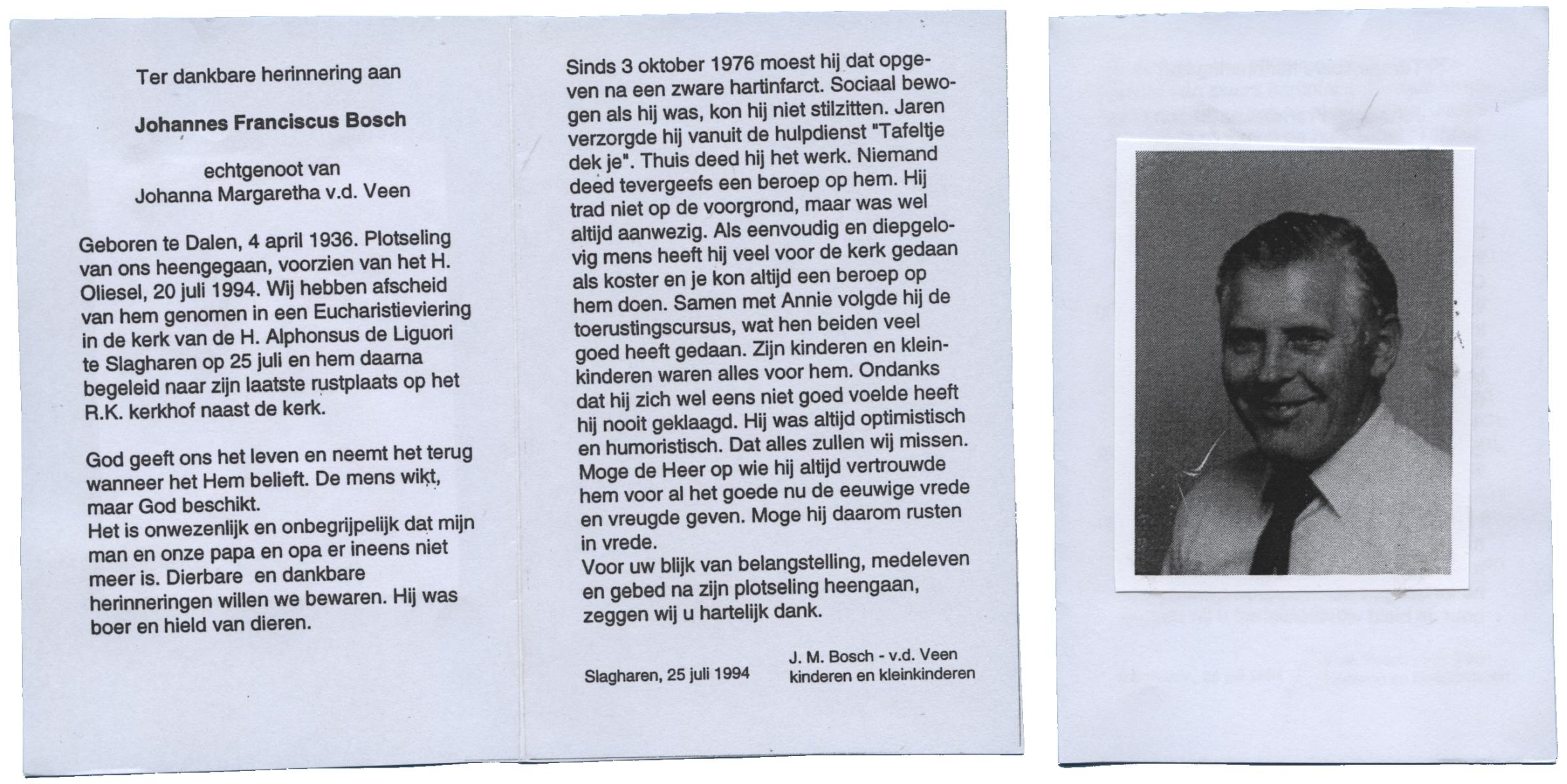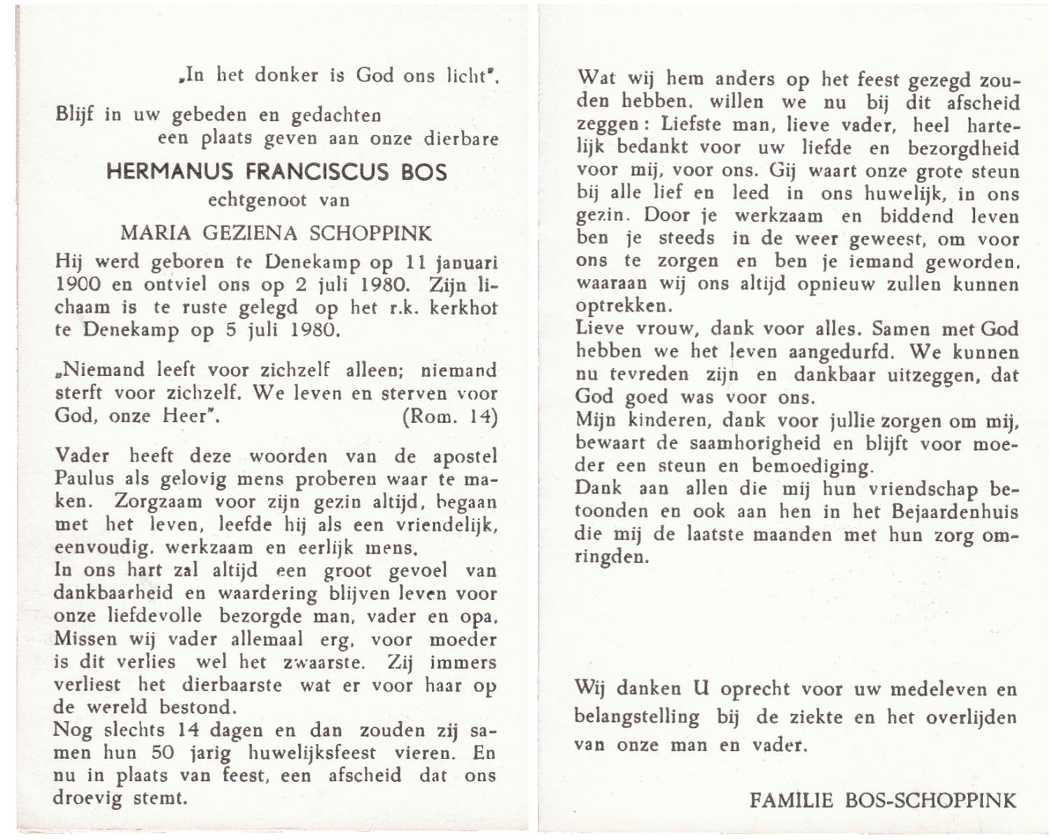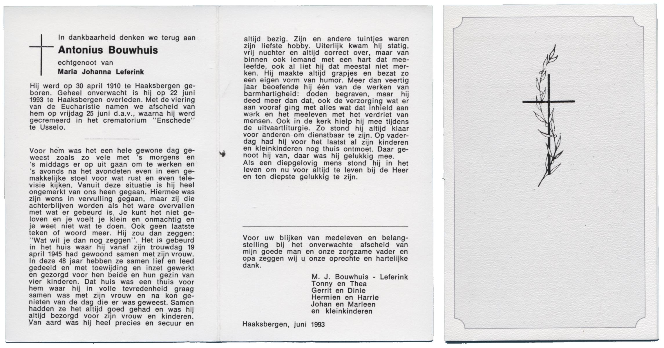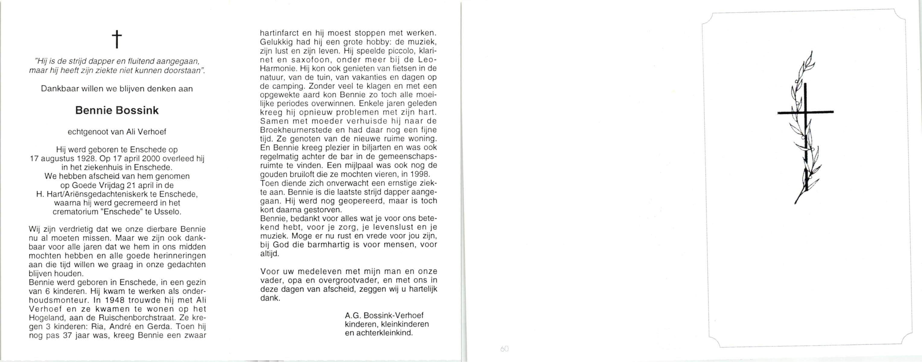 BOOYINK, Bernardus Antonius, geboren op 24-10-1914 te Fleringen, overleden op 11-8-1990 te Fleringen op 75-jarige leeftijd, begraven op 15-8-1990 te Fleringen.