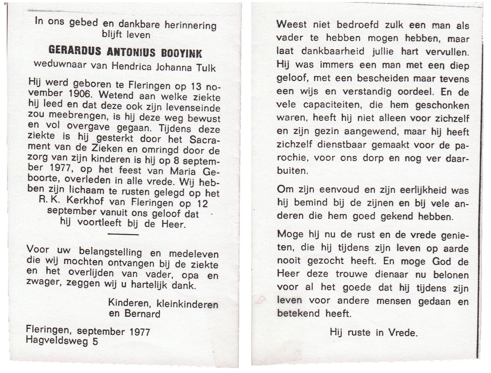 BOOYINK, Gerardus Antonius, geboren op 13-11-1906 te Fleringen, overleden op 8-9-1977 op 70-jarige leeftijd, begraven op 12-9-1977 te Fleringen.