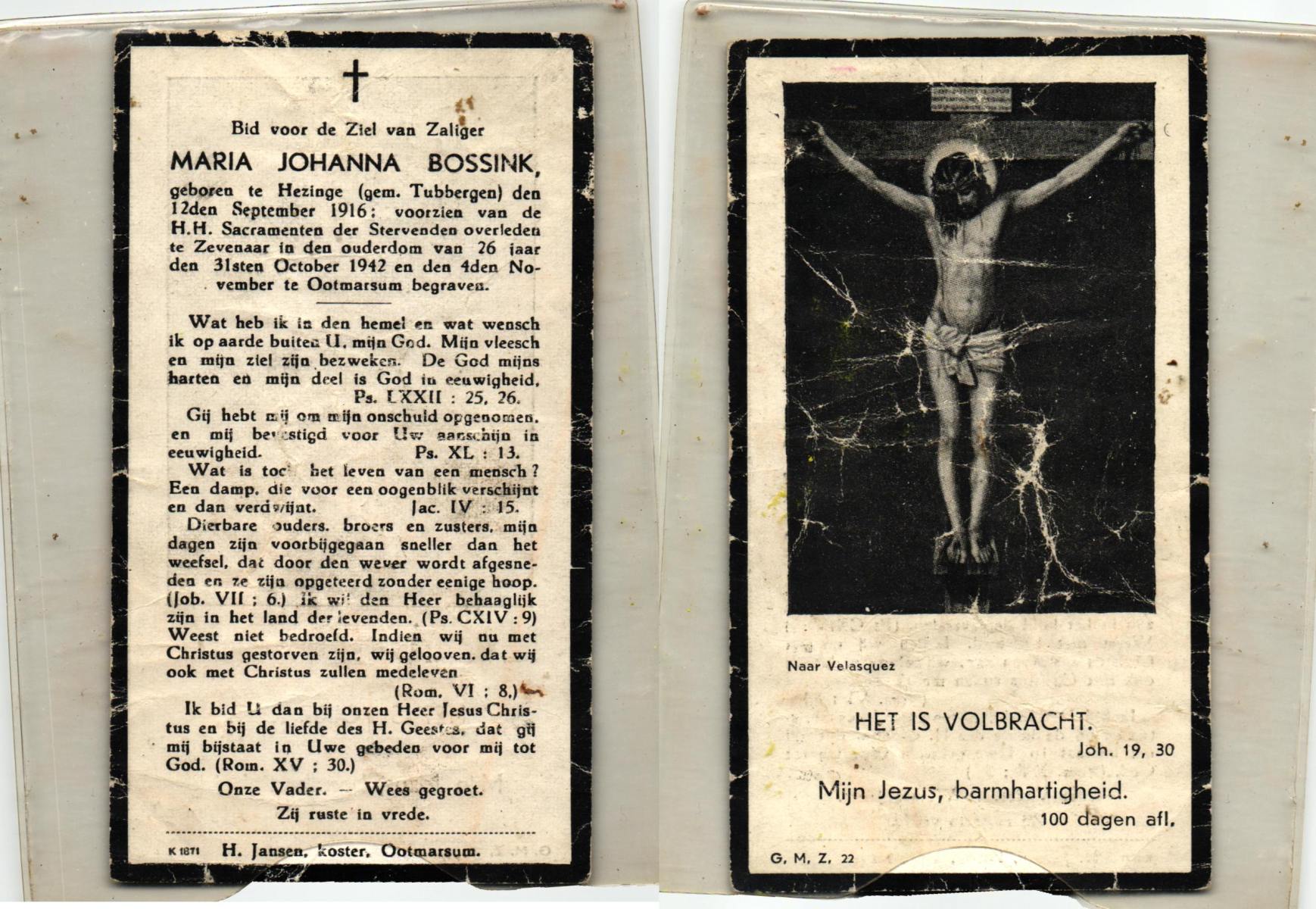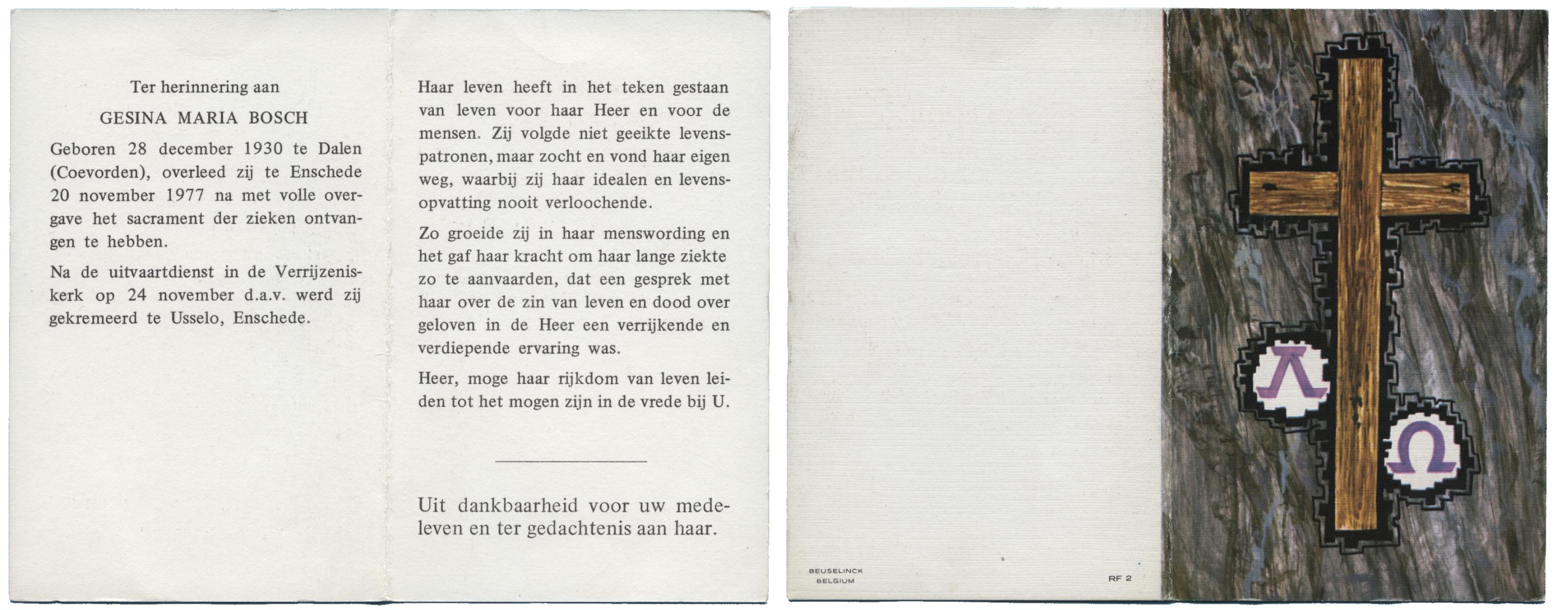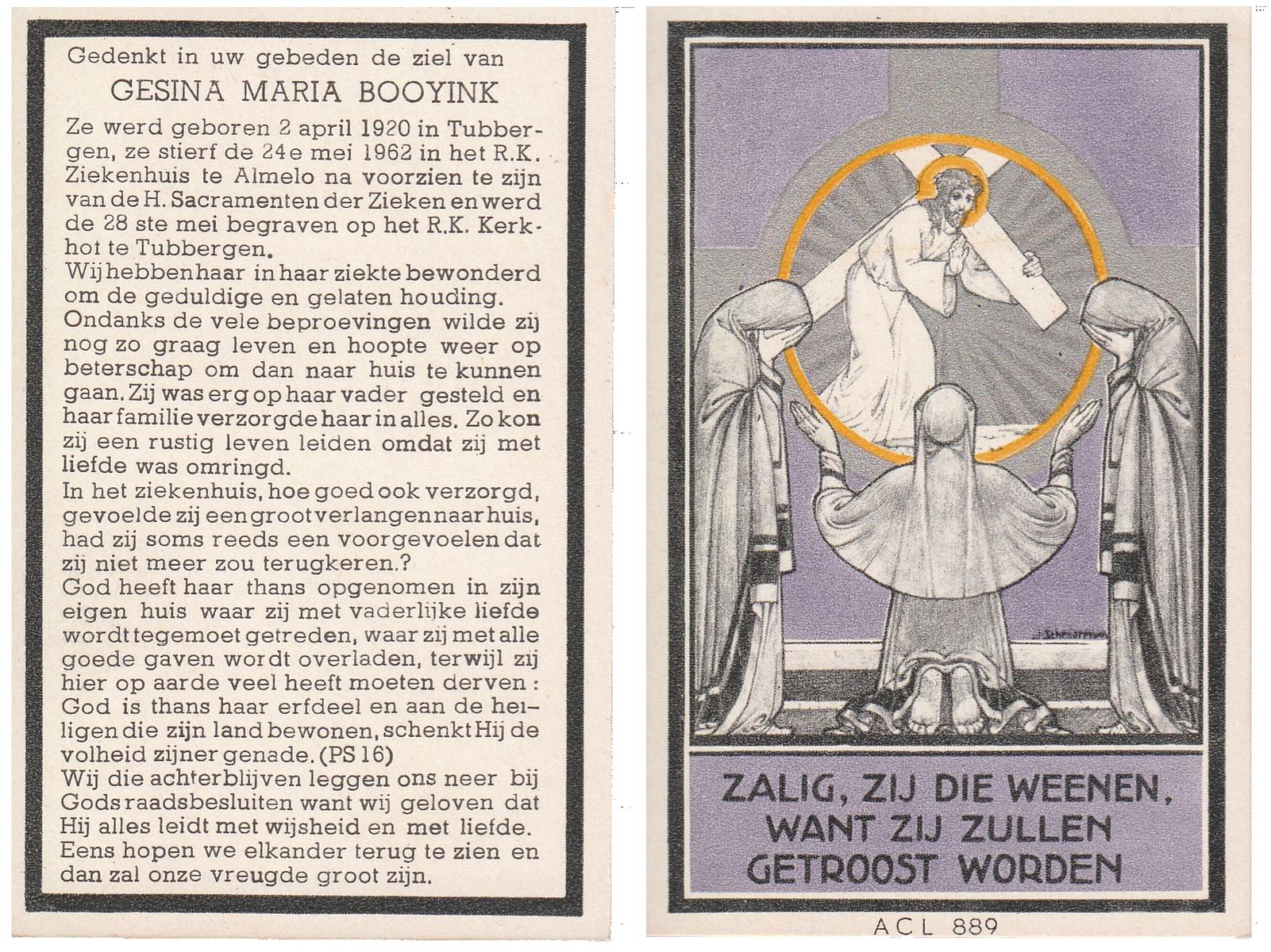 BOOYINK, Gesina Maria, geboren op 2-4-1920 te Tubbergen, overleden op 24-5-1962 te Almelo op 42-jarige leeftijd, begraven op 28-5-1962 te Tubbergen.