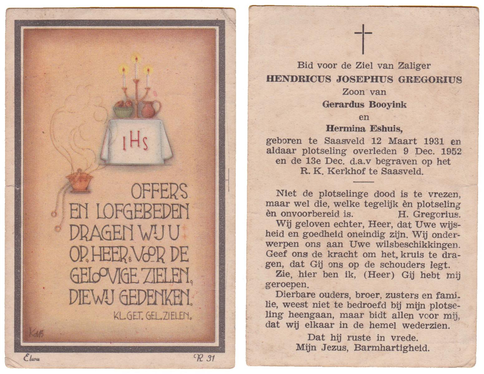BOOYINK, Hendrikus Josephus Gregorius, geboren op 12-3-1931 te Saasveld, overleden op 9-12-1952 te Saasveld op 21-jarige leeftijd, begraven op 13-12-1952 te Saasveld.