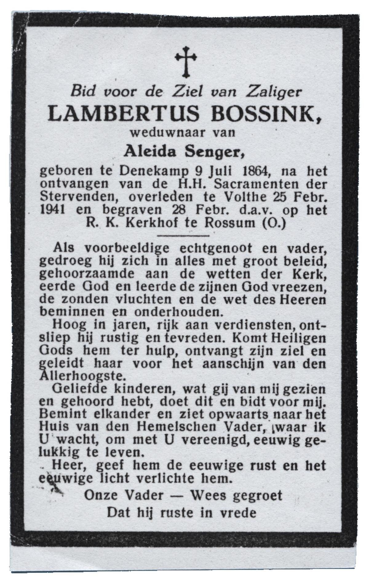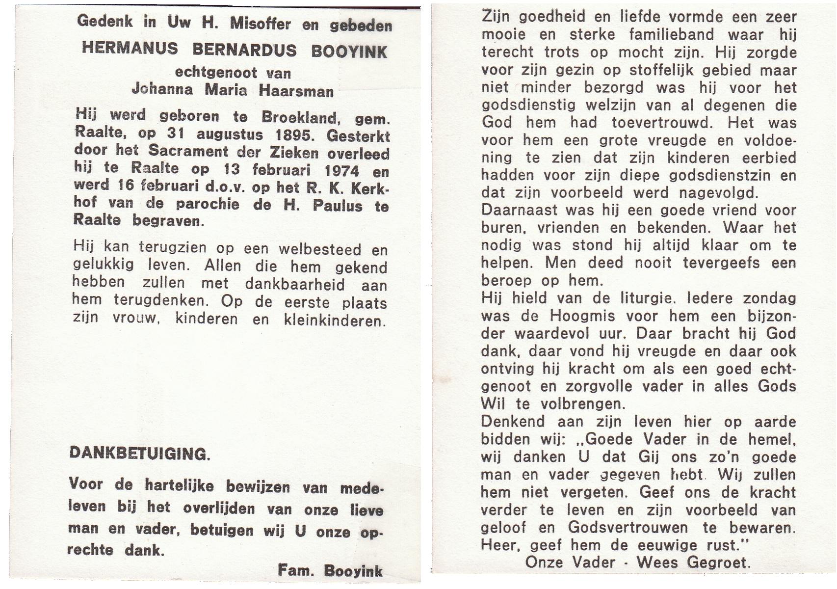 BOOYINK, Hermanus Bernardus, geboren op 31-08-1895 te Broekland, overleden op 13-2-1974 te Raalte op 78-jarige leeftijd, begraven op 16-2-1974 te Raalte.