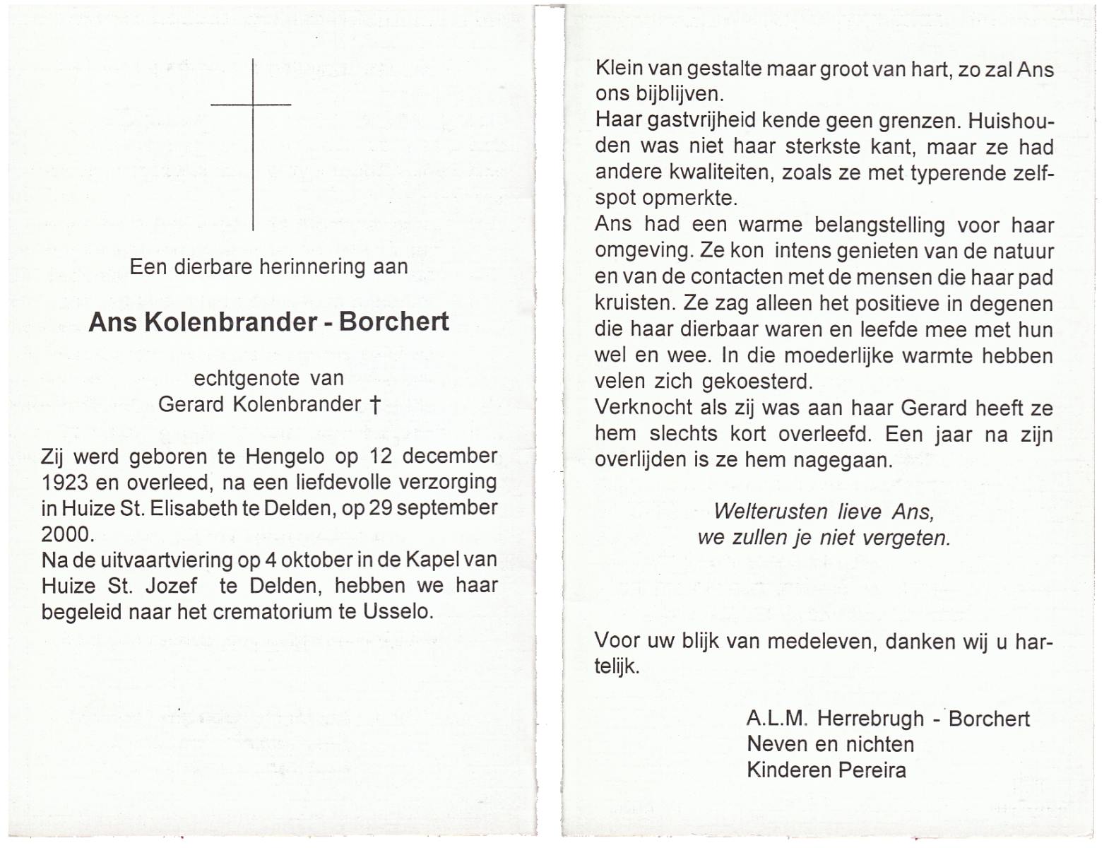 BORCHERT, Ans, geboren op 12-12-1923 te Hengelo (O), overleden op 29-9-2000 te Delden op 76-jarige leeftijd, gecremeerd op 4-10-2000 te Usselo.