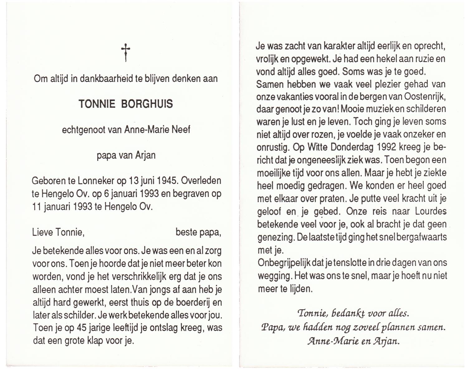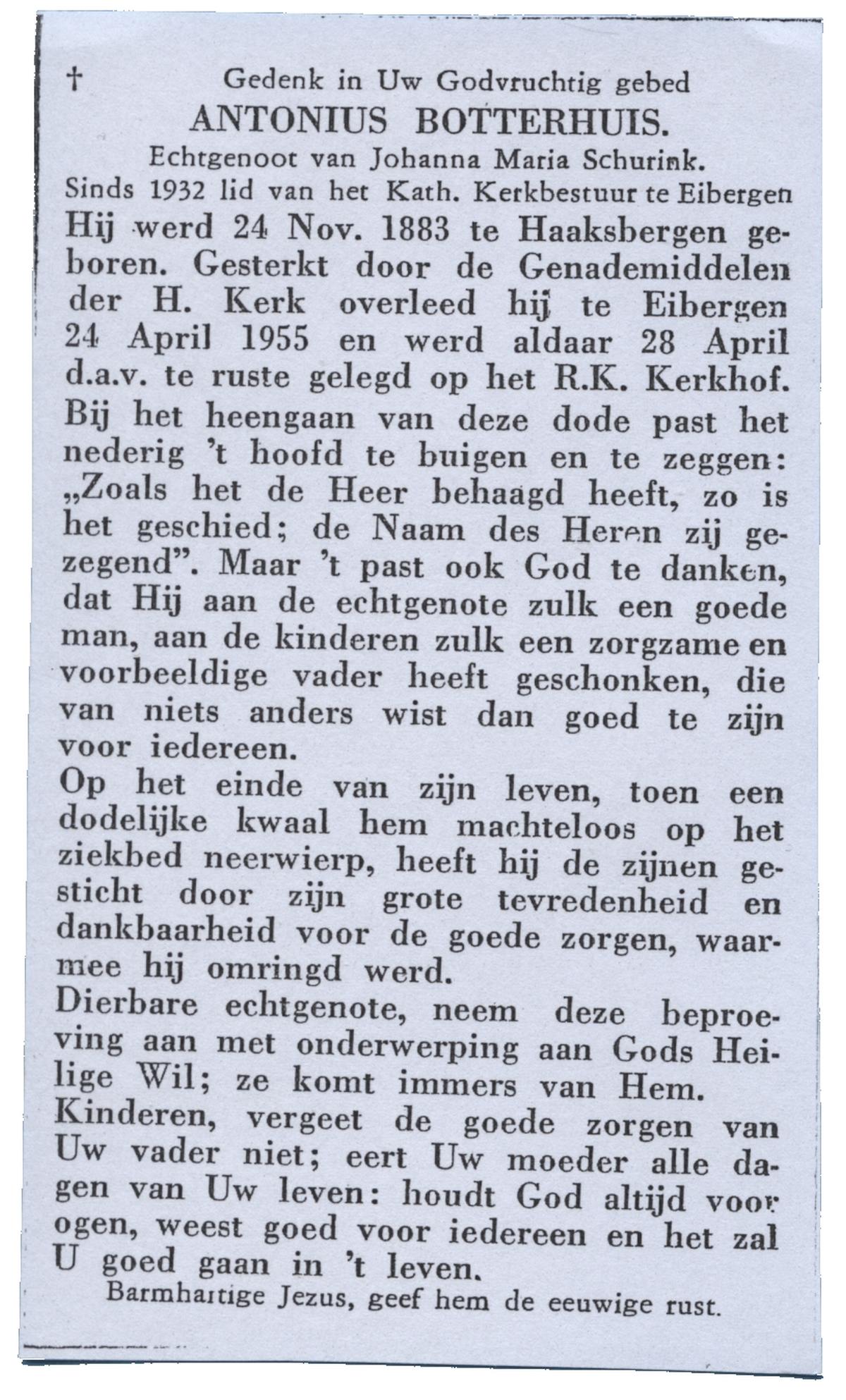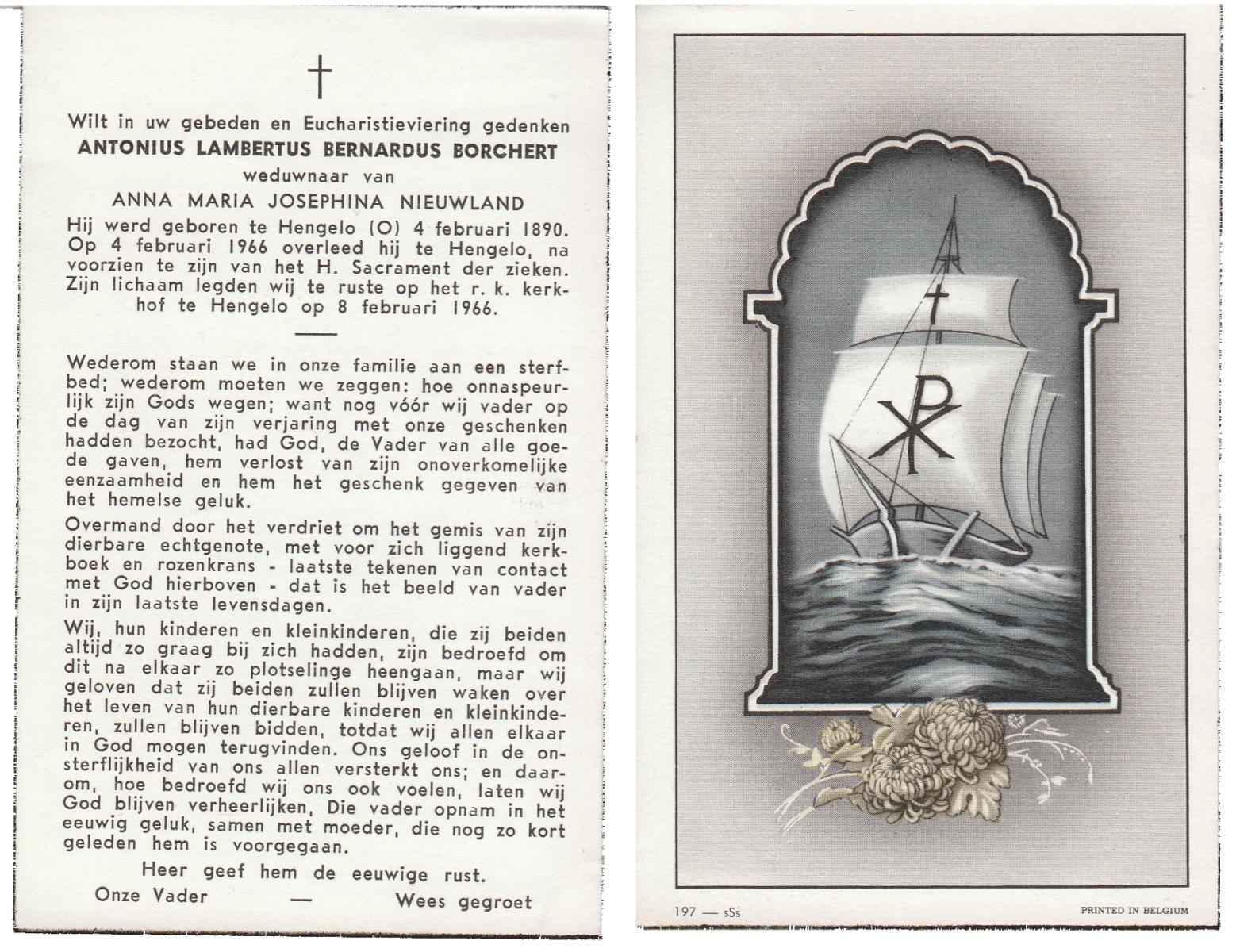 BORCHERT, Antonius Lambertus Bernardus, geboren op 04-02-1890 te Hengelo (O), overleden op 4-2-1966 te Hengelo (Ov.) op 76-jarige leeftijd, begraven op 8-2-1966 te Hengelo (Ov.).
