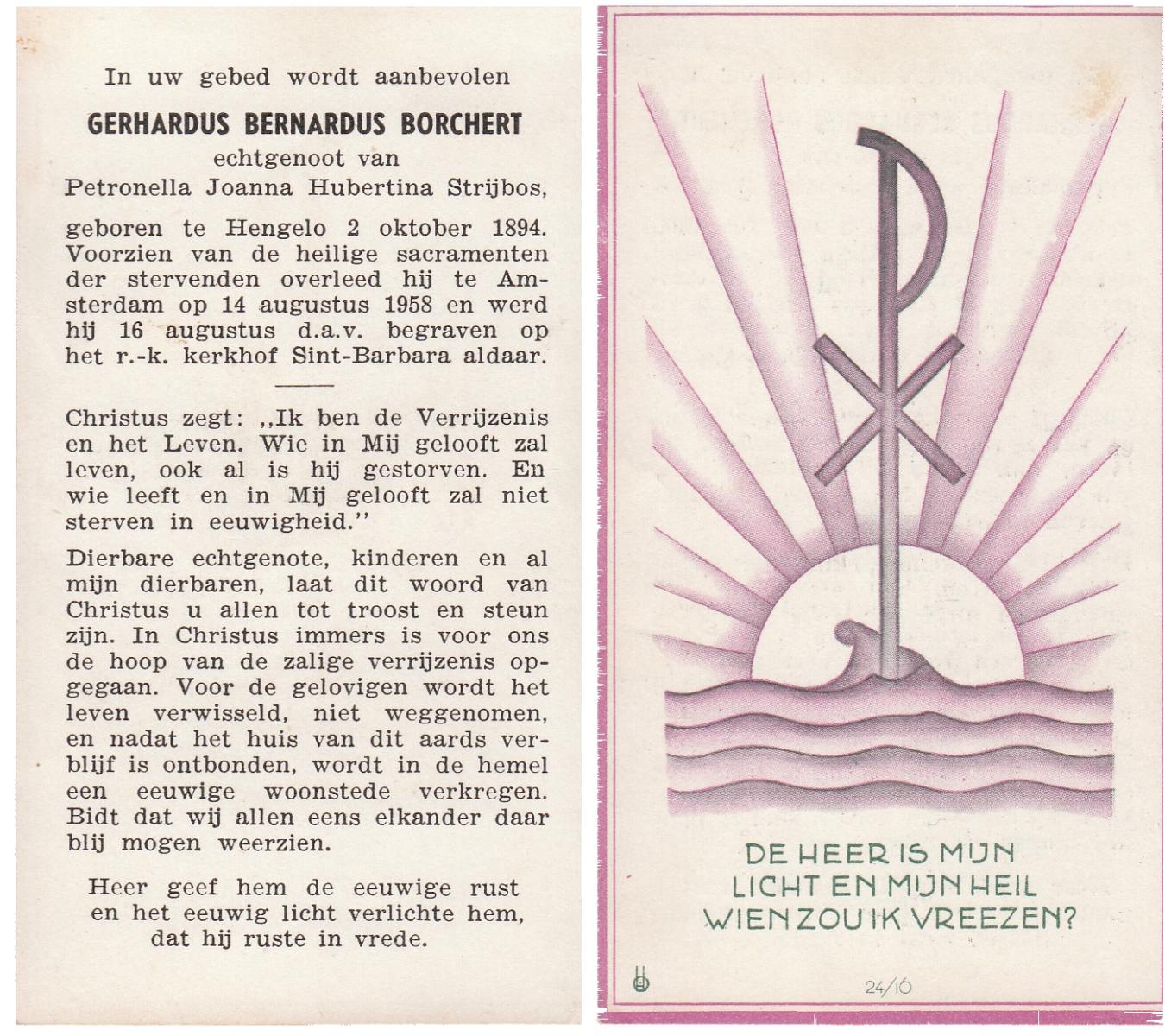 BORCHERT, Gerhardus Bernardus, geboren op 02-10-1894 te Hengelo (O), overleden op 14-8-1958 te Amsterdam op 63-jarige leeftijd, begraven op 16-8-1958 te Amsterdam.