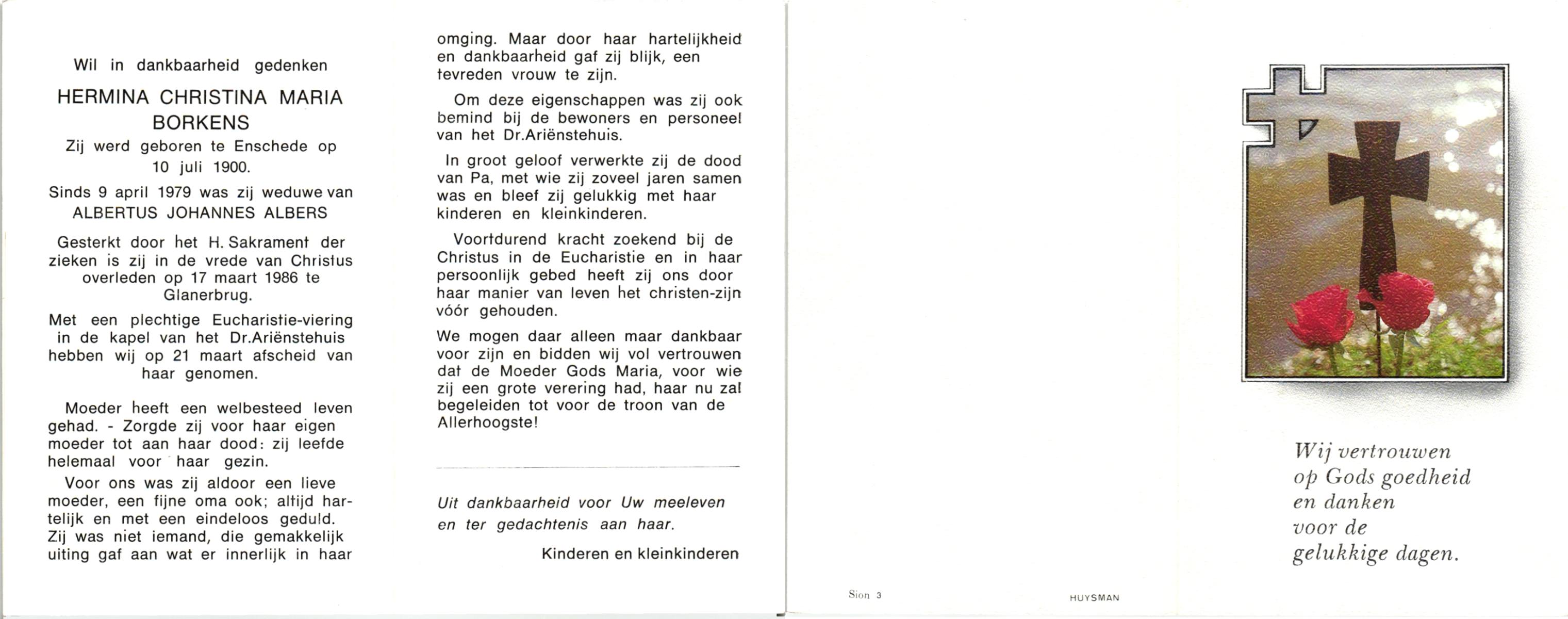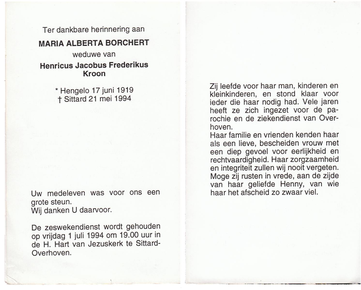 BORCHERT, Maria Alberta, geboren op 17-6-1919 te Hengelo (O), overleden op 21-5-1994 te Sittard op 74-jarige leeftijd.