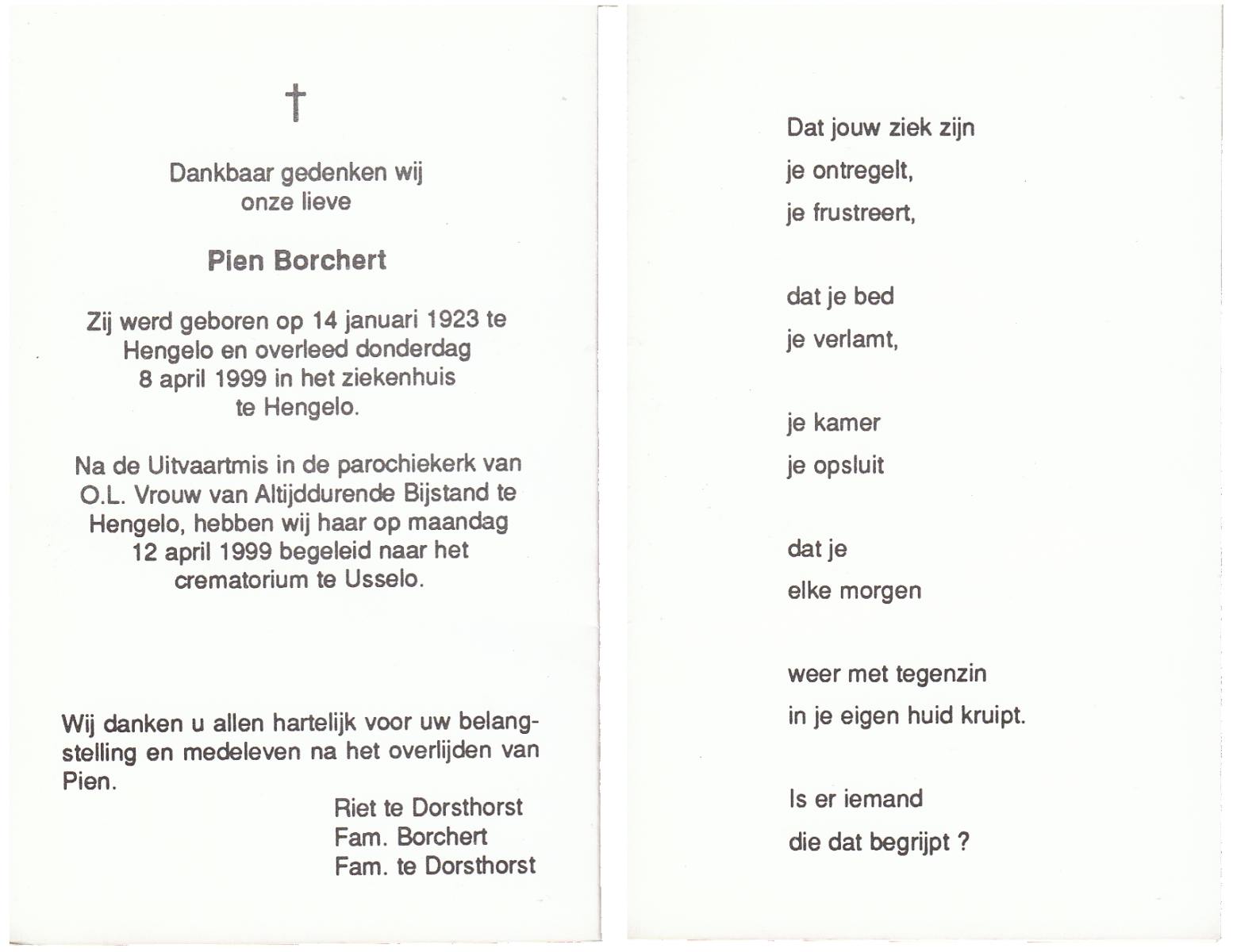 BORCHERT, Pien, geboren op 14-1-1923 te Hengelo (O), overleden op 8-4-1999 te Hengelo (Ov.) op 76-jarige leeftijd, gecremeerd op 12-4-1999 te Usselo.