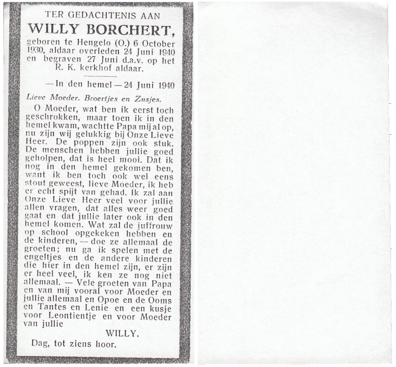 BORCHERT, Willy, geboren op 6-10-1930 te Hengelo (O), overleden op 24-6-1940 te Hengelo (Ov.) op 9-jarige leeftijd, begraven op 27-6-1940 te Hengelo (Ov.).