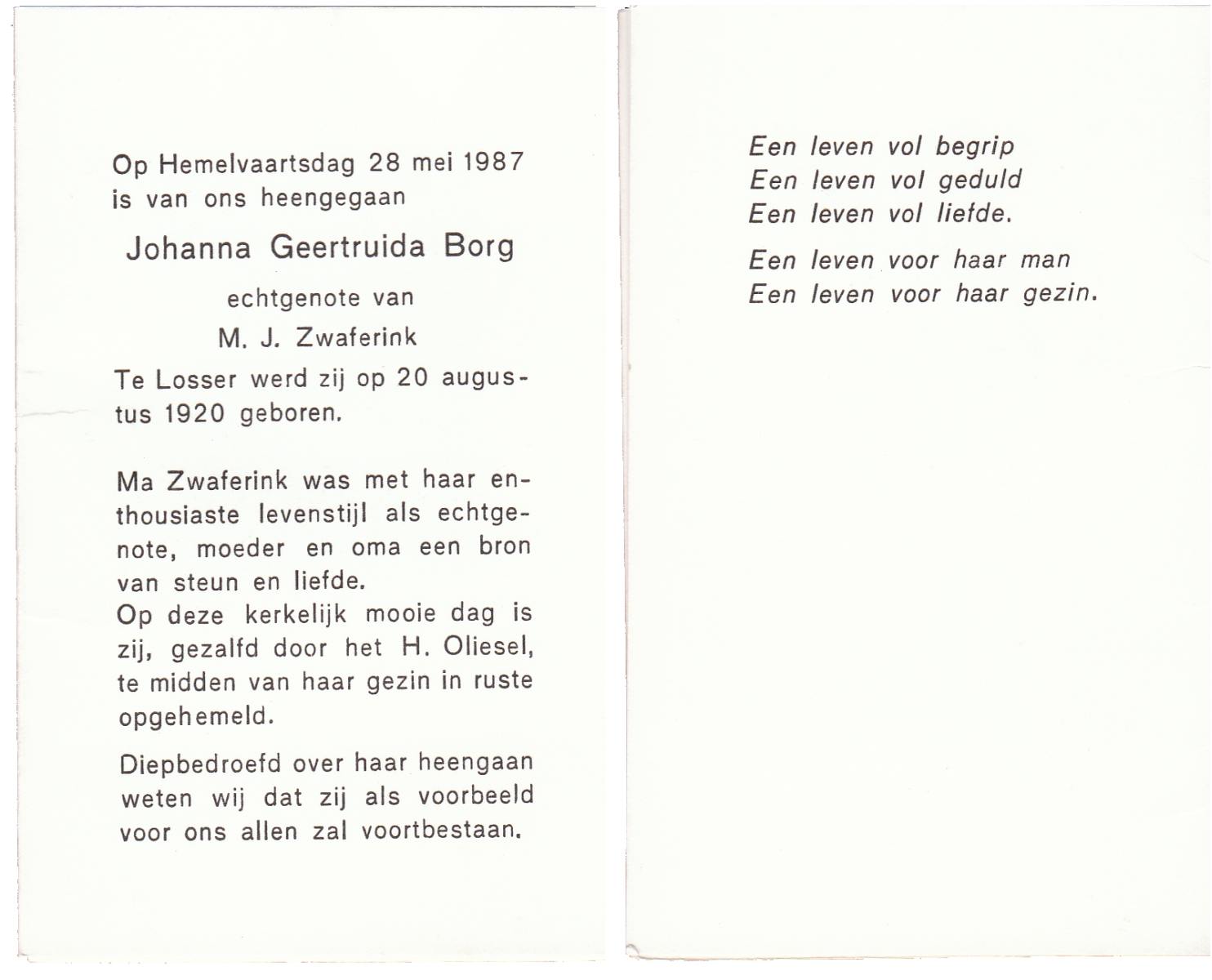 BORG, Johanna Geertruida, geboren op 20-8-1920 te Losser, overleden op 28-5-1987 op 66-jarige leeftijd.