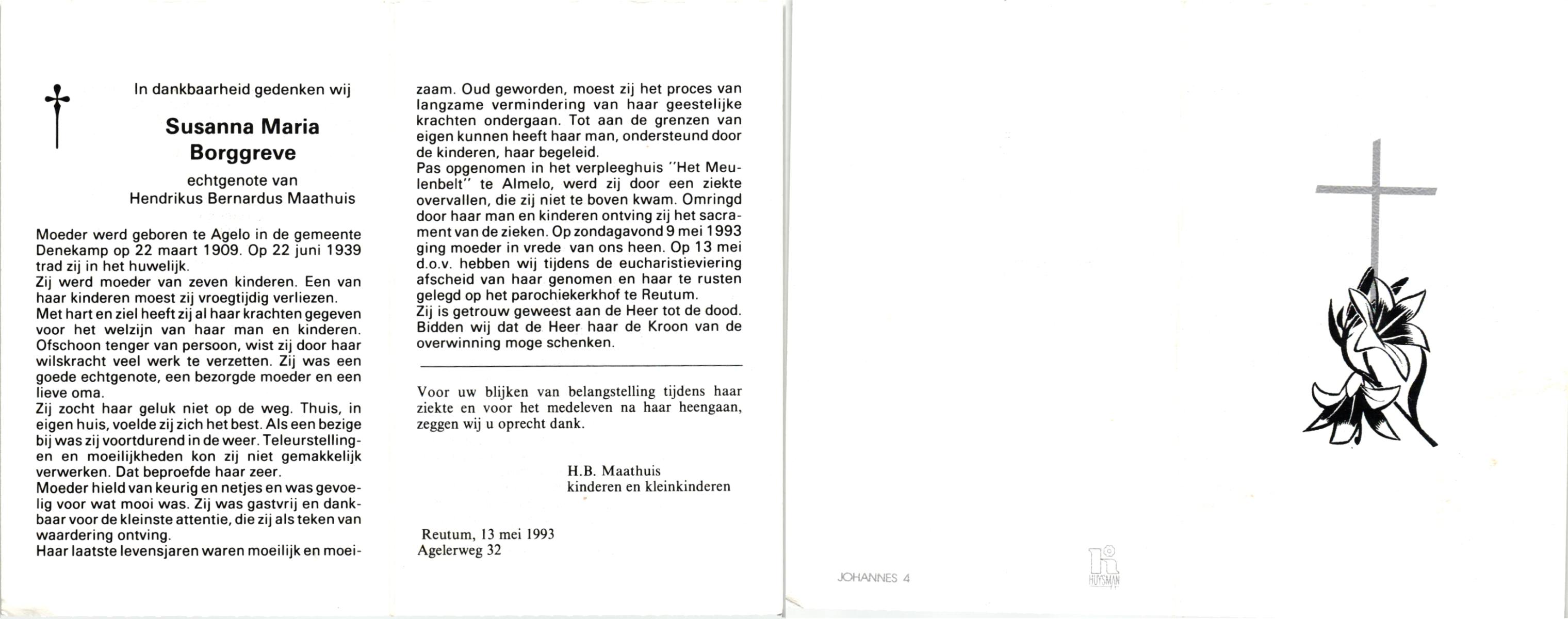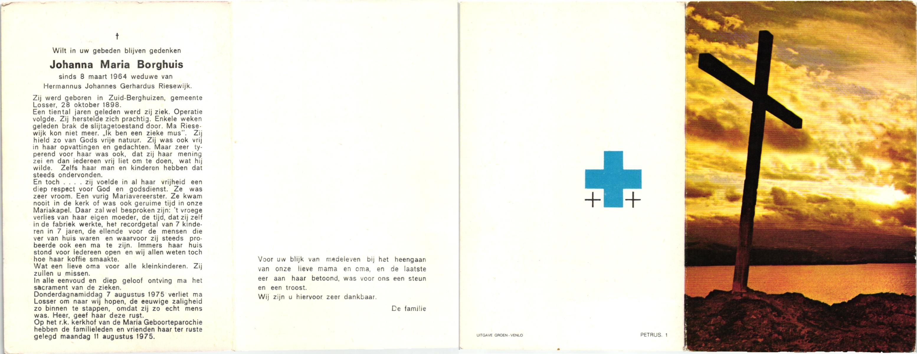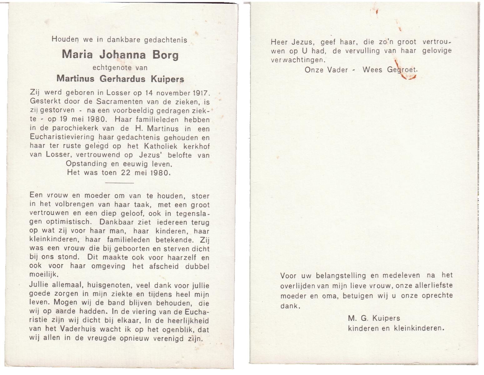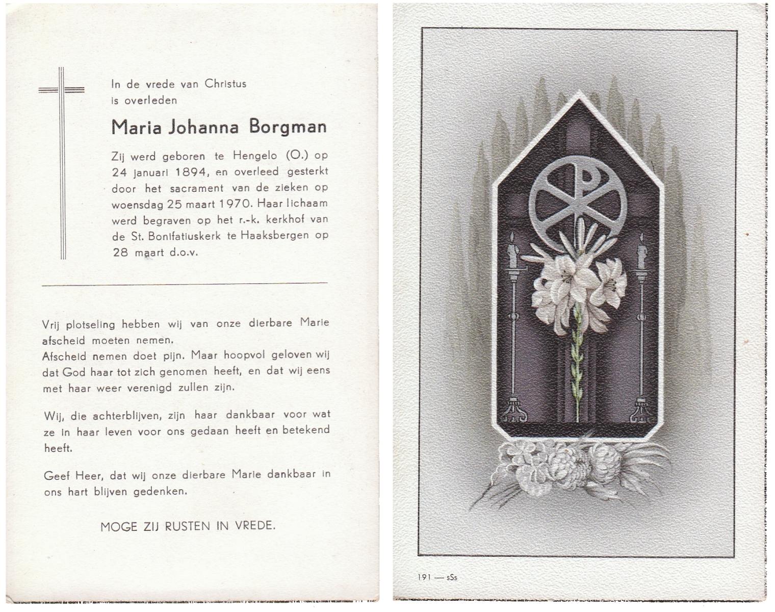 BORG, Maria Johanna, geboren op 14-11-1917 te Losser, overleden op 19-5-1980 op 62-jarige leeftijd, begraven op 22-5-1980 te Losser.