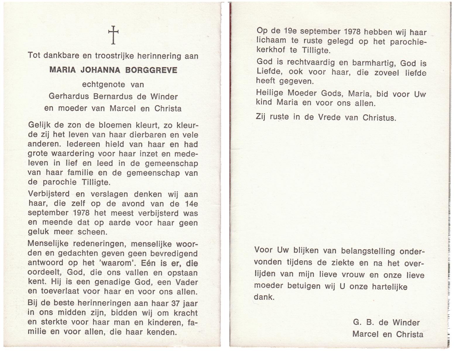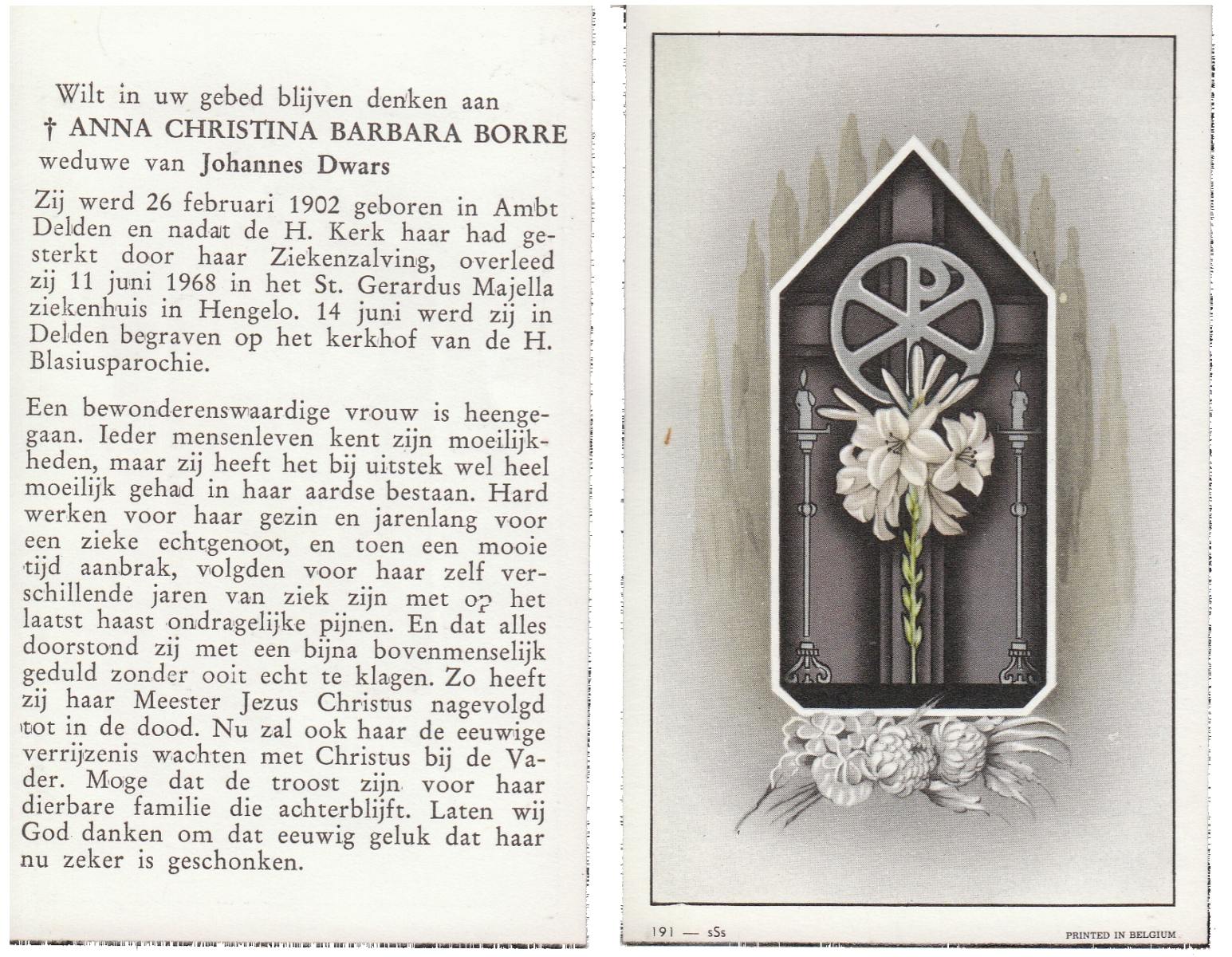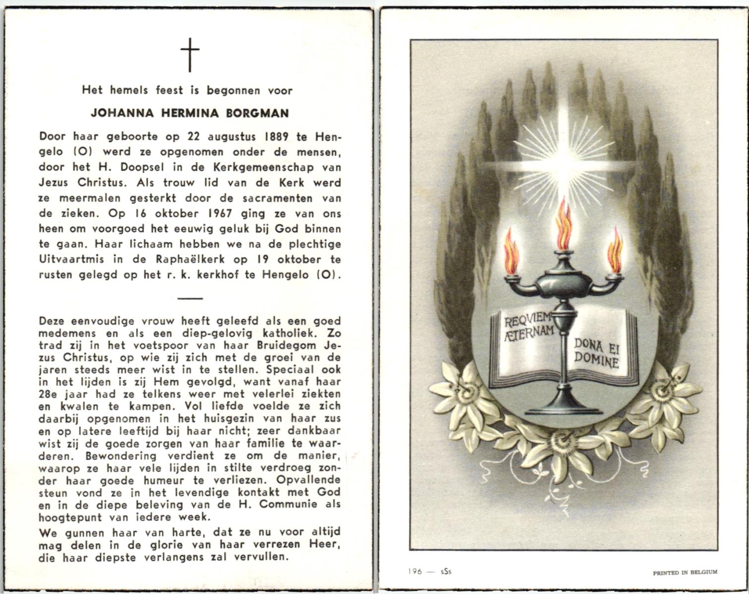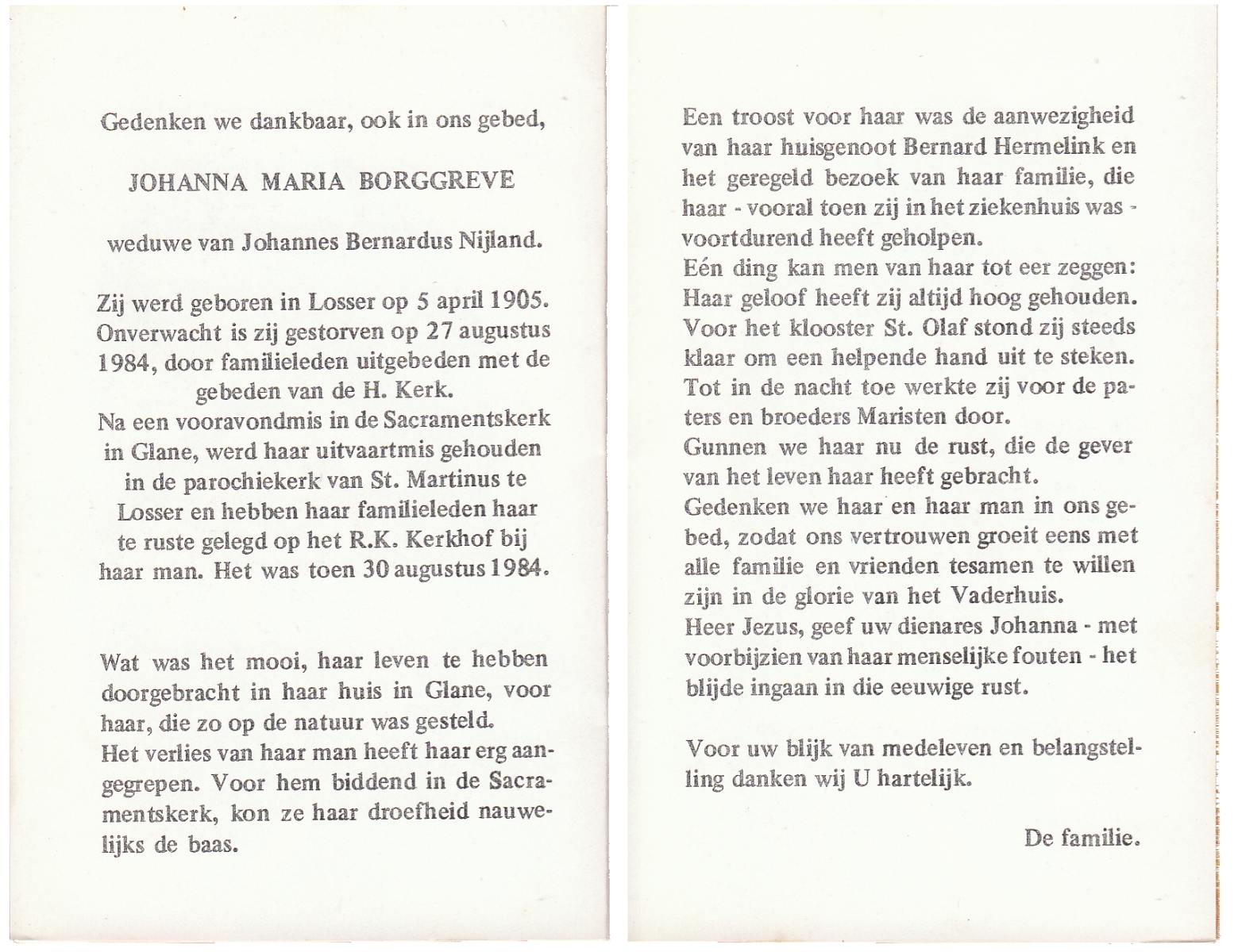 BORG, Maria Johanna, geboren op 14-11-1917 te Losser, overleden op 19-5-1980 op 62-jarige leeftijd, begraven op 22-5-1980 te Losser.