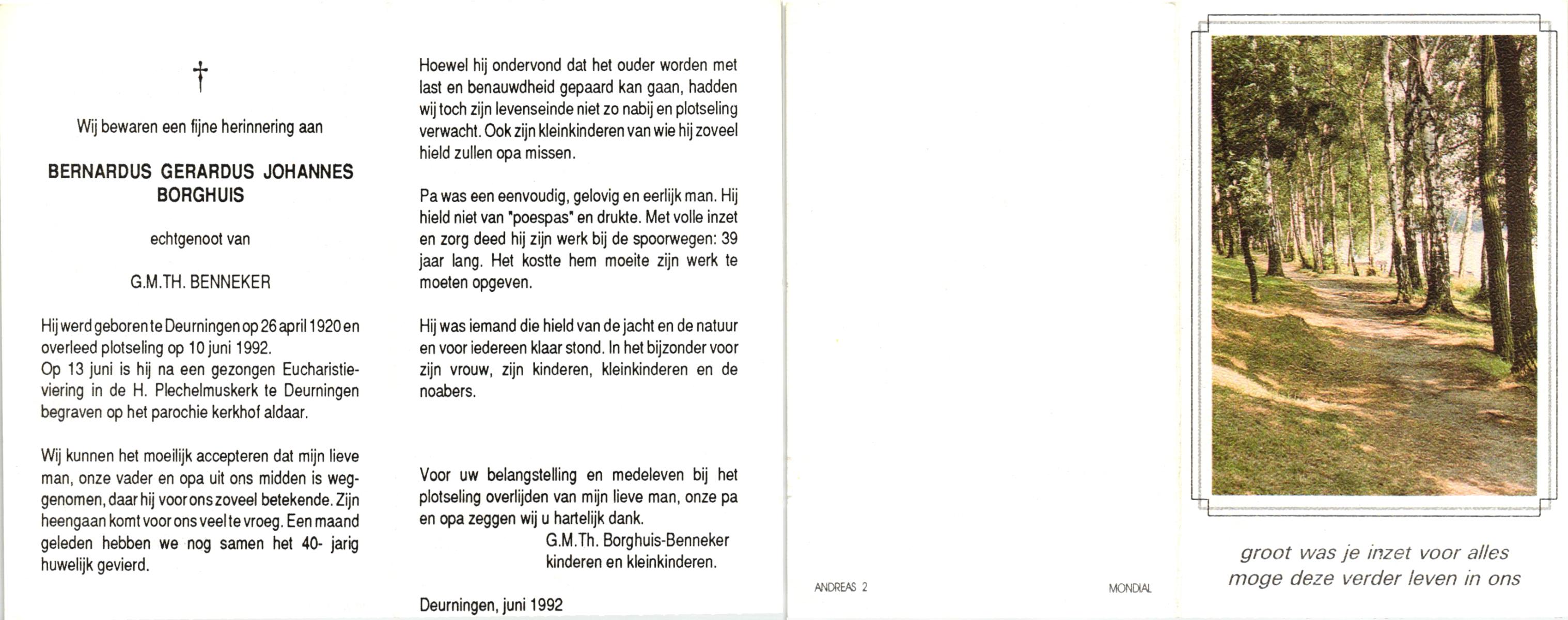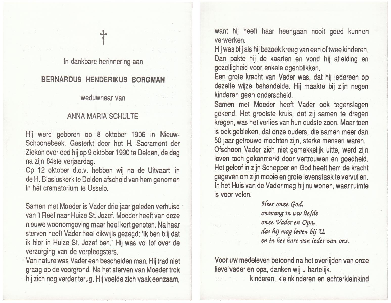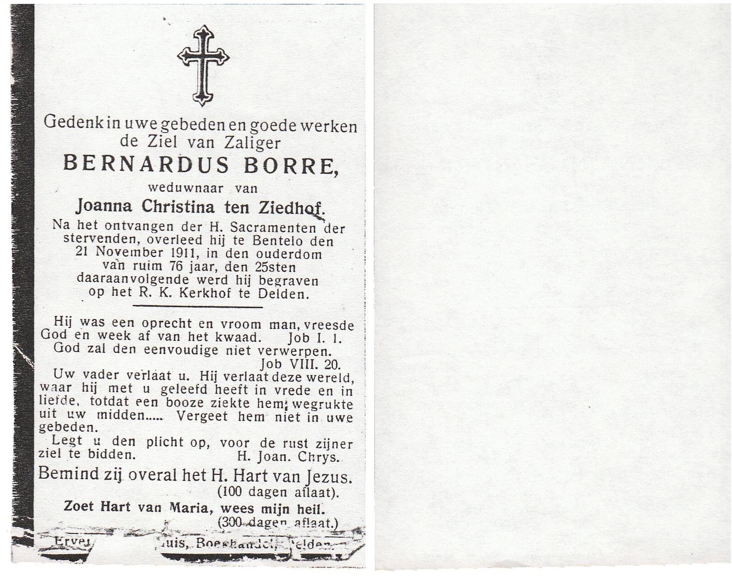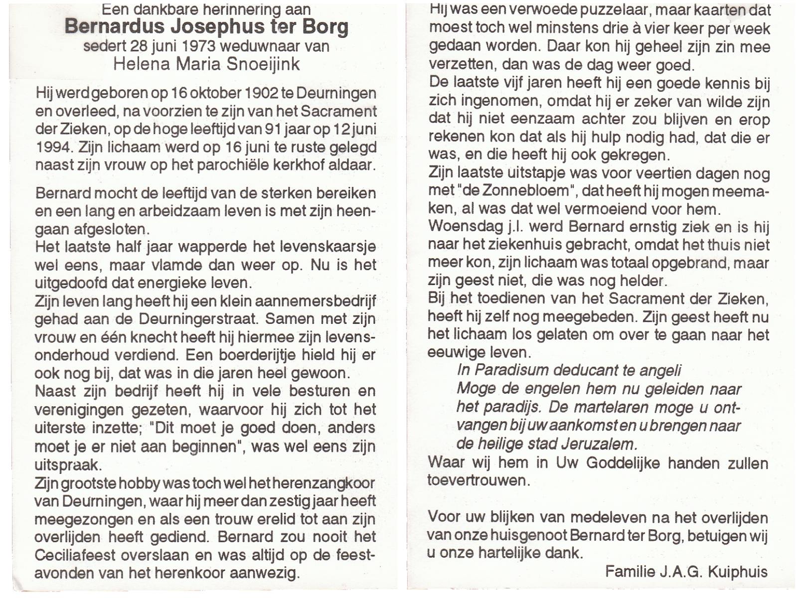 BORG, ter, Bernardus Josephus, geboren op 16-10-1902 te Deurningen, overleden op 12-6-1994 op 91-jarige leeftijd, begraven op 16-6-1994.